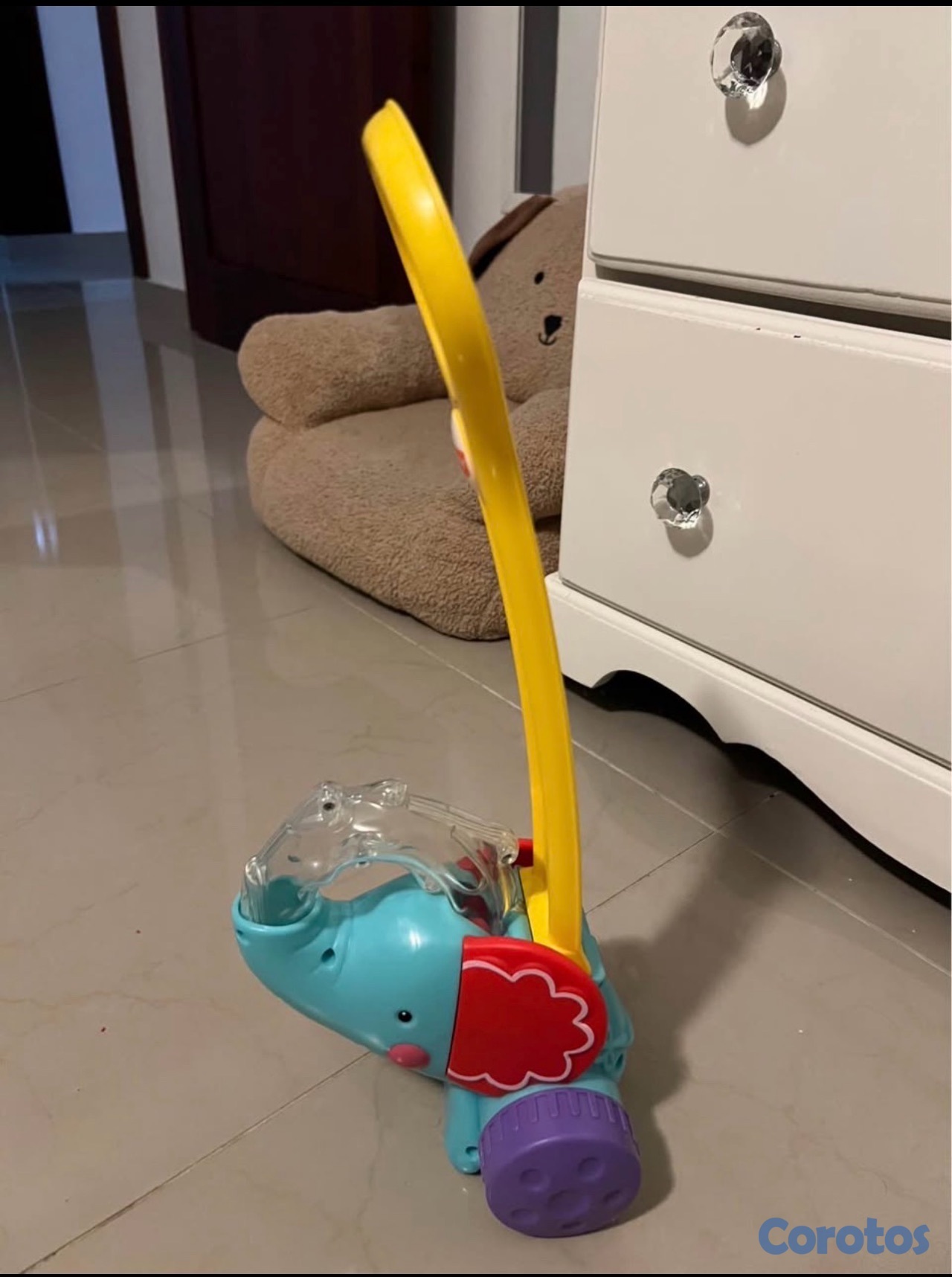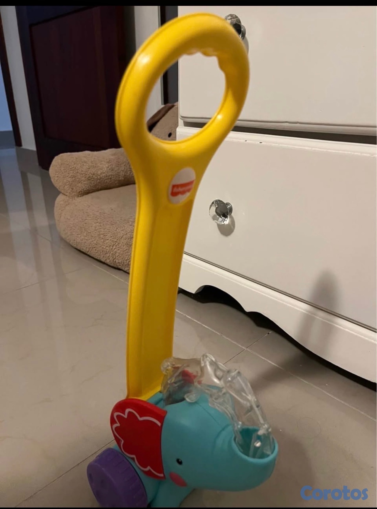 Característica principal: Las coloridas pelotas saltan y giran dentro de la trompa del elefante a medida que el niño lo empuja.