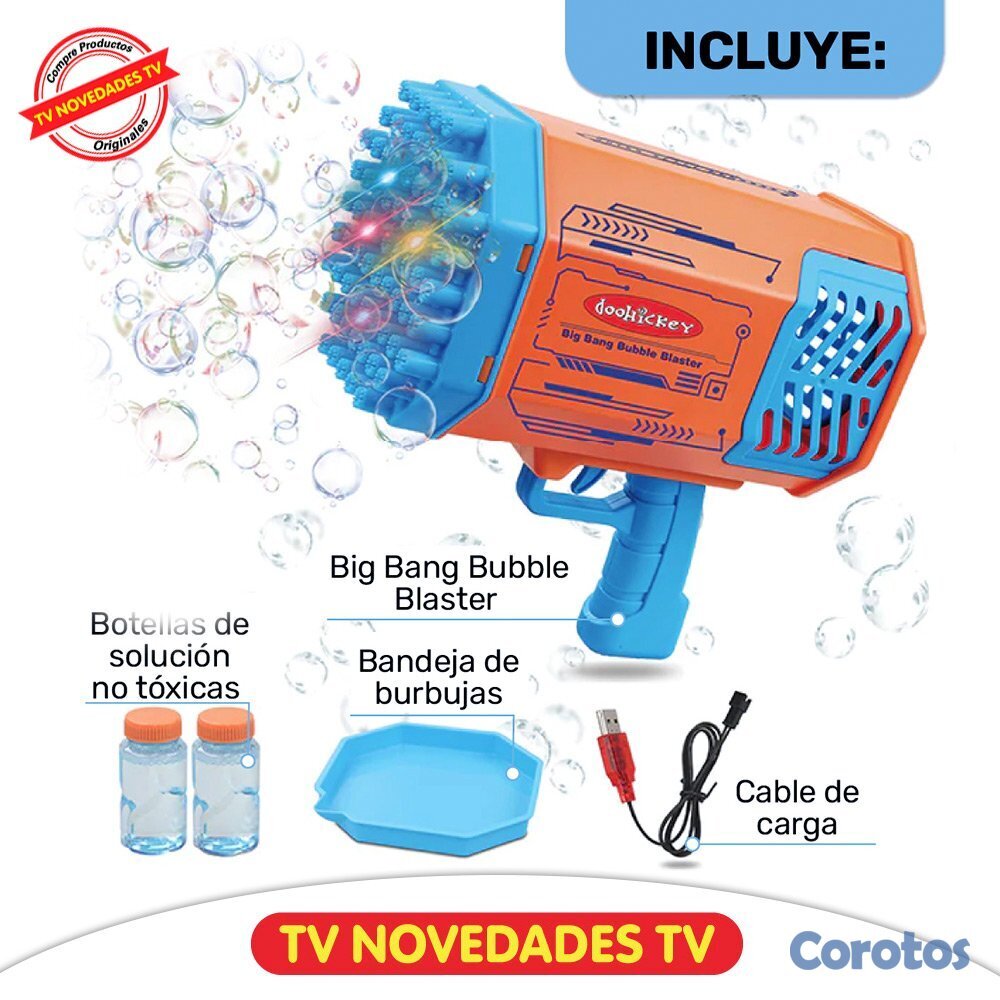 Este divertido juguete permite que tus niños disfruten de momentos increíbles y sanos de una manera diferente y segura. Podrás ver como cientos de burbujas de colores son expulsadas al aire desde las múltiples boquillas del Bubble Blaster. Solo agrega la solución y con solo oprimir un botón comenzarás a disfrutar de una fiesta de burbujas arcoíris, que en las noches se convierte en un verdadero espectáculo. Además este juguete es recargable para que lo uses las veces que quieras en compañía de tu familia y amigos.