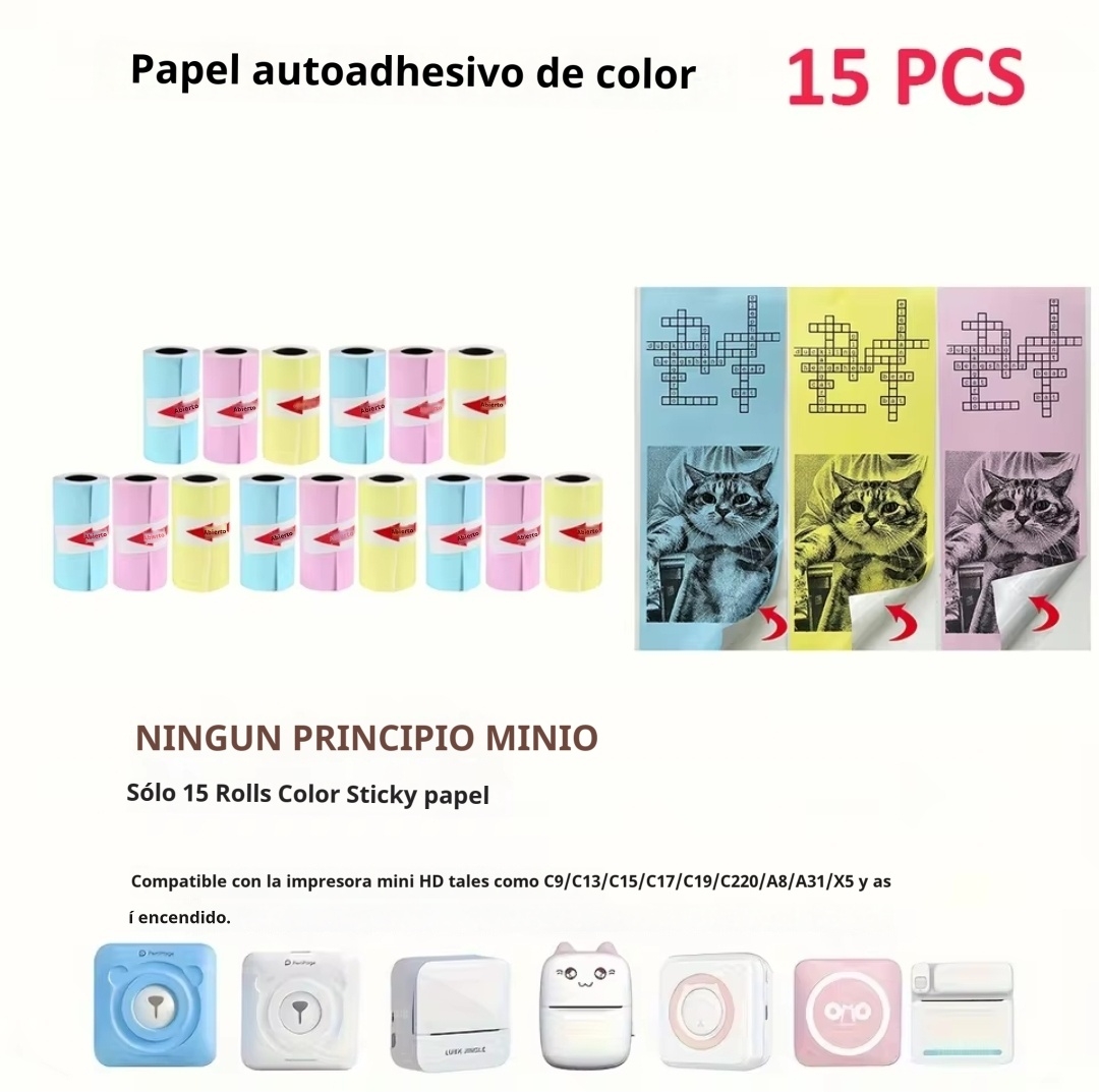 15 rollos papel adhesivo de colores para mini impresora termica Bluetooth.