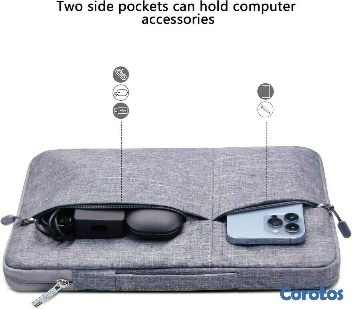 Dos bolsillos laterales adicionales, hacen que sea fácil llevar el teléfono móvil, cargador, mouse, auriculares, bolígrafos, etc.