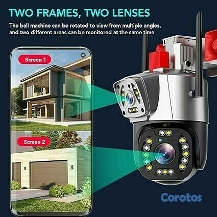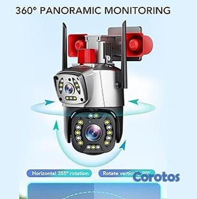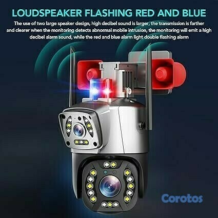 Al detectar movimientos anormales o intrusiones, la cámara emite alarmas de alto decibelio con luces de advertencia rojas y azules intermitentes.