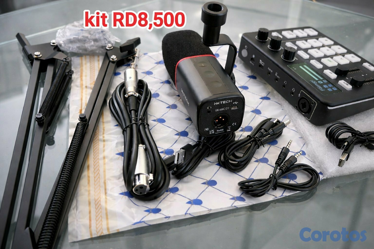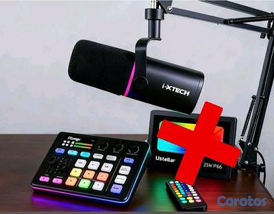 Micrófono de alta calidad, anti ruido, conexión XLR USB y consola de audio con todos sus cables, kit completo con su brazo