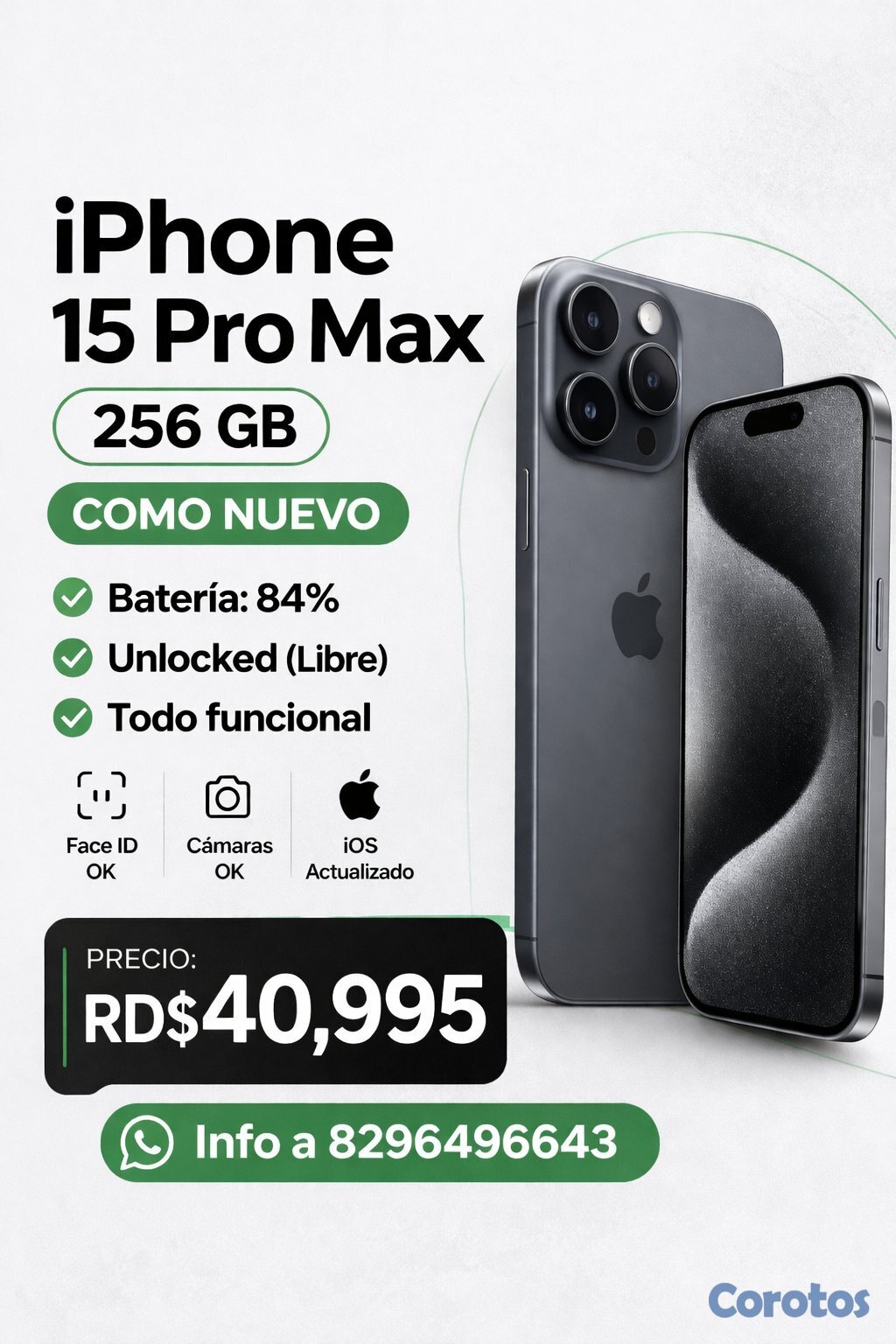 iPhone 15 Pro Max 256GB con 84% de batería, excelentes condiciones físicas, cover, cable original (esta viejito), se le otorgara cable nuevo adicional.