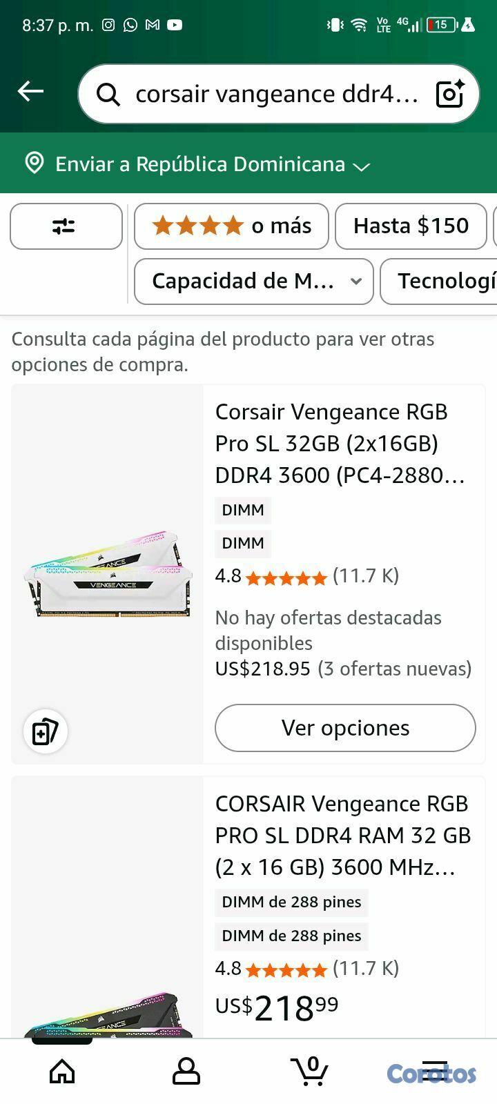 Vendo mis RAM'S: Corsair Vengeance RGB 32GB (2x16GB) DDR4 Pro SL
