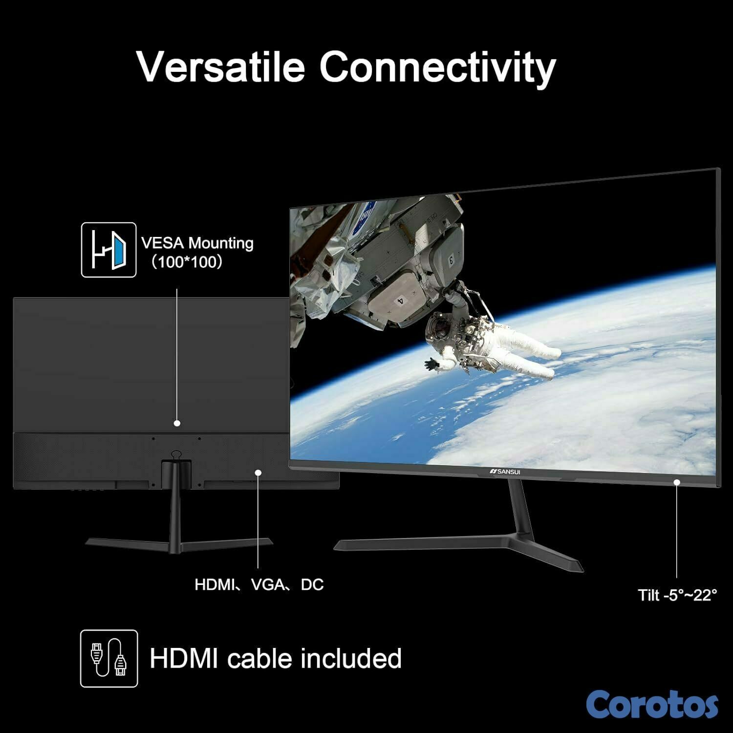 Interfaz: HDMI 1.4 y puertos VGA (cable HDMI incluido); montaje VESA de 100 × 3.937 in (sin altavoces y conector para auriculares)