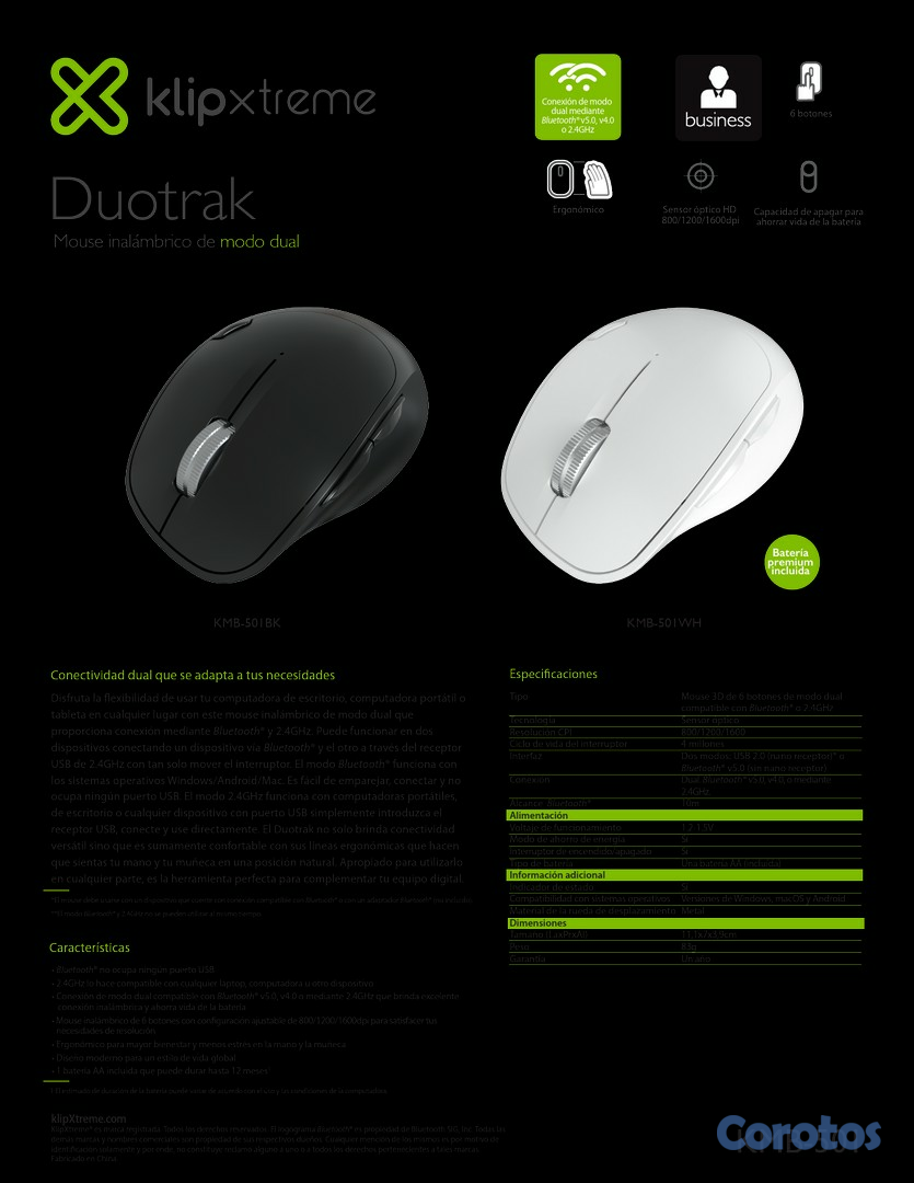 MOUSE KLIPX KMW-501BK ERGONOMICO (DUOTRAK), inalambrico y BLUETOOTH, 2.4GHZ 800/1200/1600DPI, 6 BOTONES, NEGRO. Y COLOR BLANCO