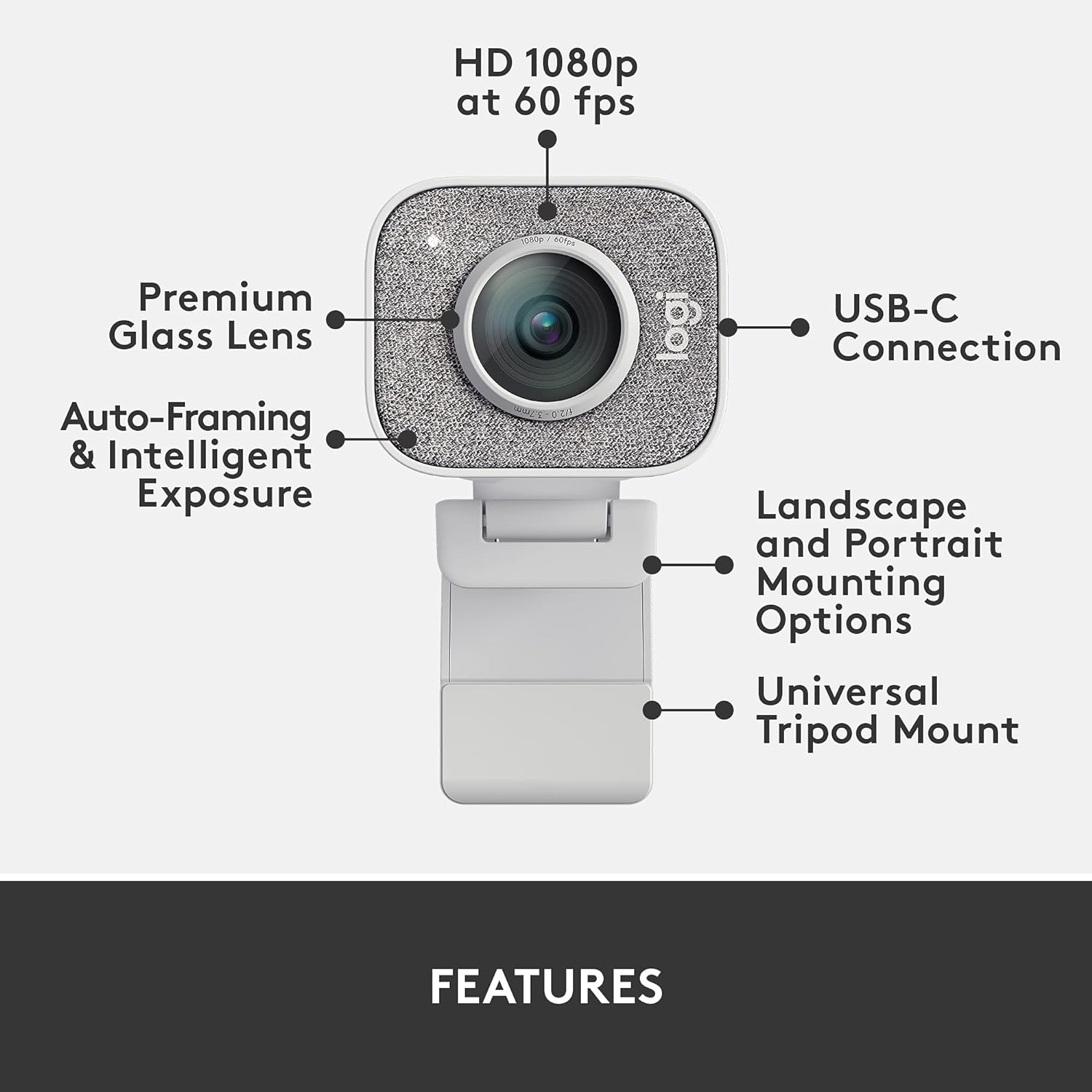 Logitech StreamCam - Cámara web para transmisión en vivo en YouTube y Twitch, Full HD 1080p a 60 fps, conexión USB-C, seguimiento facial, enfoque automático, videos verticales, gris claro.