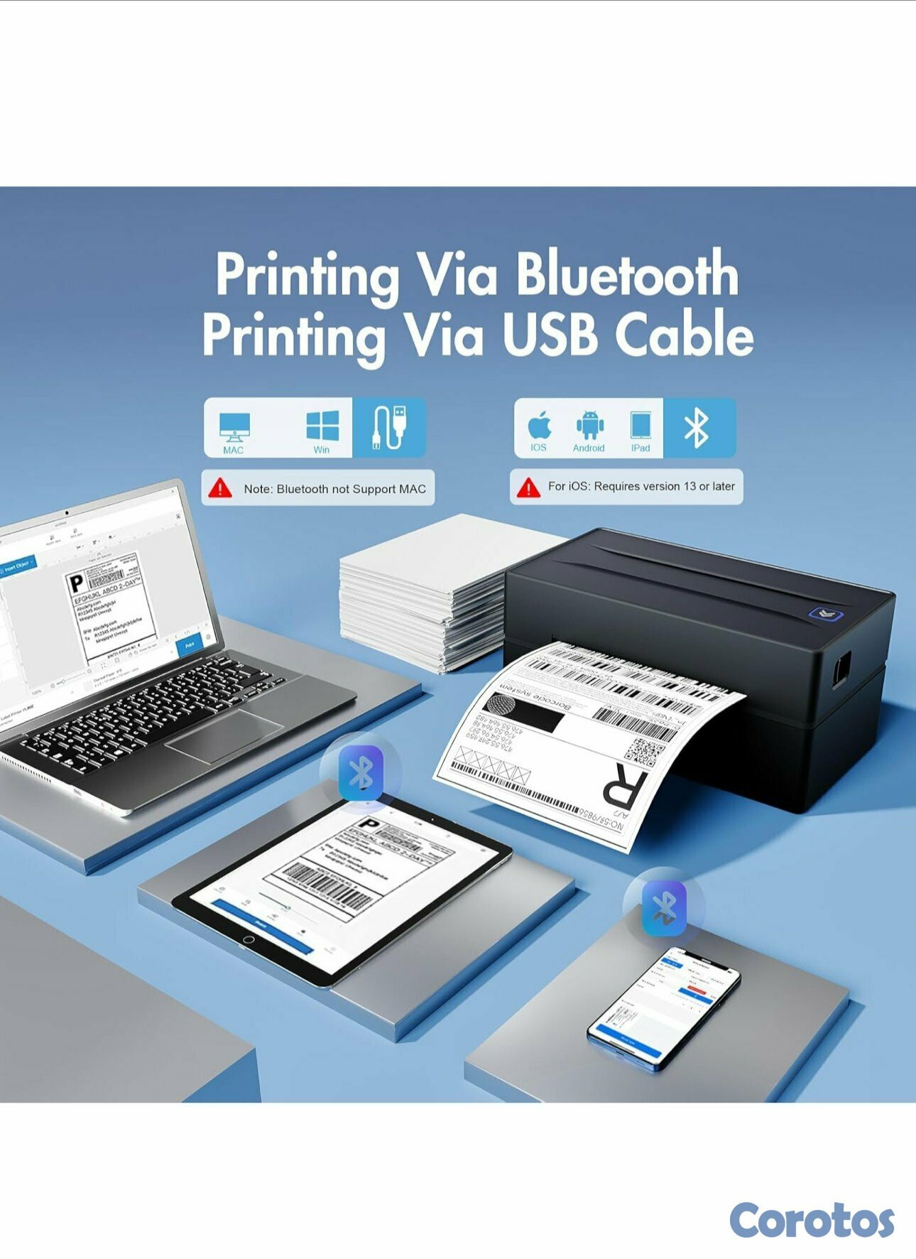 Amplia compatibilidad entre dispositivos: Empareje sin esfuerzo con sistemas Windows (7 y posteriores), macOS, iOS, Android y Chromebook para flujos de trabajo universales de oficina y logística, simplemente conecte la impresora de etiquetas de escritorio con un cable USB. (Nota: Mac y Chromebook no son compatibles con la impresión Bluetooth)