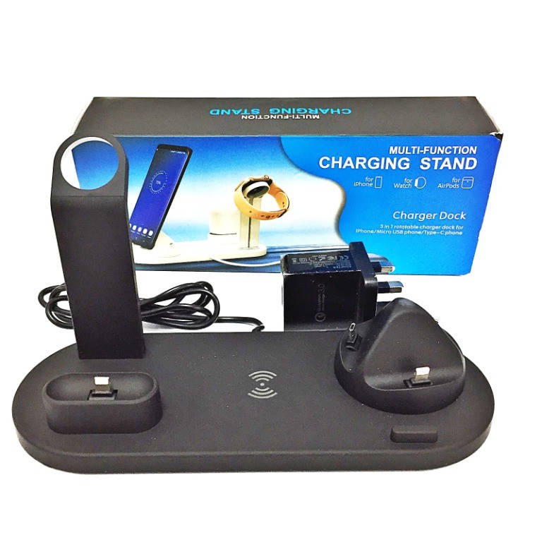 Esta estación 3 en 1 está diseñada para cargar su applewatch, airpods e iphone y todoslos teléfonos compatibles con Qi (dispositivo con carga inalámbrica).