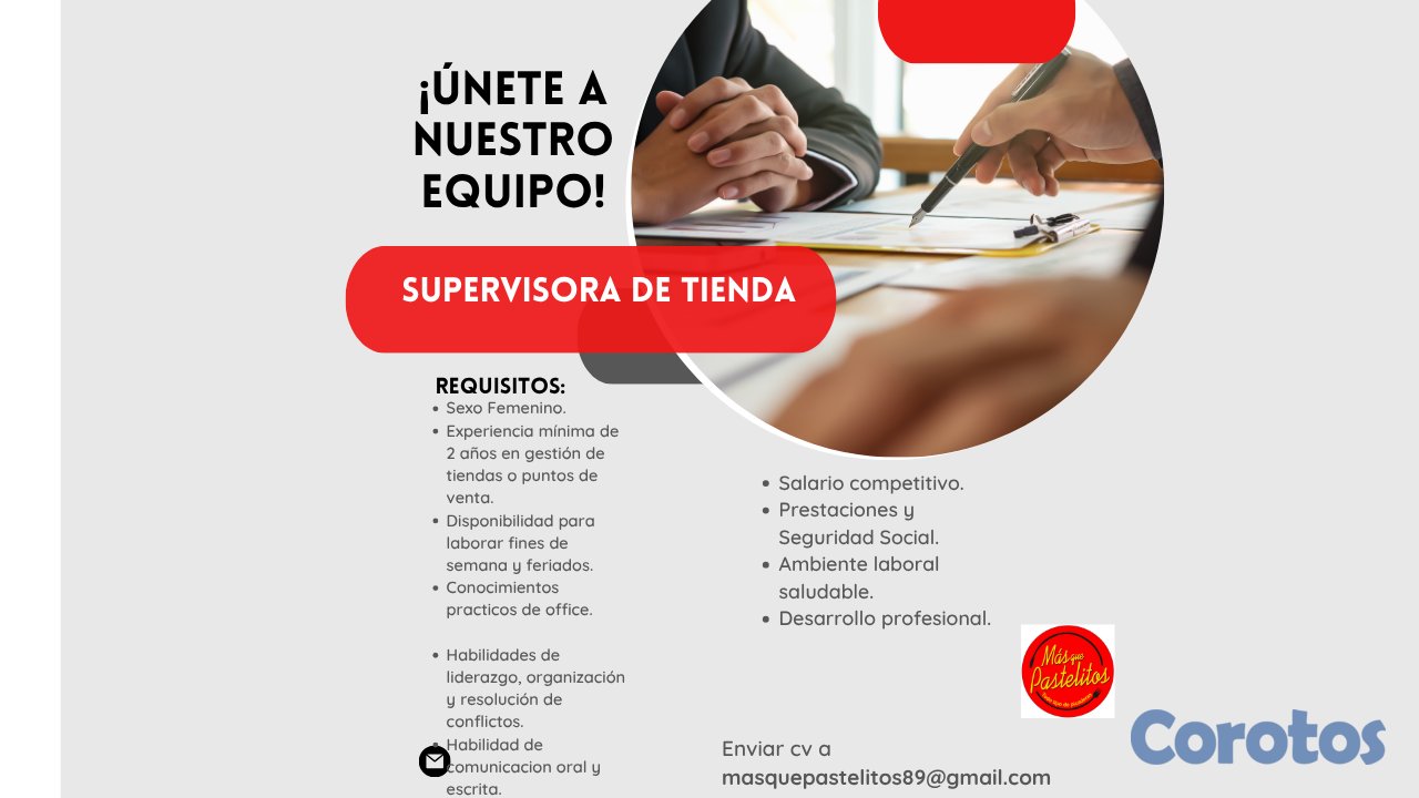 Enviar cv a masquepastelitos89@gmail.com