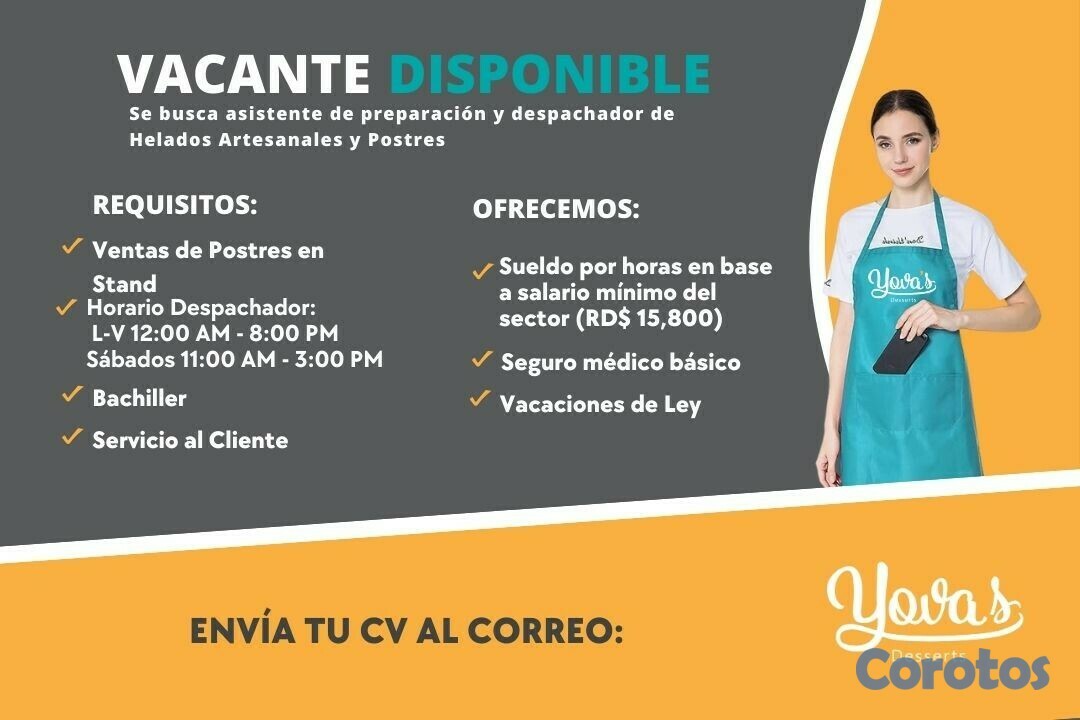 Responsable de la Venta, promoción y facturación de los productos que se venden en el Stand de Yova's Desserts. Debe tener flexibilidad a rotar entre tiendas y trabajar fines de semana a requerimiento.