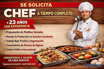 Se solicita chef HOMBRE a tiempo completo, mayor de 23 años, con experiencia comprobable en la preparación de platillos variados y manejo de producción en grandes cantidades. El candidato ideal debe contar con habilidades para trabajar bajo presión, organización en cocina, conocimiento de normas de higiene y capacidad para mantener la calidad y consistencia en cada servicio. Se valorará experiencia en cocina criolla e internacional, así como disposición para trabajar en equipo y adaptarse a las necesidades del menú.