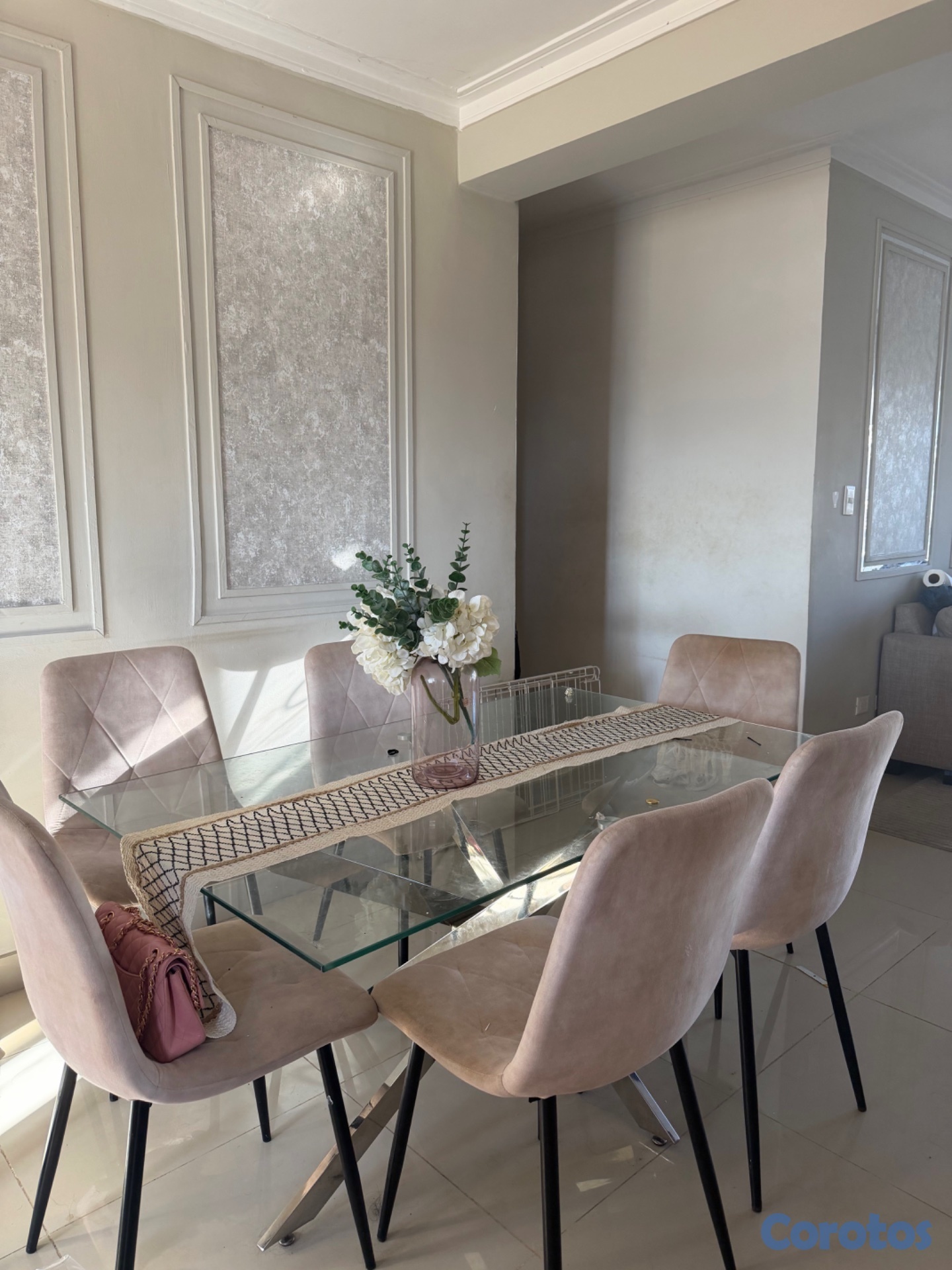 Este comedor cuenta con seis sillas con tope en cristal solamente tiene cuatro meses de uso. El color es crema está en condiciones totalmente como Nuevo