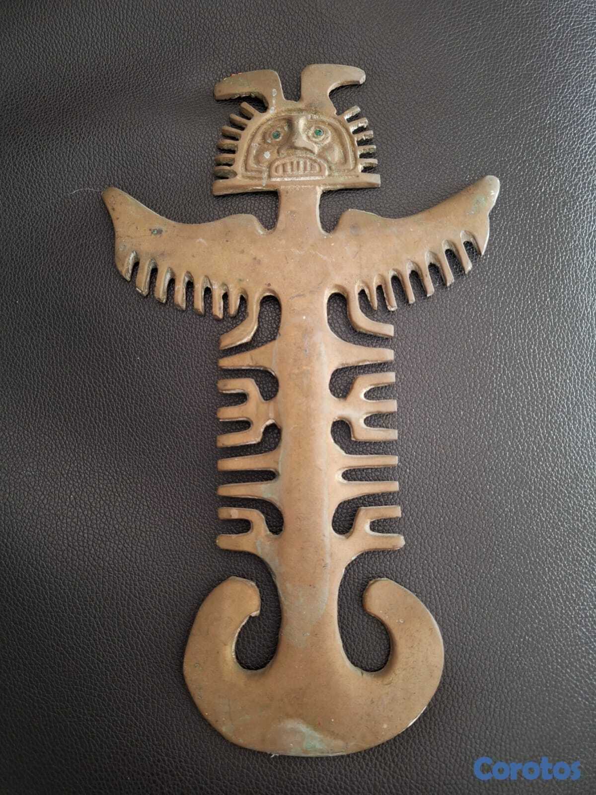 Figura decorativa en bronce macizo con diseño inspirado en el arte precolombino. Representa una figura alada con rasgos simétricos y acabado envejecido natural. Pieza ideal para decoración rústica, étnica o para colección.