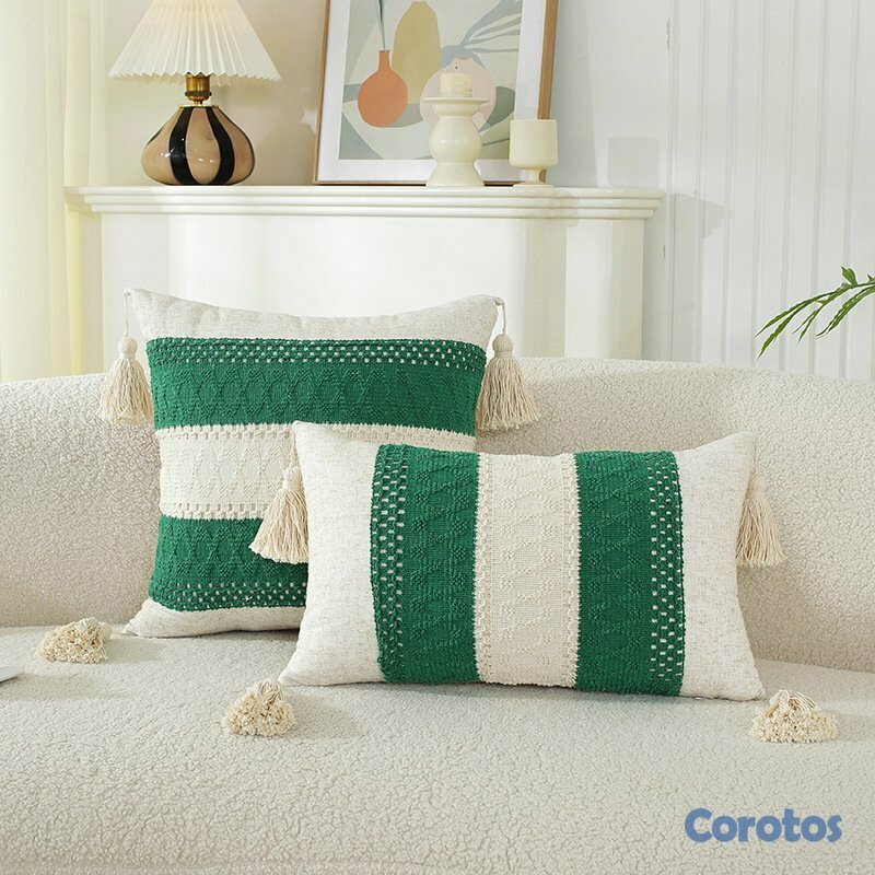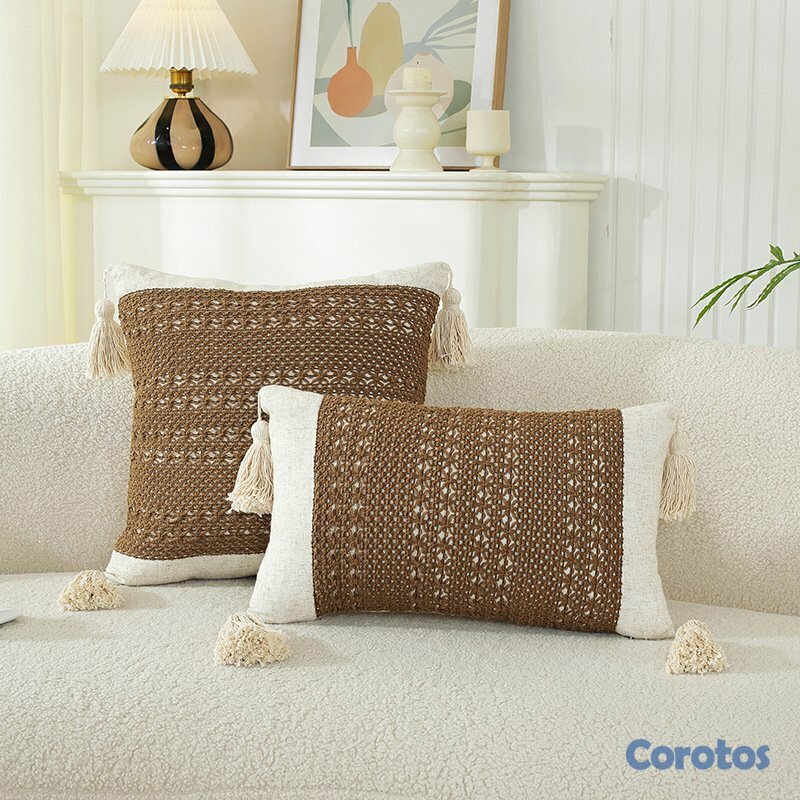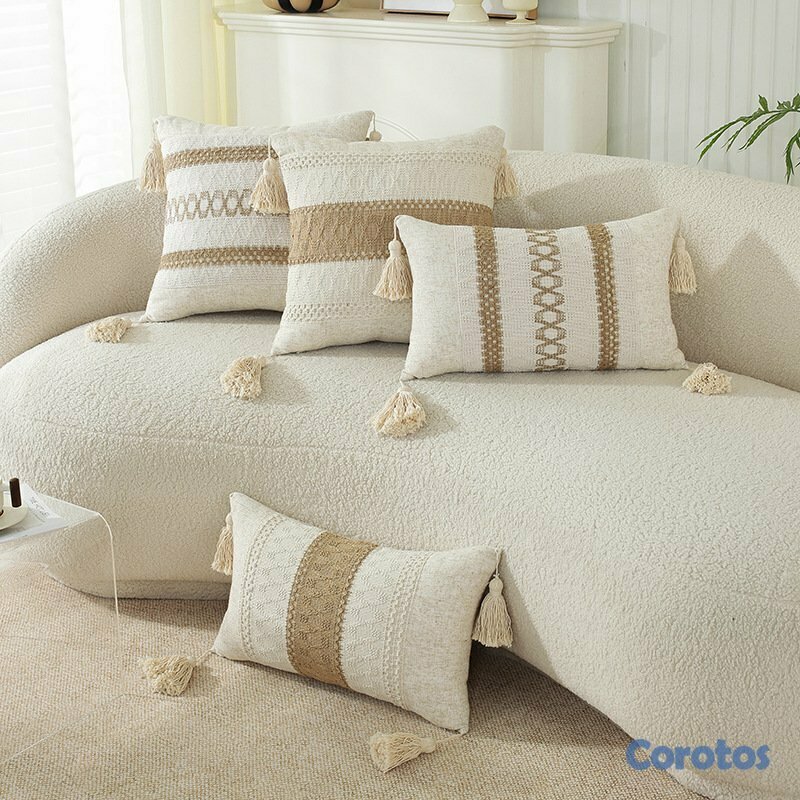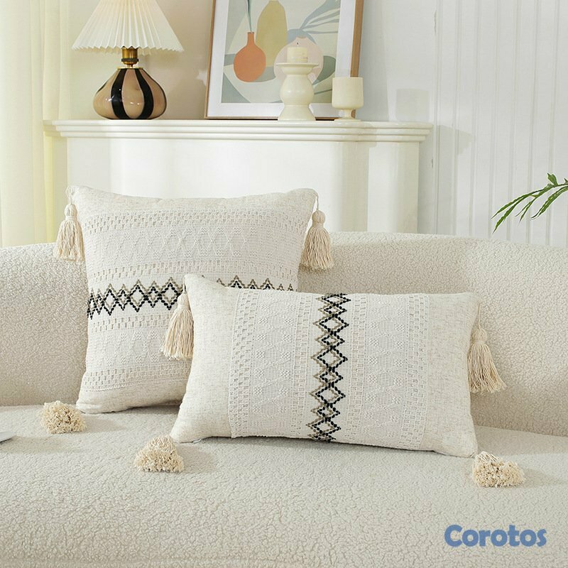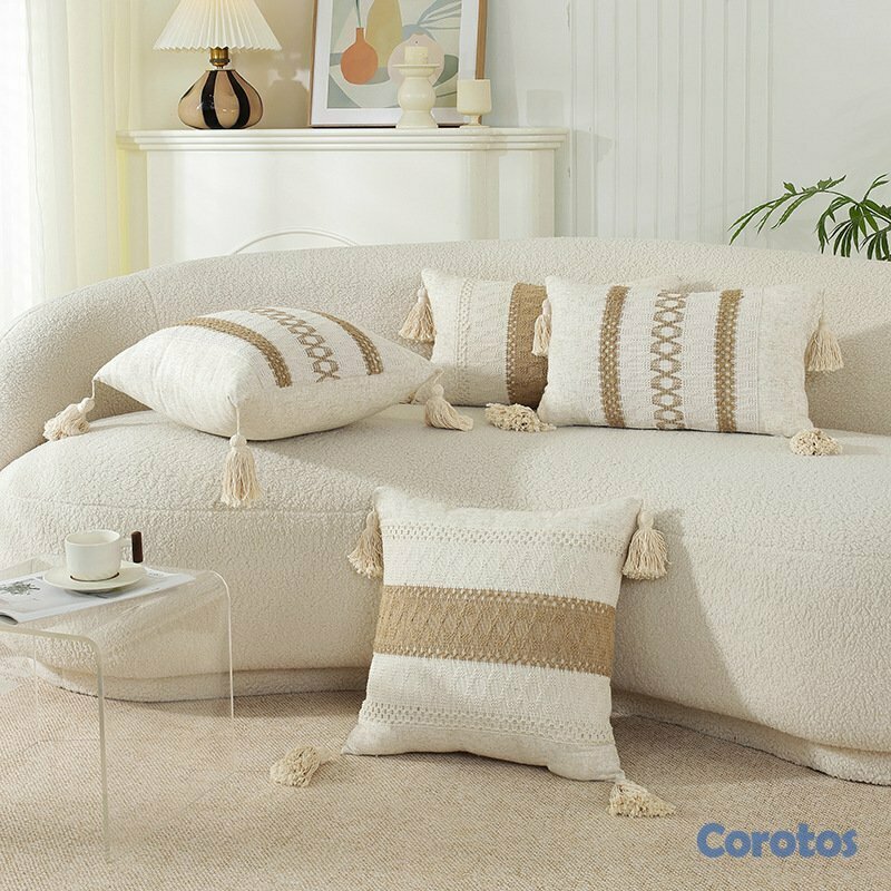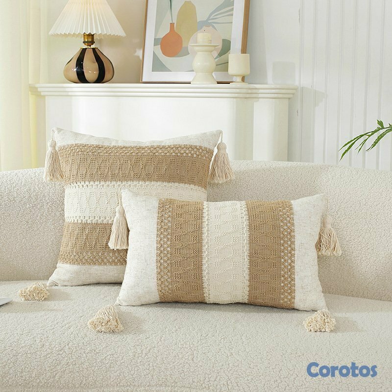 Fundas de cojín decorativas estilo boho con borlas y textura tejida.