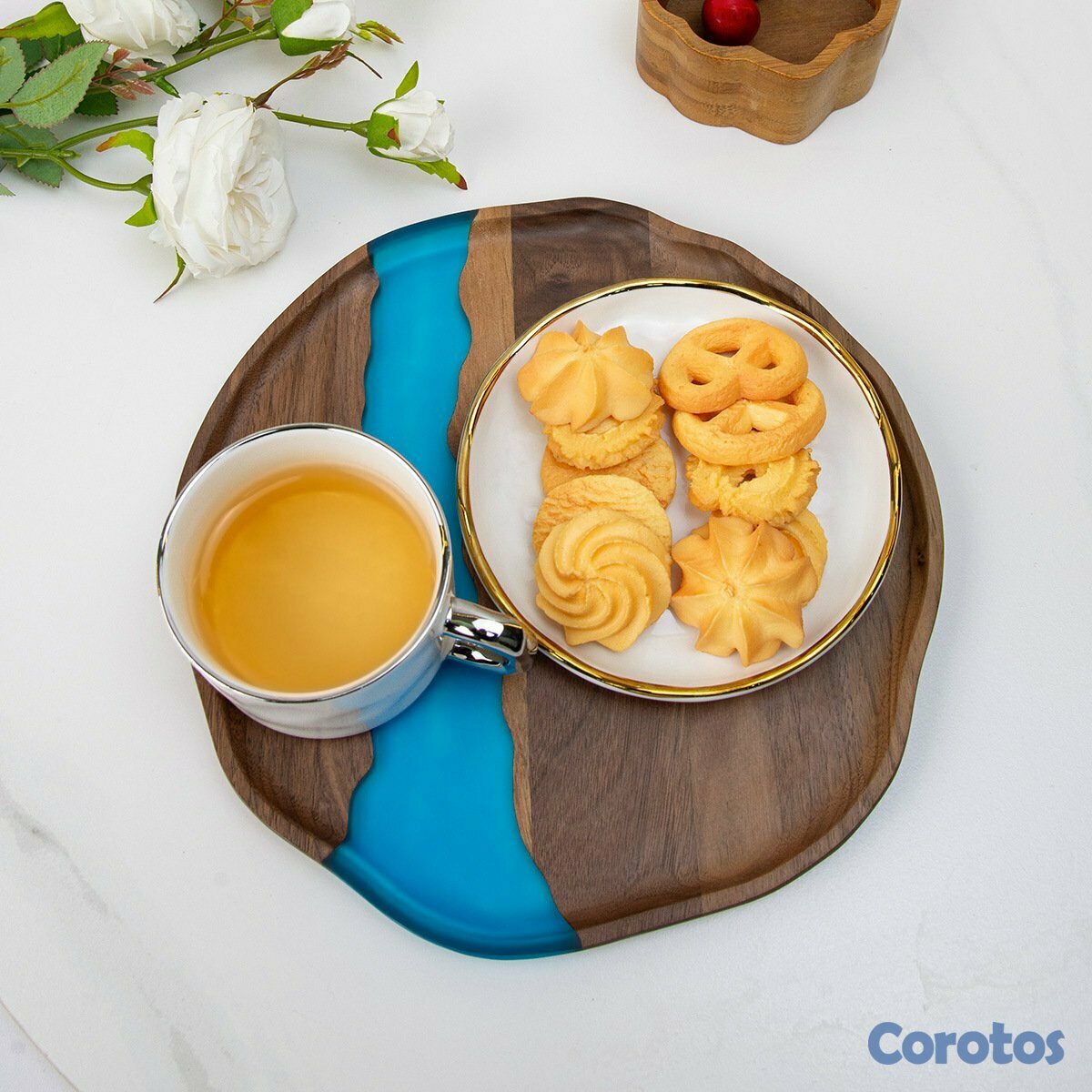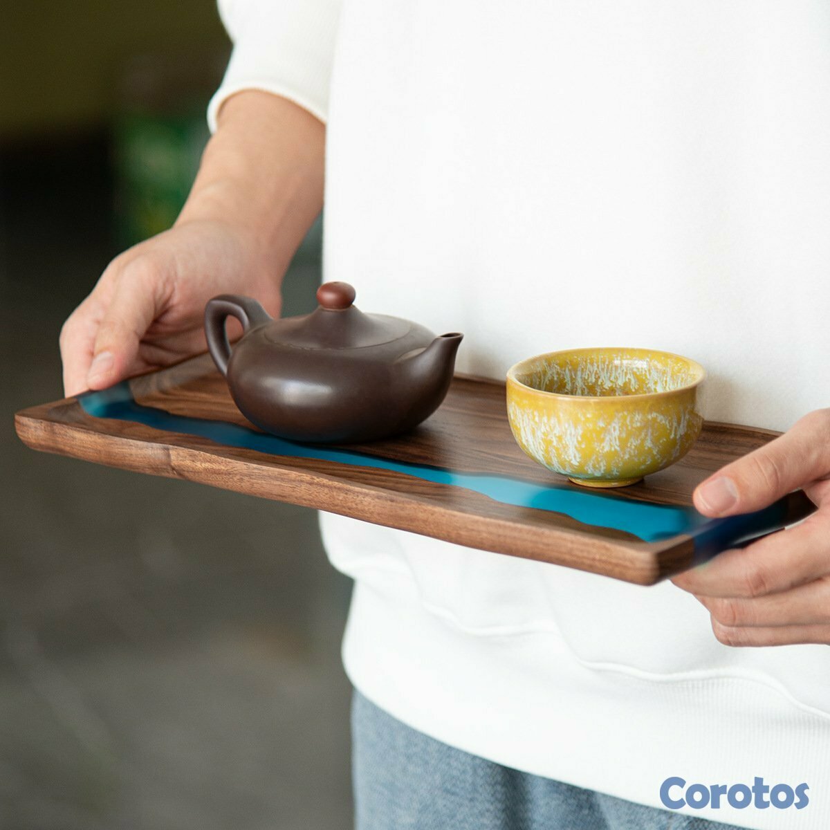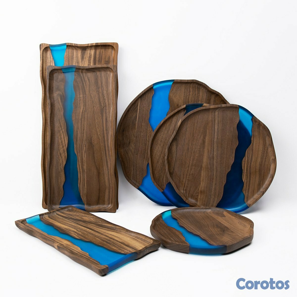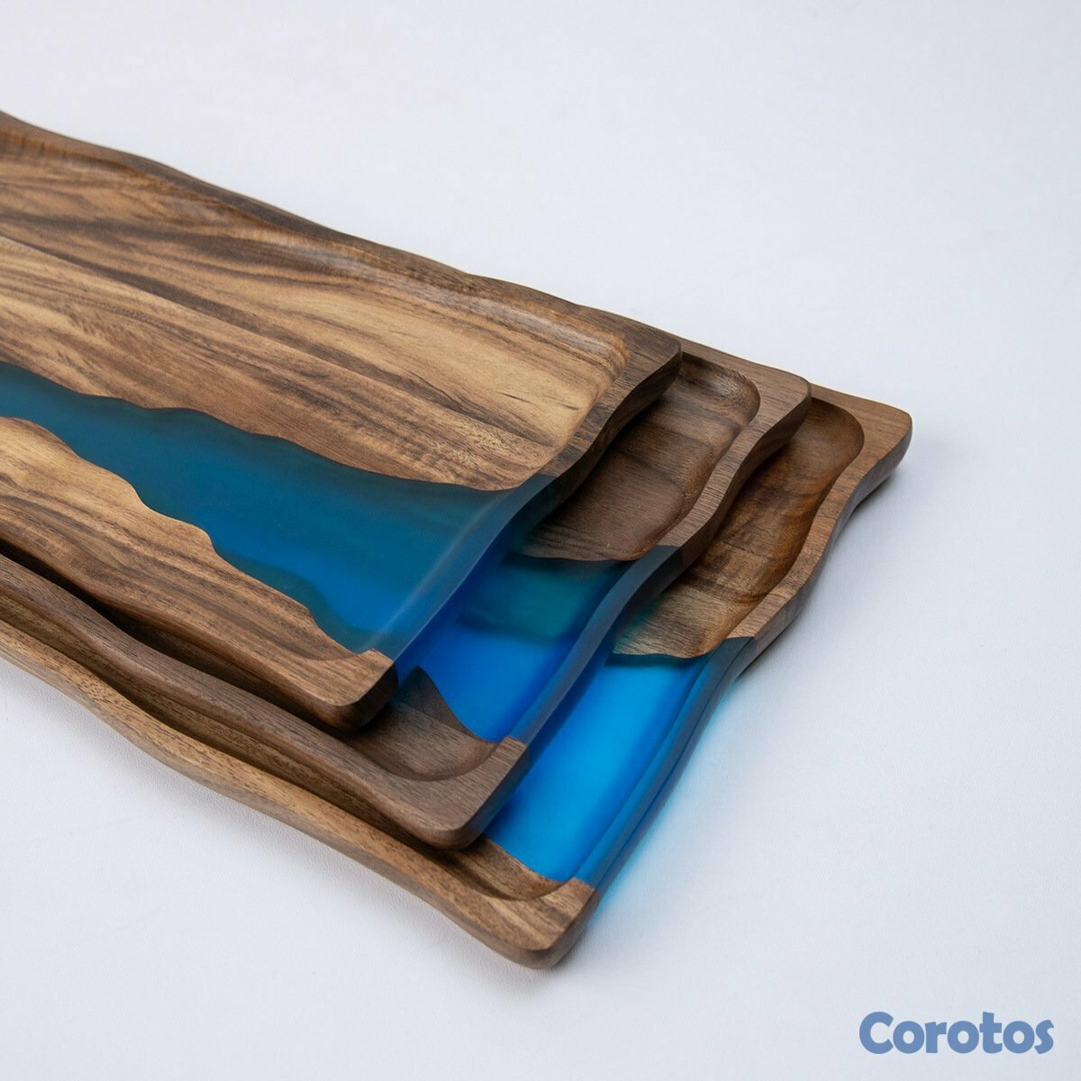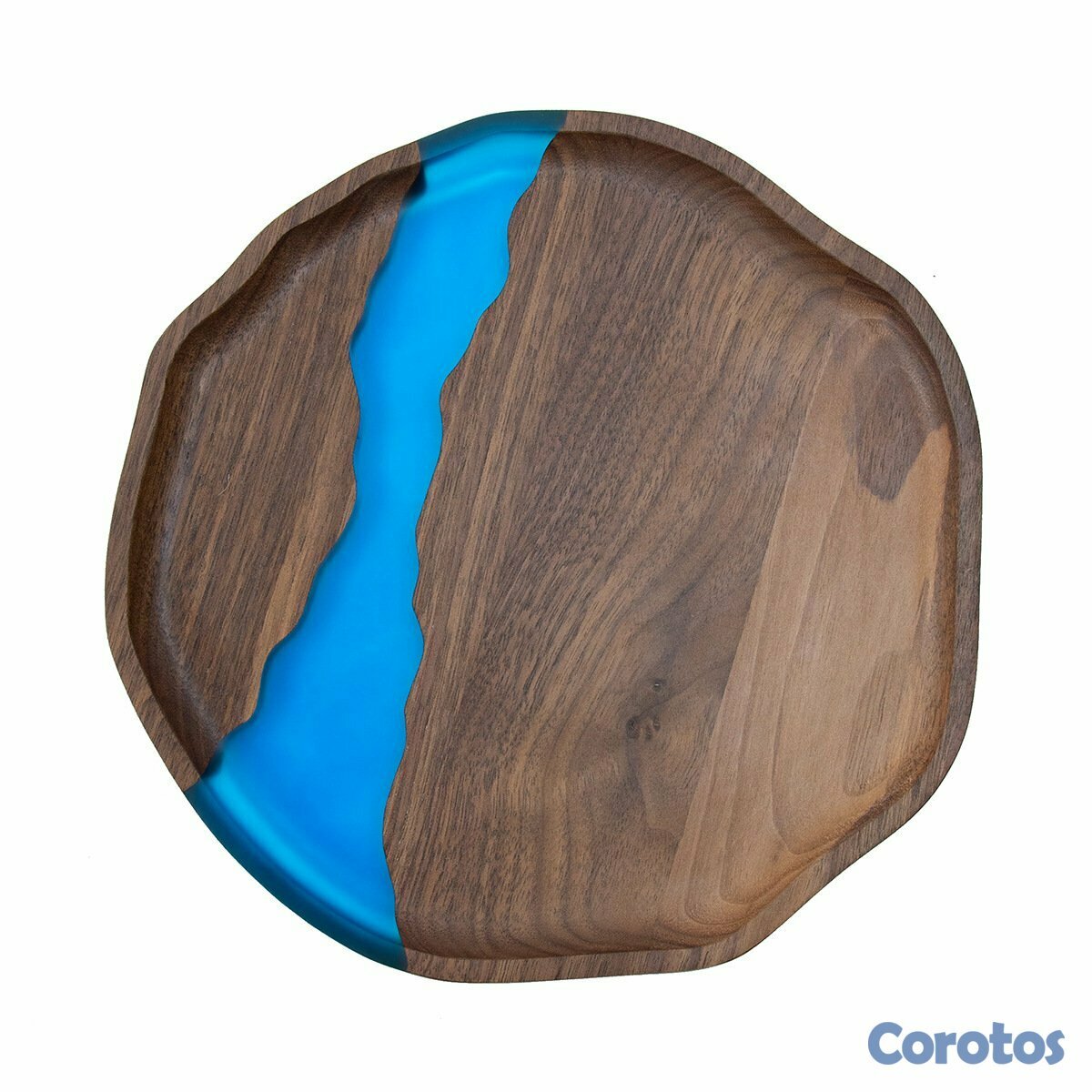 Juego de servir 7 piezas en madera con resina azul tipo río. Ideal para servir y también como decoración (mesa, cocina o comedor). Acabado elegante, bordes orgánicos y diseño único.