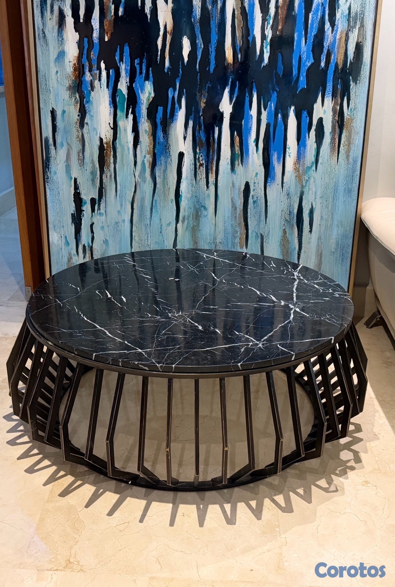 Bellísima mesa de centro con tope de mármol y base metal negro. comprada en Ilumel.