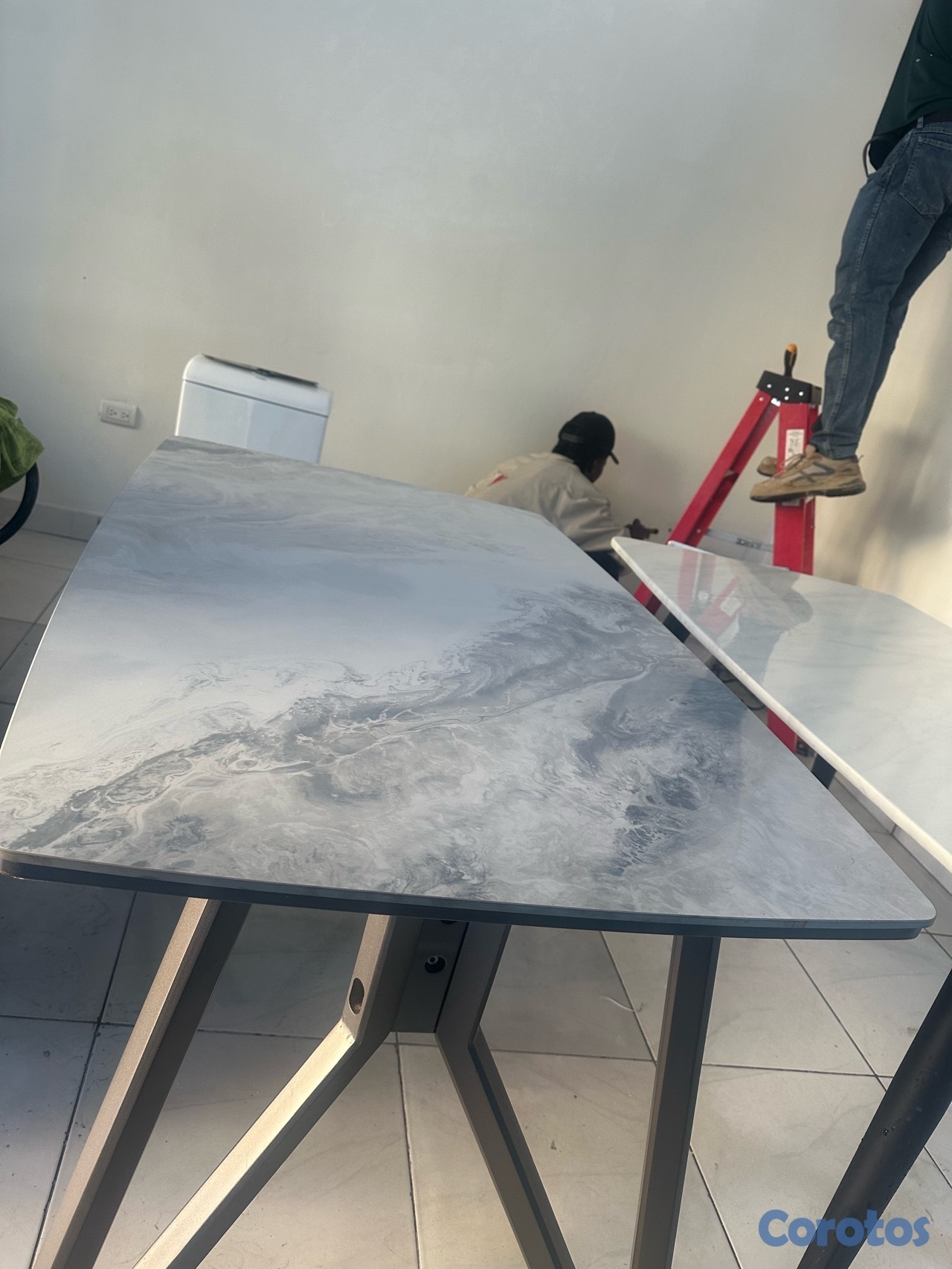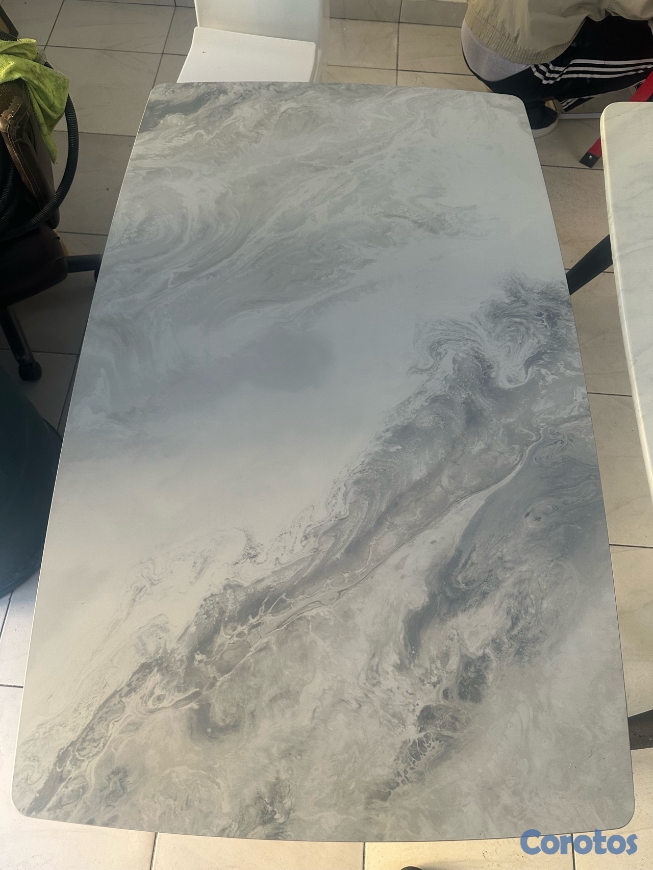 Mesa moderna con diseño elegante tipo mármol en tonos gris y blanco.