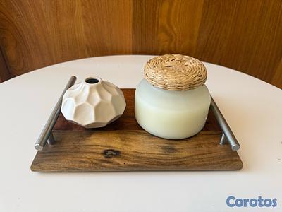 Mini bandeja de madera 850 mini jarrón geométrico 300 vela blanca 600