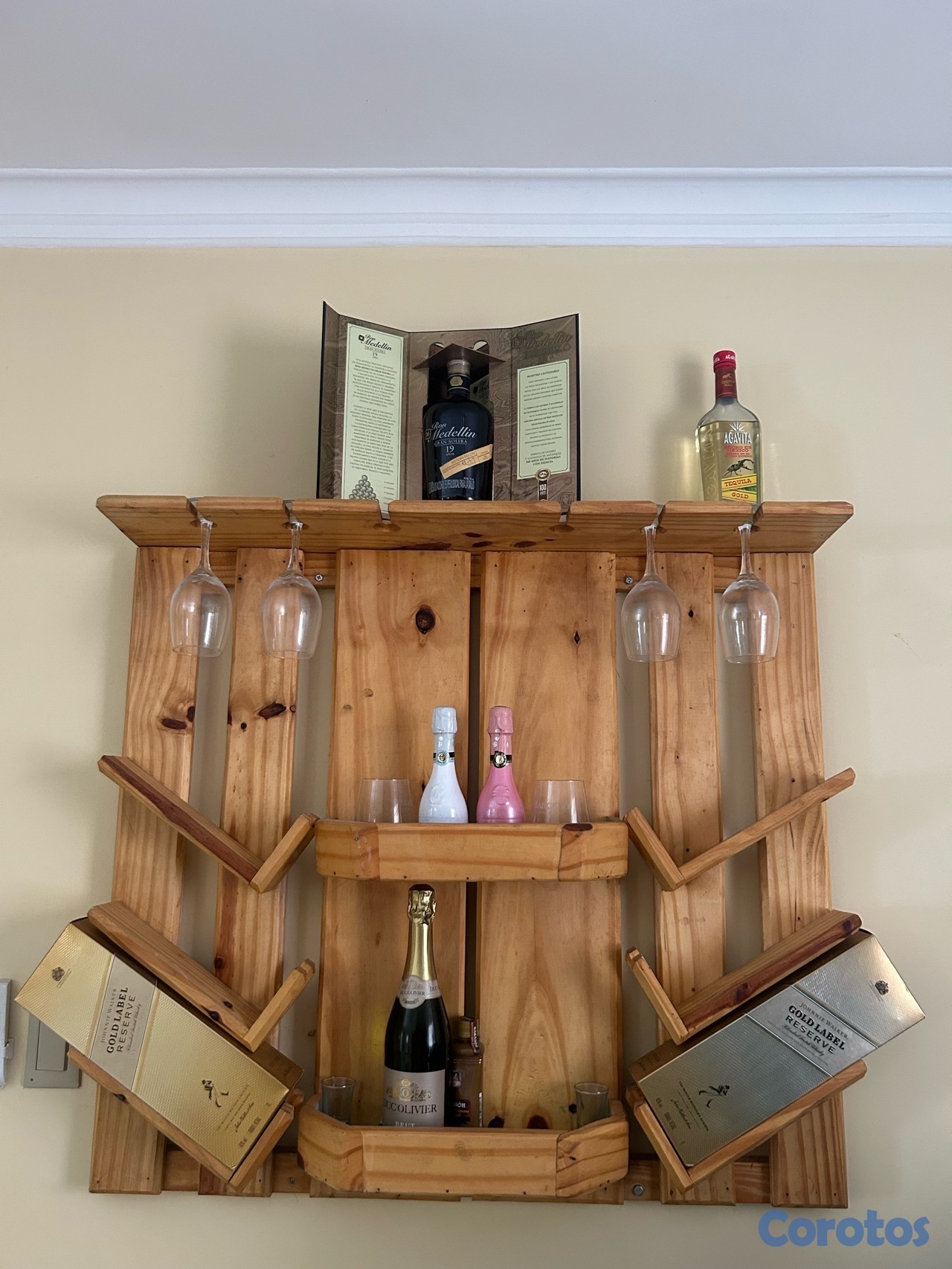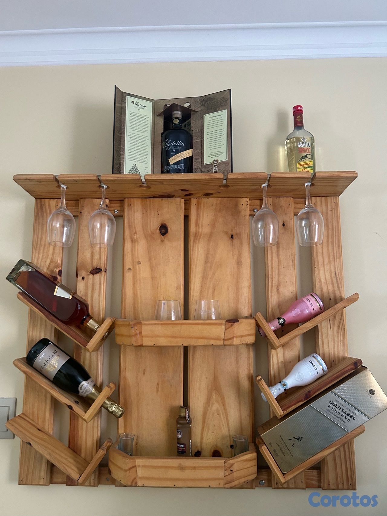Se vende hermoso mueble bar artesanal de pared, elaborado en madera, ideal para sala, comedor, terraza o área social. Diseño rústico moderno, perfecto para organizar botellas, copas y darle un toque elegante a tu espacio.