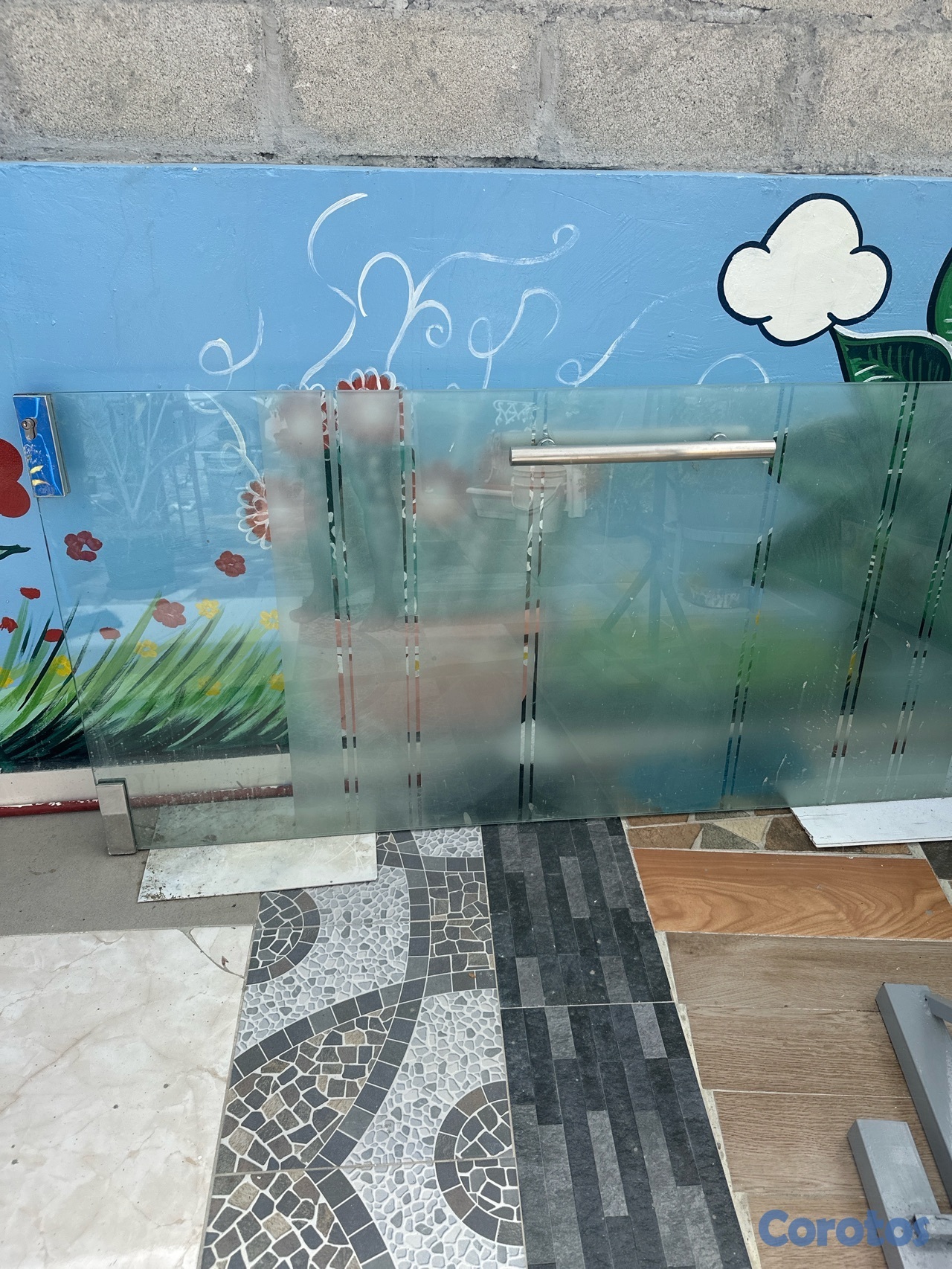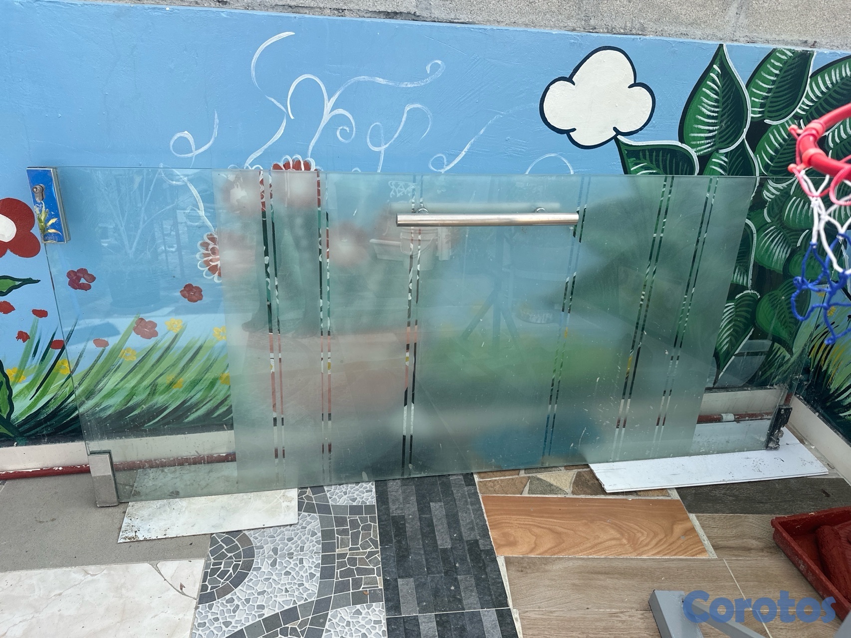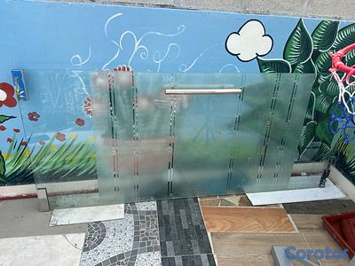 Puerta de cristal templado con todos sus accesorios: Brazos, base y tapas.