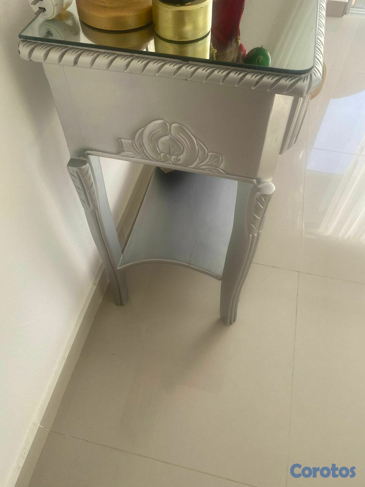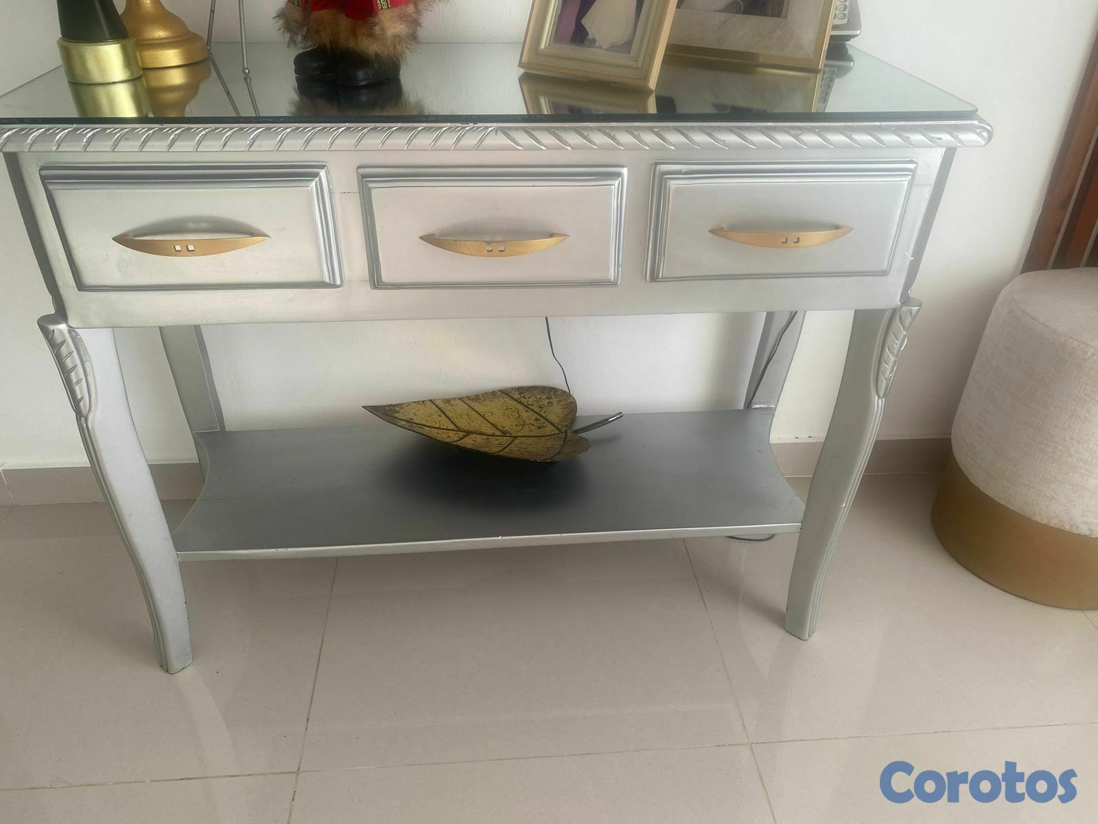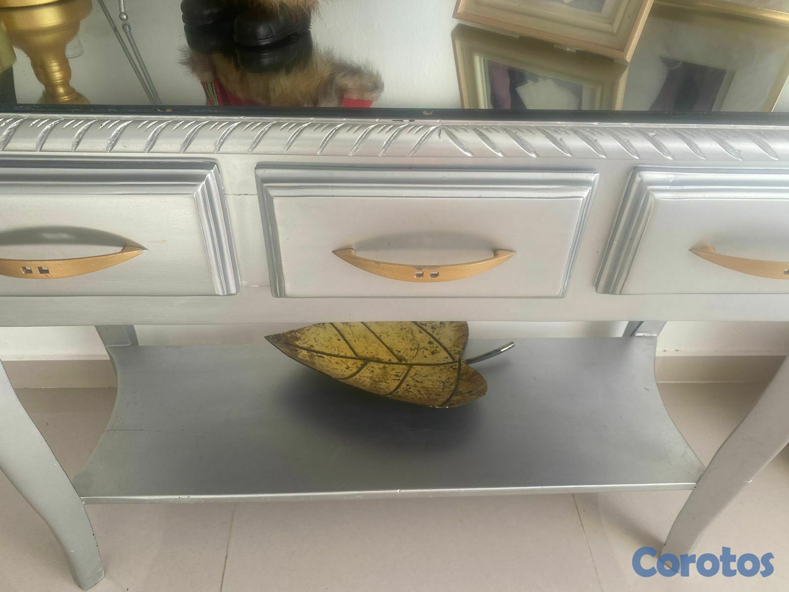 Repisa moderna en caoba pura pintada de gris, exclente condiciones, tope de crital en espejo, con gabetas, y puños dorados. Es pura caoba y se puede comprobar la madera.