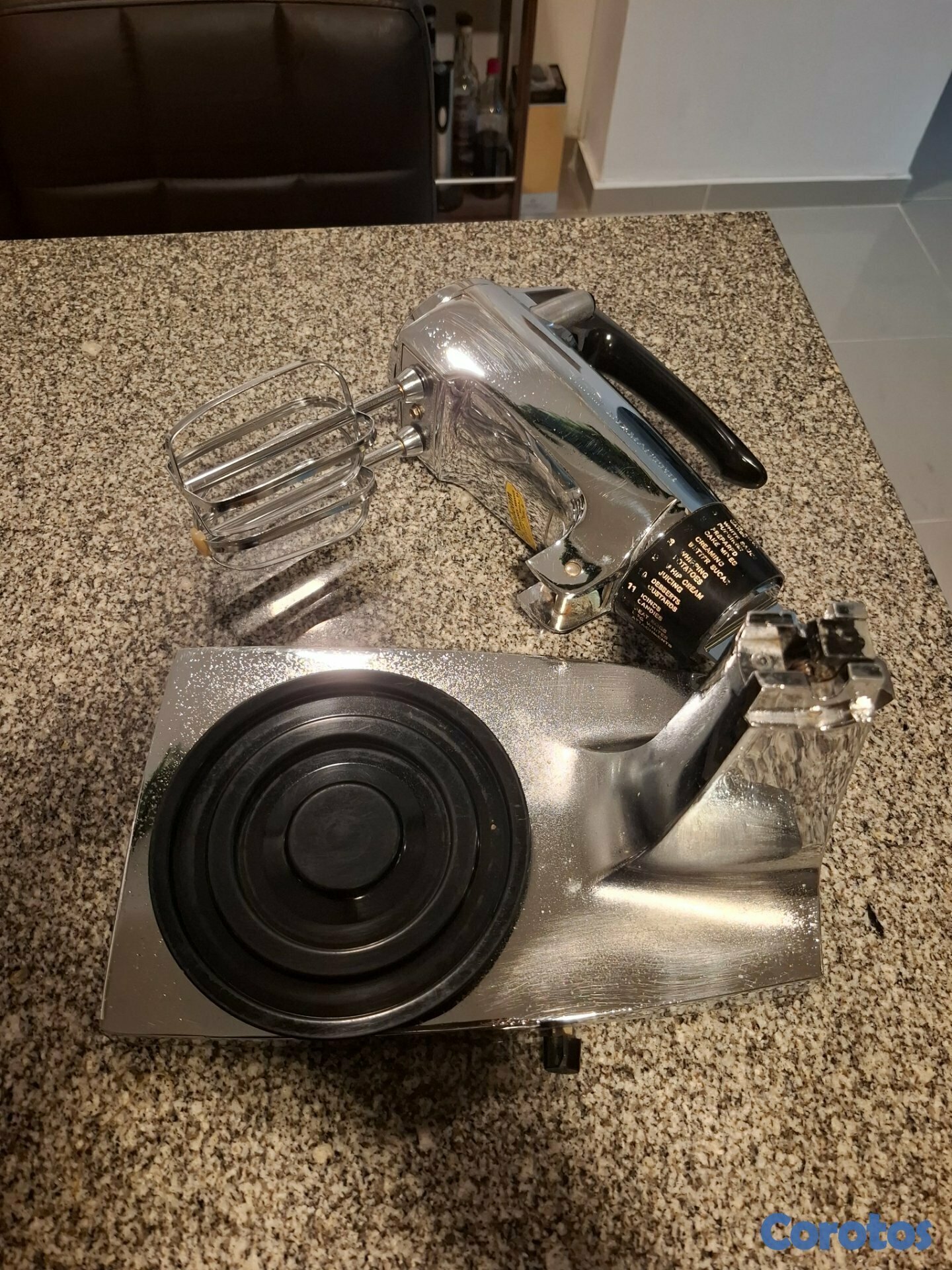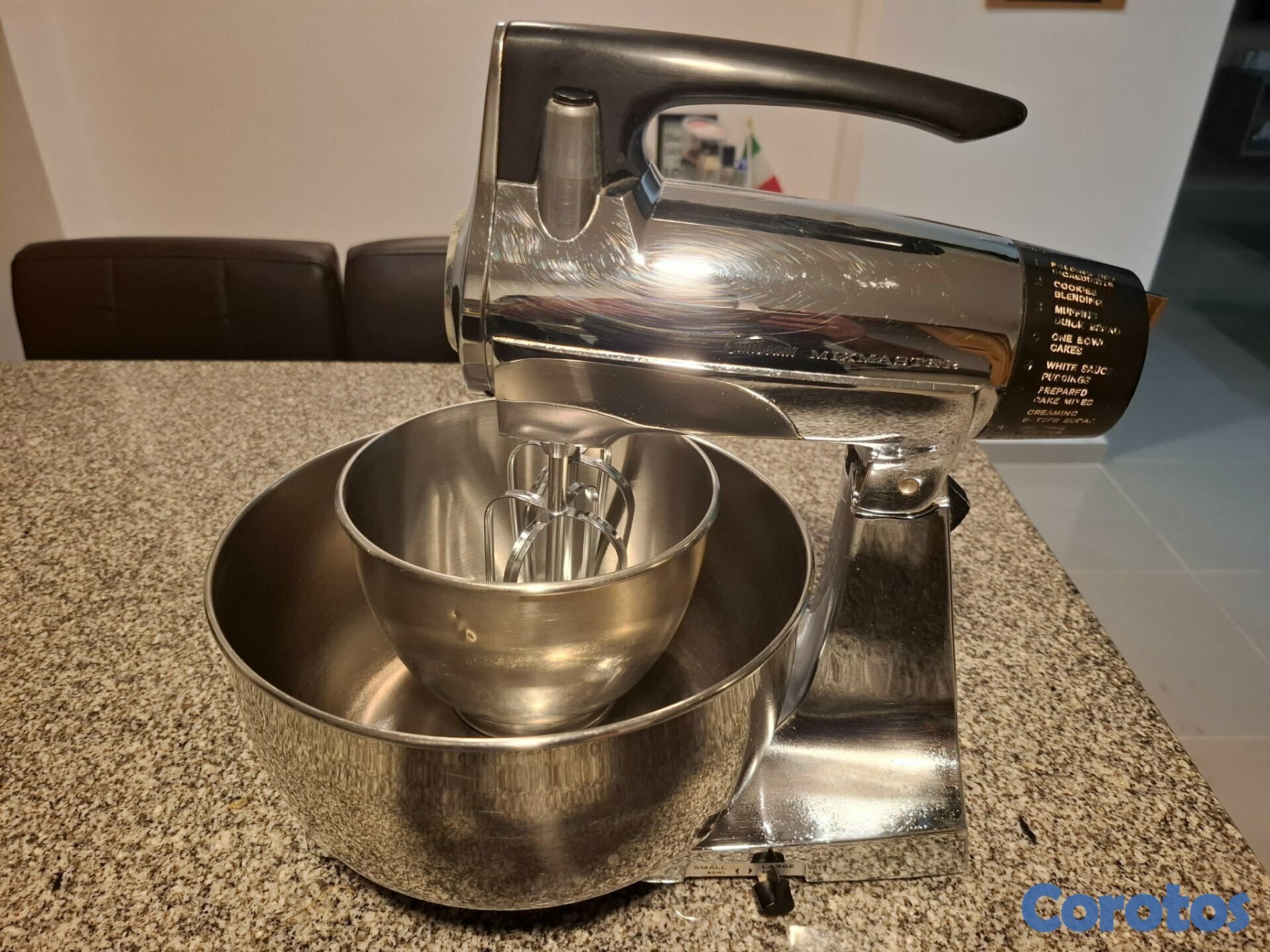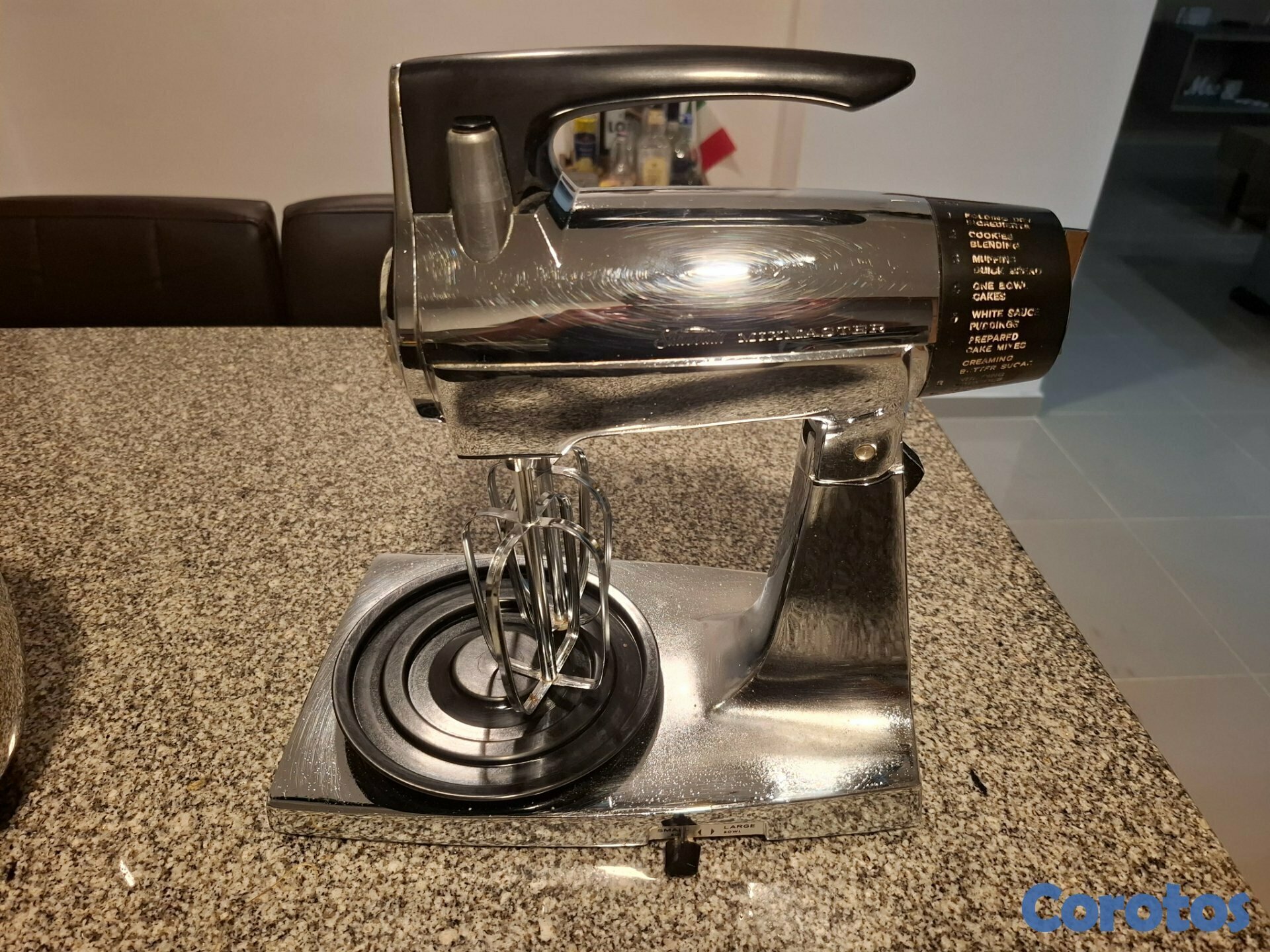Batidora de pedestal Vintage Chrome Sunbeam Mixmaster de 12 velocidades, cromada, con dos bolws de acero inoxidable y dos batidores.