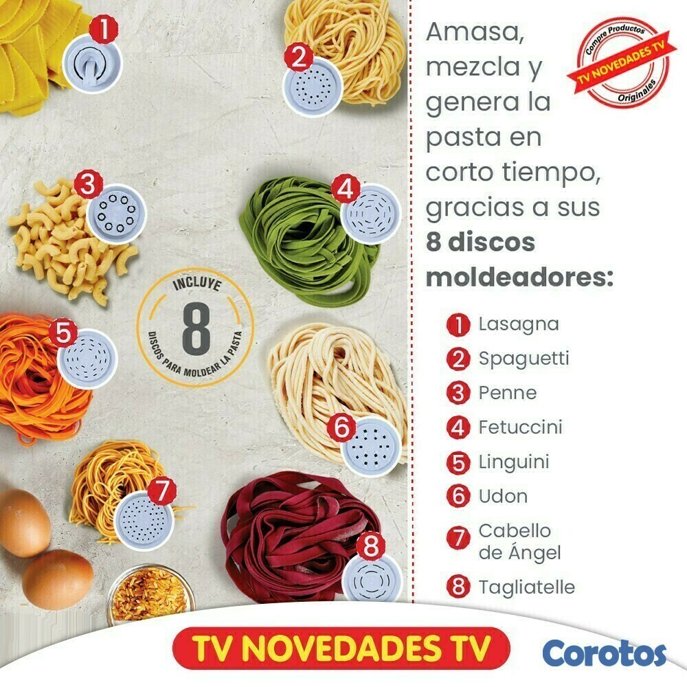 Puedes usar verduras, huevos, especias, hierbas, colores artificiales y distintas mezclas para obtener deliciosos y saludables resultados. También puedes usar su pieza para exprimir jugos y los accesorios que te permiten hacer cierta variedad de postres. Dentro de la variedad de pastas que podrás hacer tendrás fideos, espaguetis, linguinis, tagliatelle, cabello de ángel, fetuccine y lasaña.