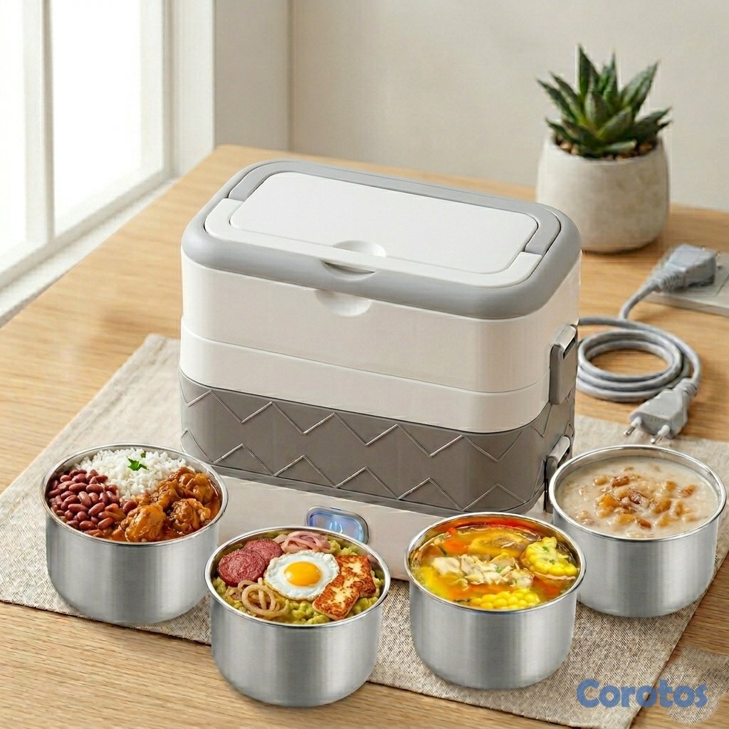 Disfruta tus comidas calientes y recién hechas donde quieras con la lonchera eléctrica de 2 niveles con 4 recipientes.