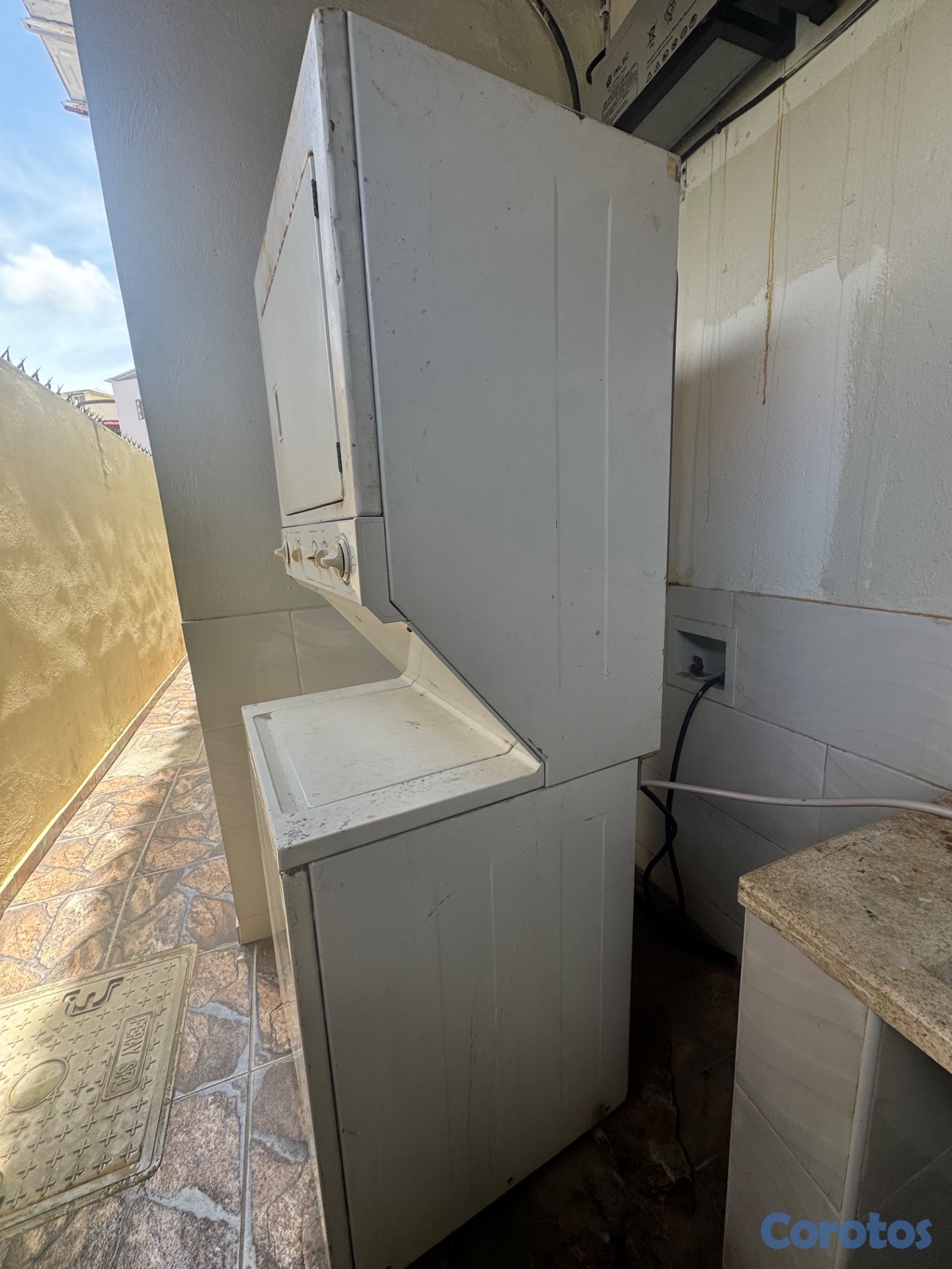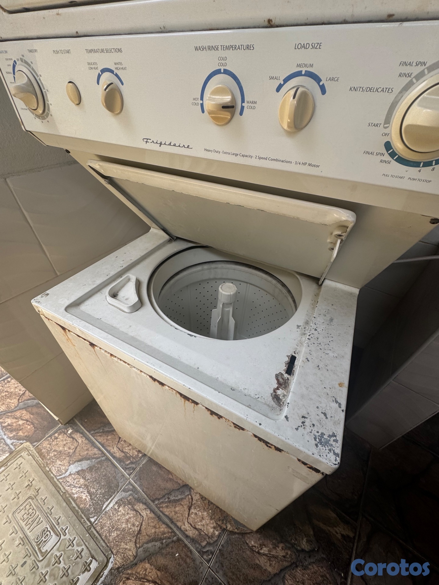 Lavadora-secadora usada marca Frigidaire, en funcionamiento, con signos de óxido. Ideal para un uso funcional a buen precio. 6,000.