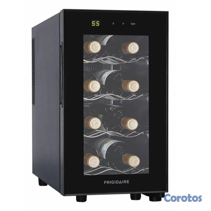 La Vinera Frigidaire cuenta con 8 botellas de capacidad, 4 estantes, manijas integradas, control de temperatura eléctronico, pantalla digital, luz interior y patas ajustables.