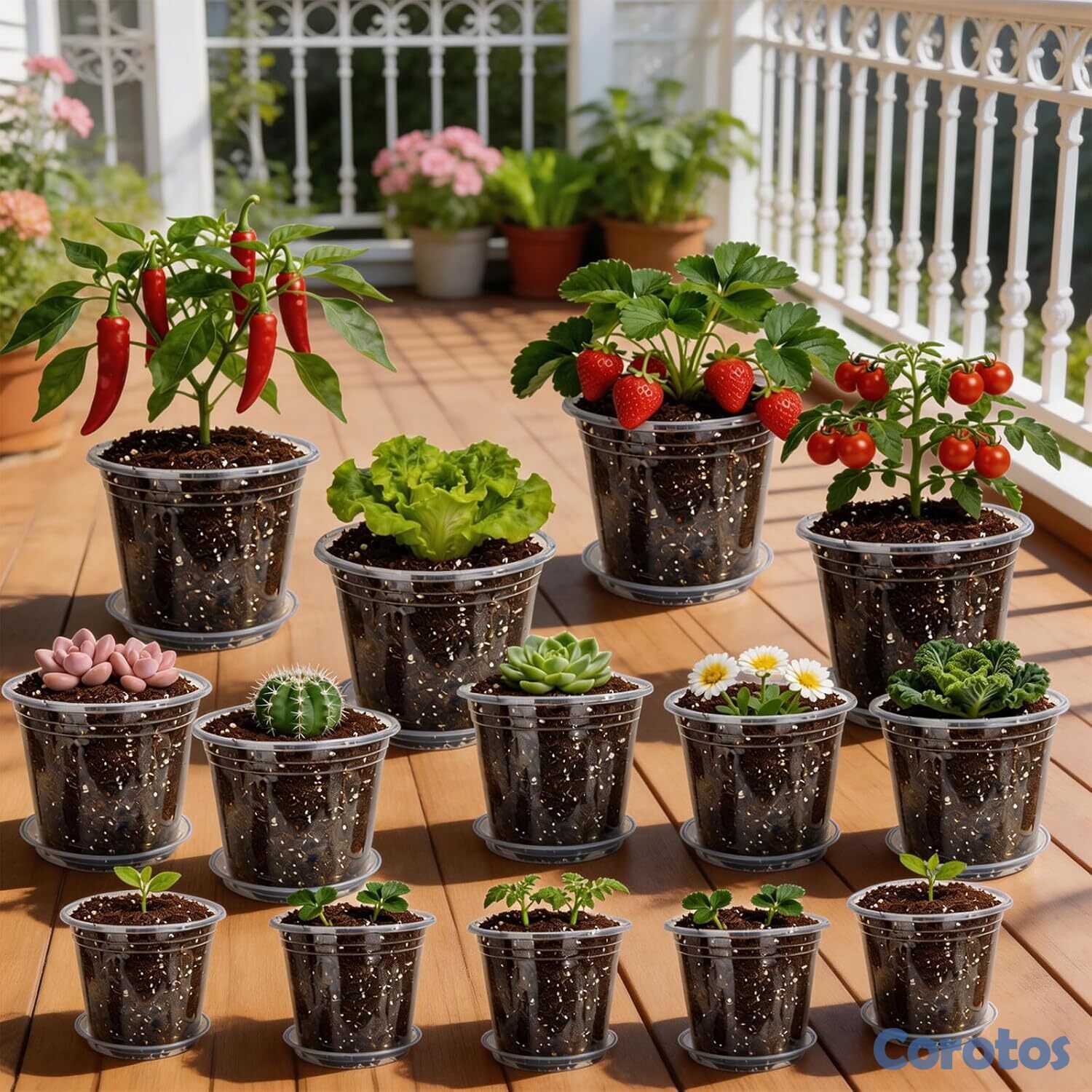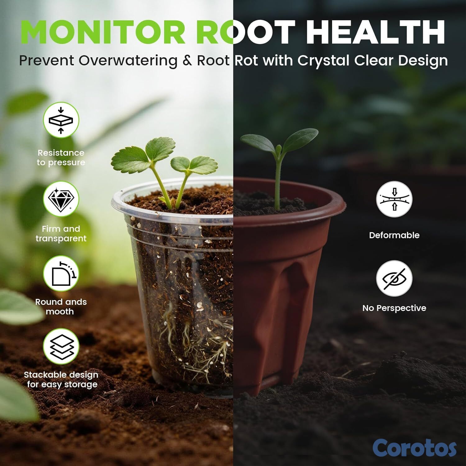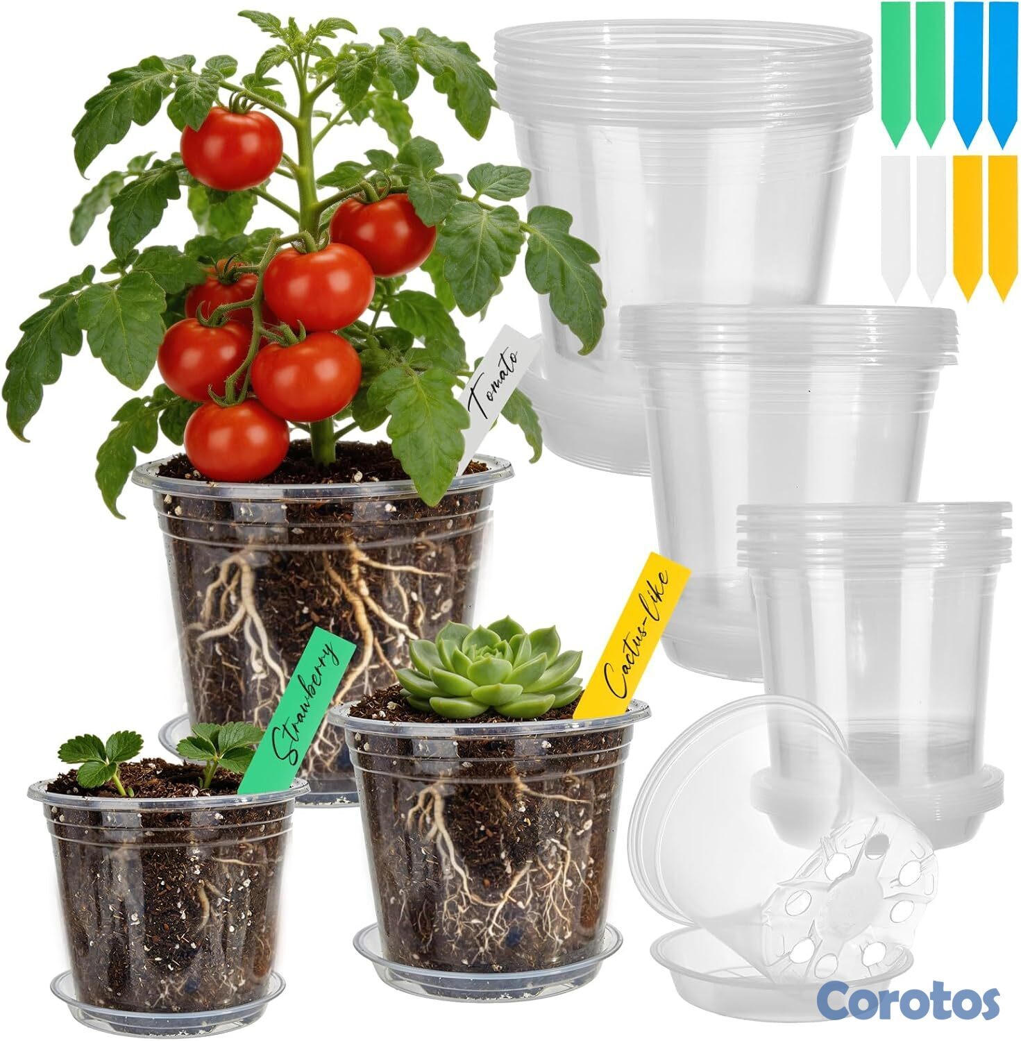 Juego de 24 macetas transparentes con drenaje y platillos incluidos, ideales para observar el crecimiento de las raíces sin necesidad de sacar la planta. Su diseño con múltiples orificios evita el exceso de agua y la pudrición, mientras que los platillos mantienen tus espacios limpios. Incluye 3 tamaños (8 macetas de 4", 8 de 5" y 8 de 6"), perfectos para suculentas, cactus, orquídeas, plantas de interior y germinación de semillas. Fabricadas en plástico PP resistente y reutilizable, aptas para interiores y exteriores.