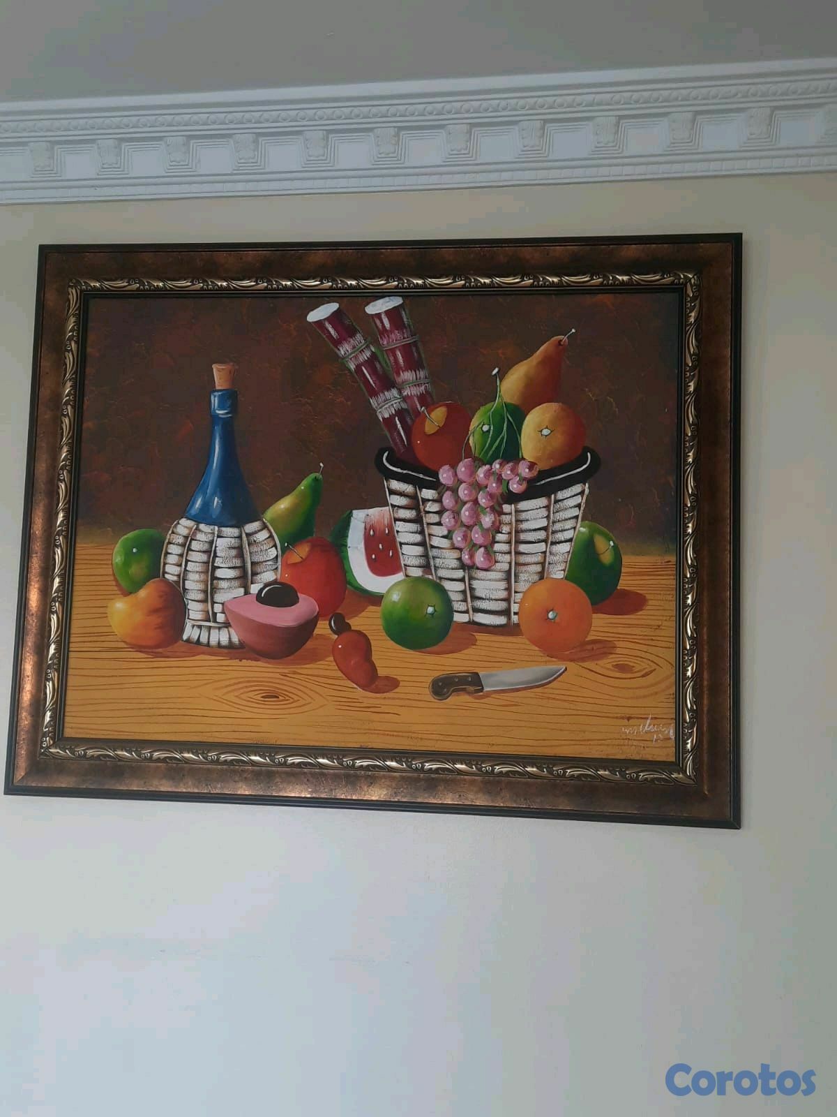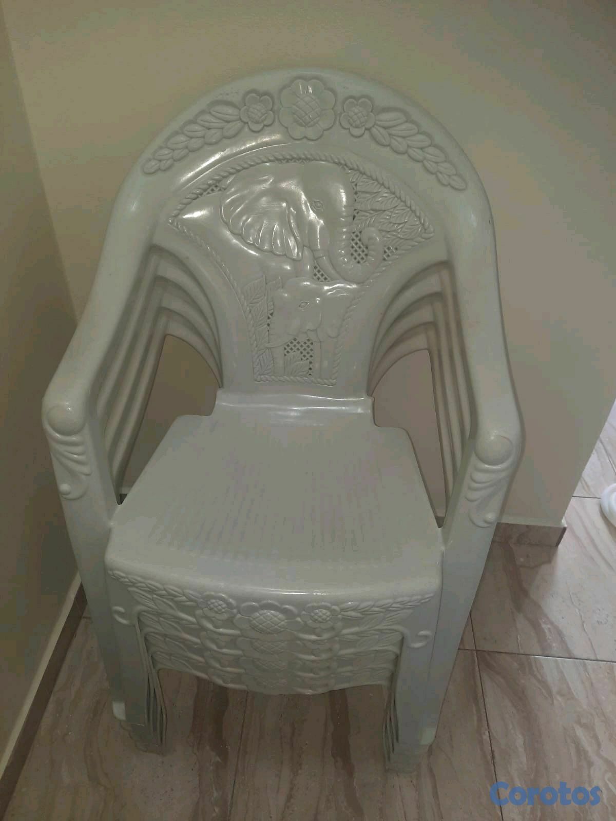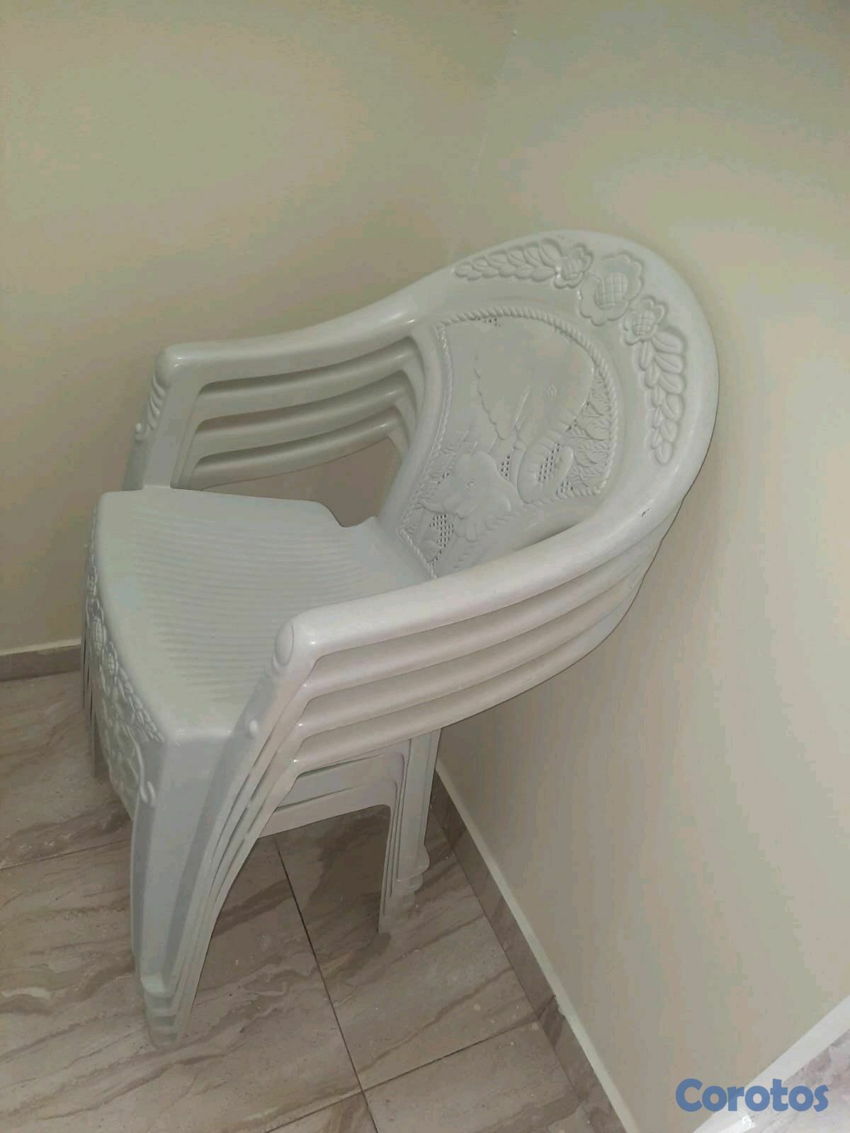 4 sillas plásticas y un cuadro grande