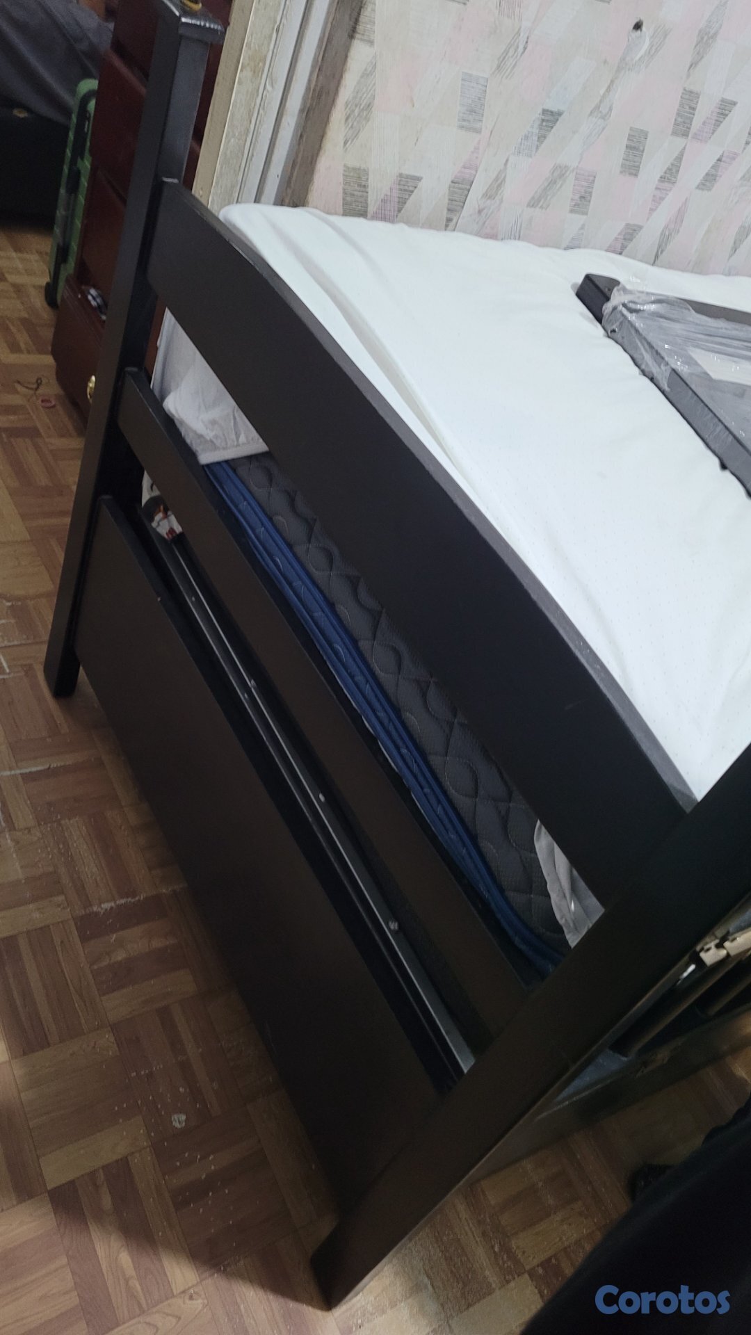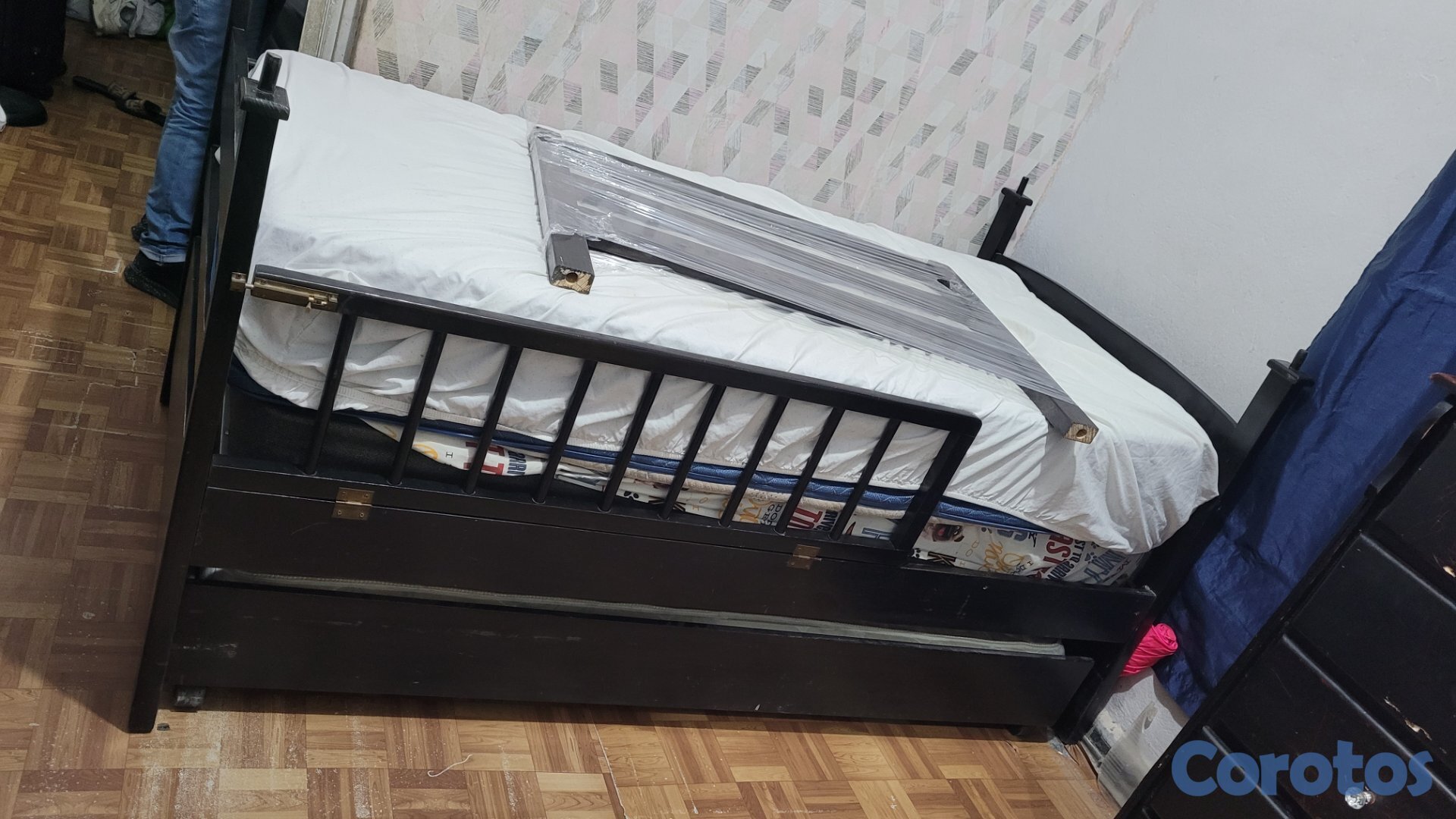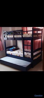 Camarote pino americano con soporte de hierro 39×74 Twin parte arriba y parte de abajo y la cama auxiliar, es tamaño 36×71×5 "nido" (usado en excelente condiciones). No incluye los colchones pero tiene 2 de los que teajo si lo quieren se lo pueden llevar free