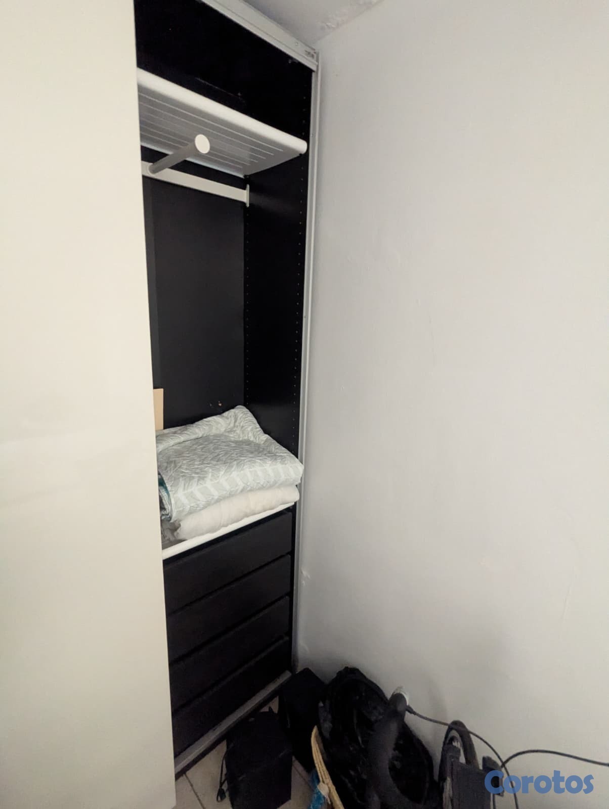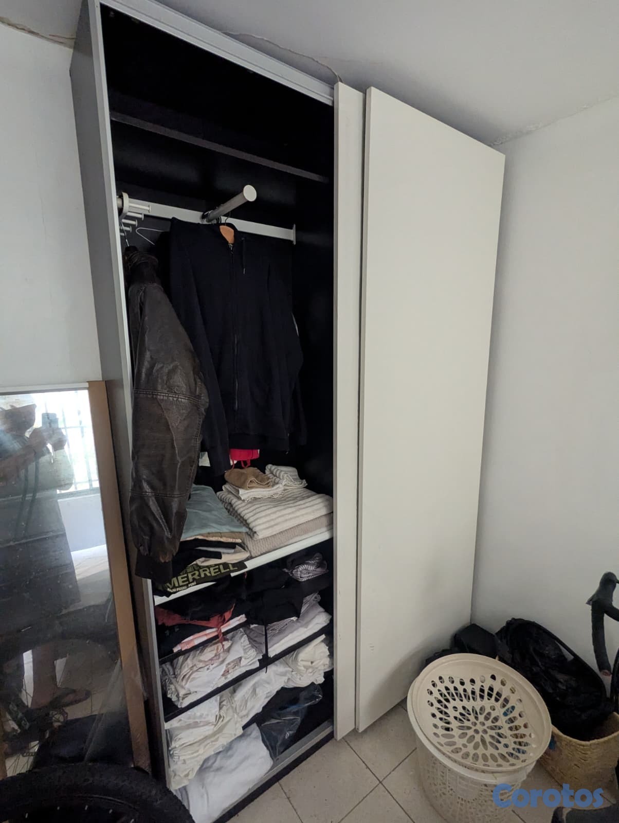 Closet funcional y espacioso. Una puerta necesita ajuste (está un poco desalineada), pero todo lo demás está en buen estado.