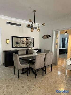 Comedor importado de Europa extendible hasta 10 espacios, con Seis sillas forradas en gris .