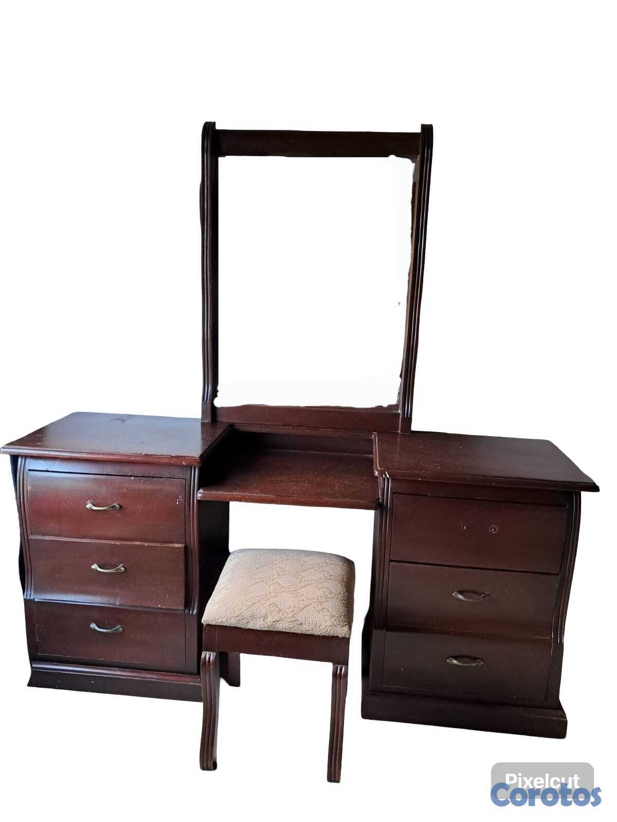 Hermosa coquetera de 6 gavetas, con su espejo y butaca. Perfecto para la habitación de una señorita que desea maquillarse y peinarse sentada en su habitación. Buen precio! es de caoba. Tendrías que darle una lijada para ponerlo más bonito, pero la madera lo vale!