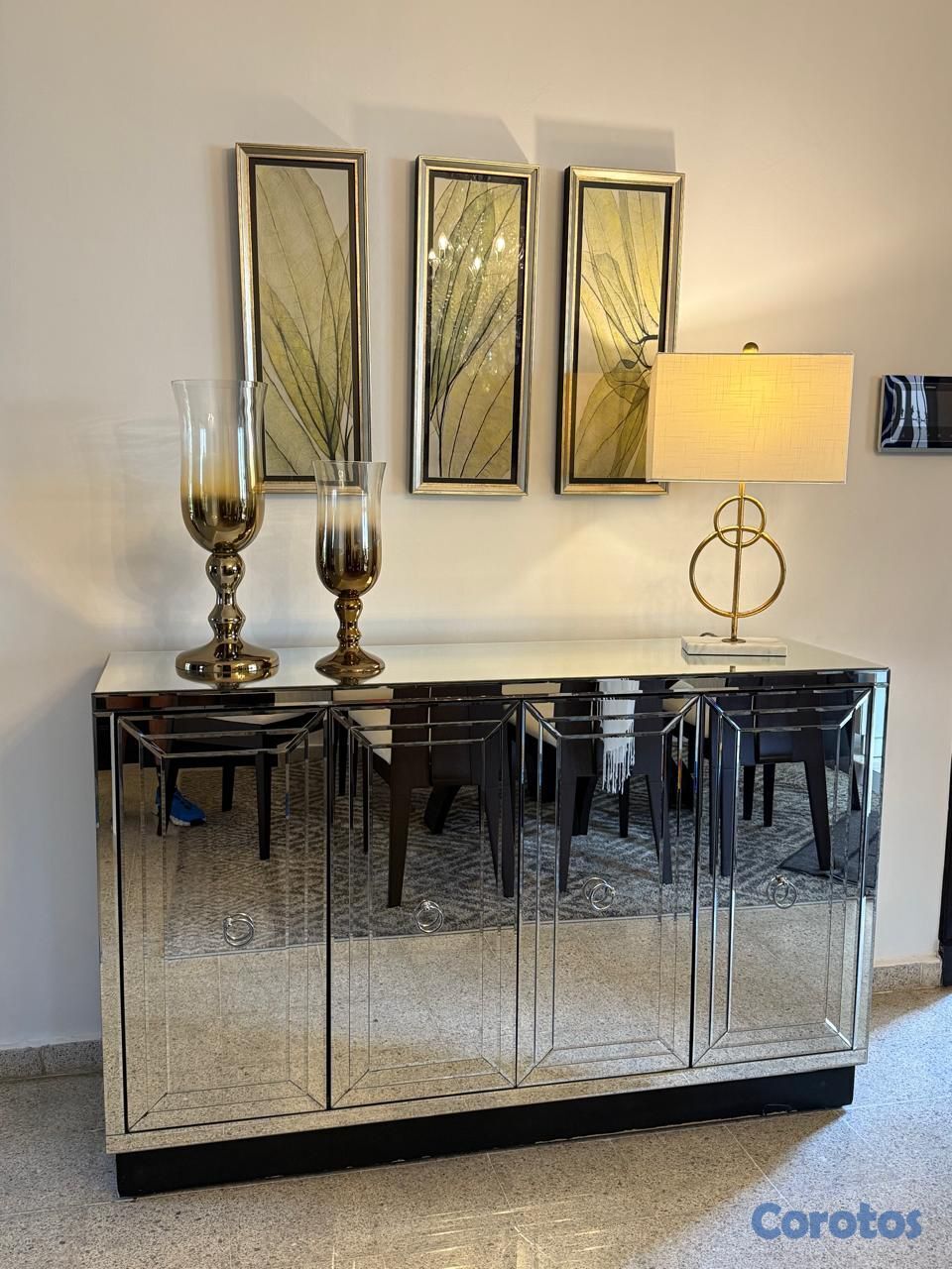 Hermosa credenza con diseño contemporáneo, elaborada en espejos con acabados finos que aportan amplitud y luminosidad a cualquier espacio. Ideal para comedor, sala o área de recibidor, perfecta para exhibir decoración, vajilla o como mueble auxiliar.