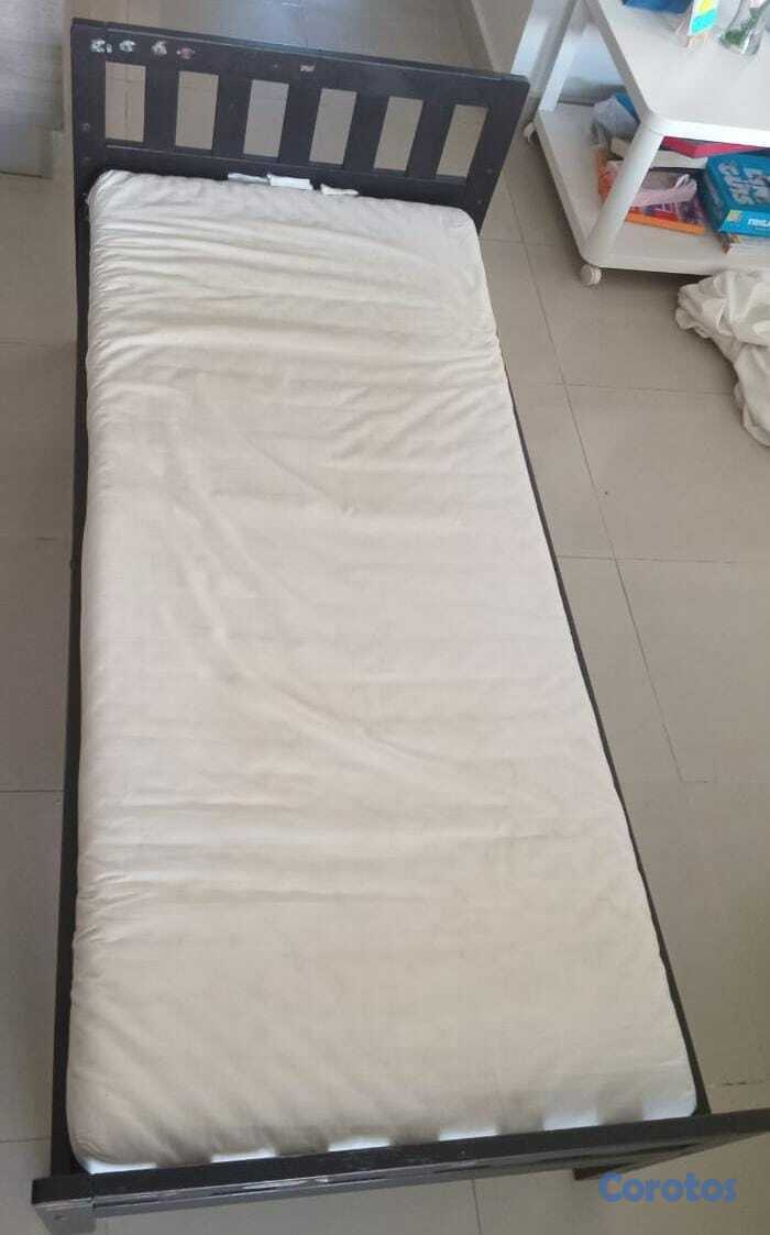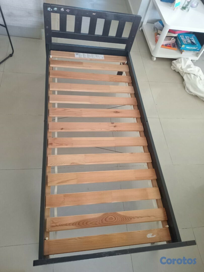 Base de pino tratado color marrón oscuro, ideal para niños. Colchón incluído con un forro removible que puedes entrar en la lavadora. Bastante cómodo y muy buenas condiciones. Ven para que te lo lleves.
