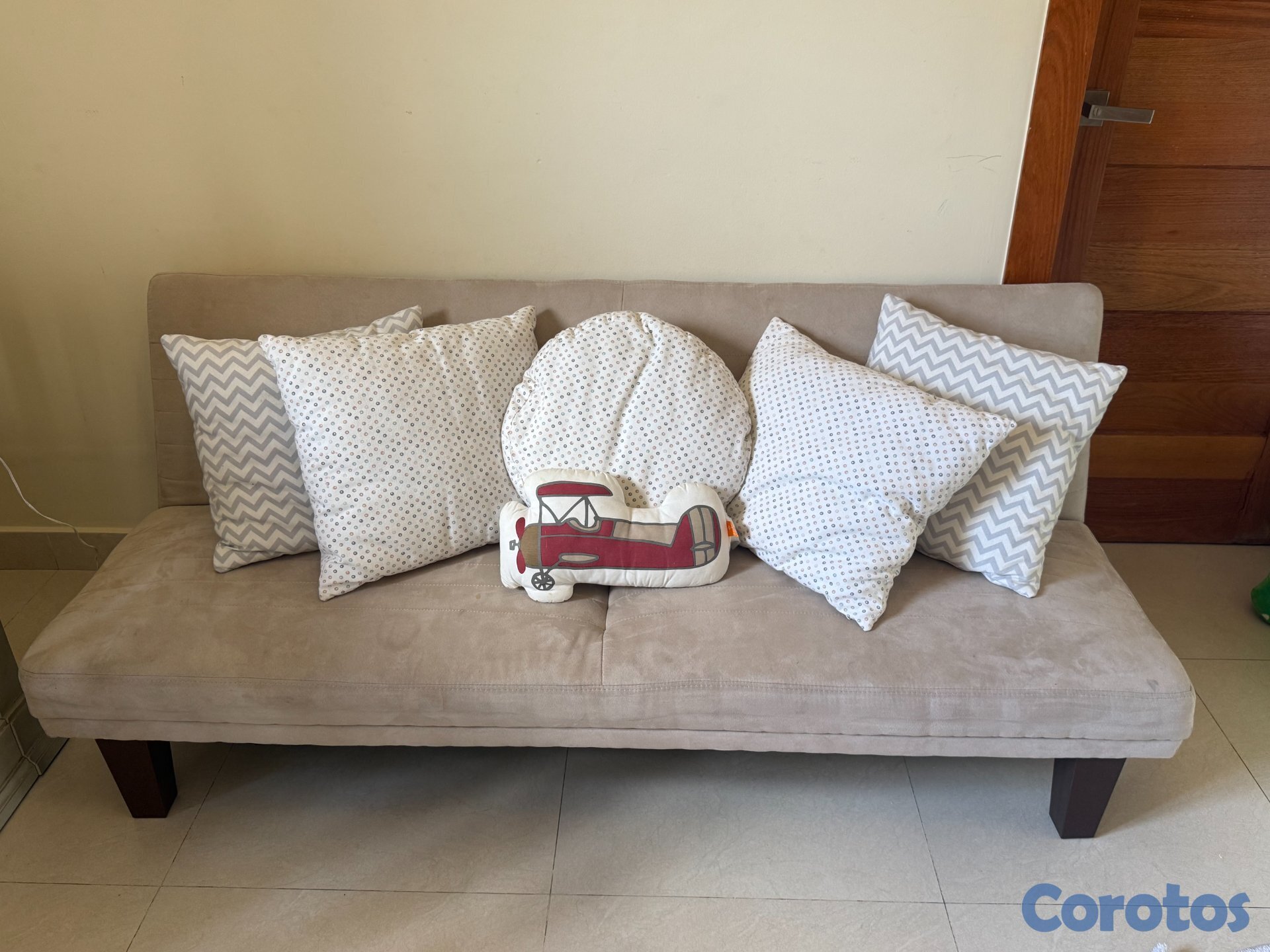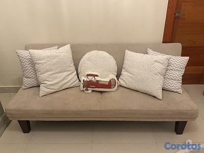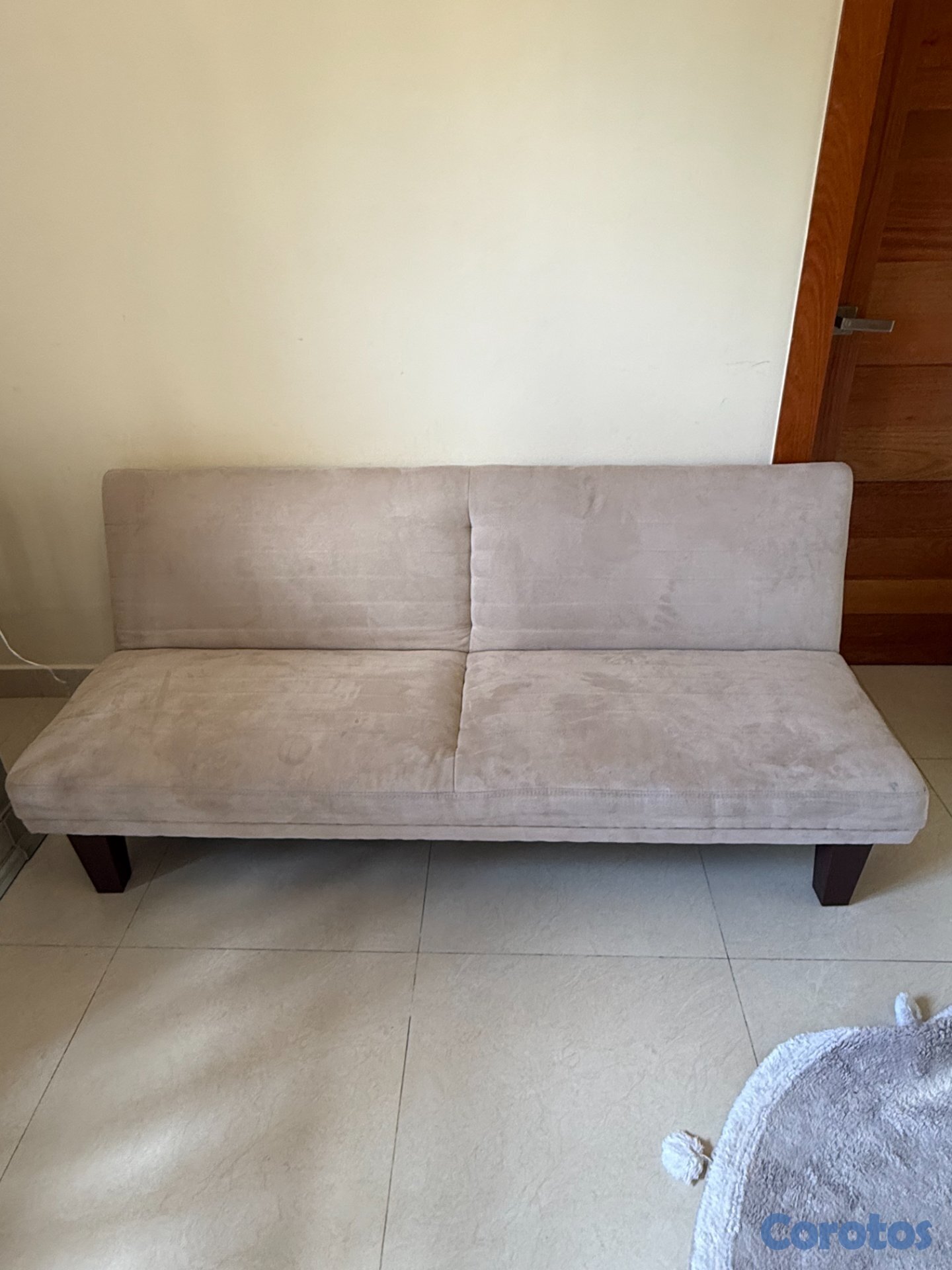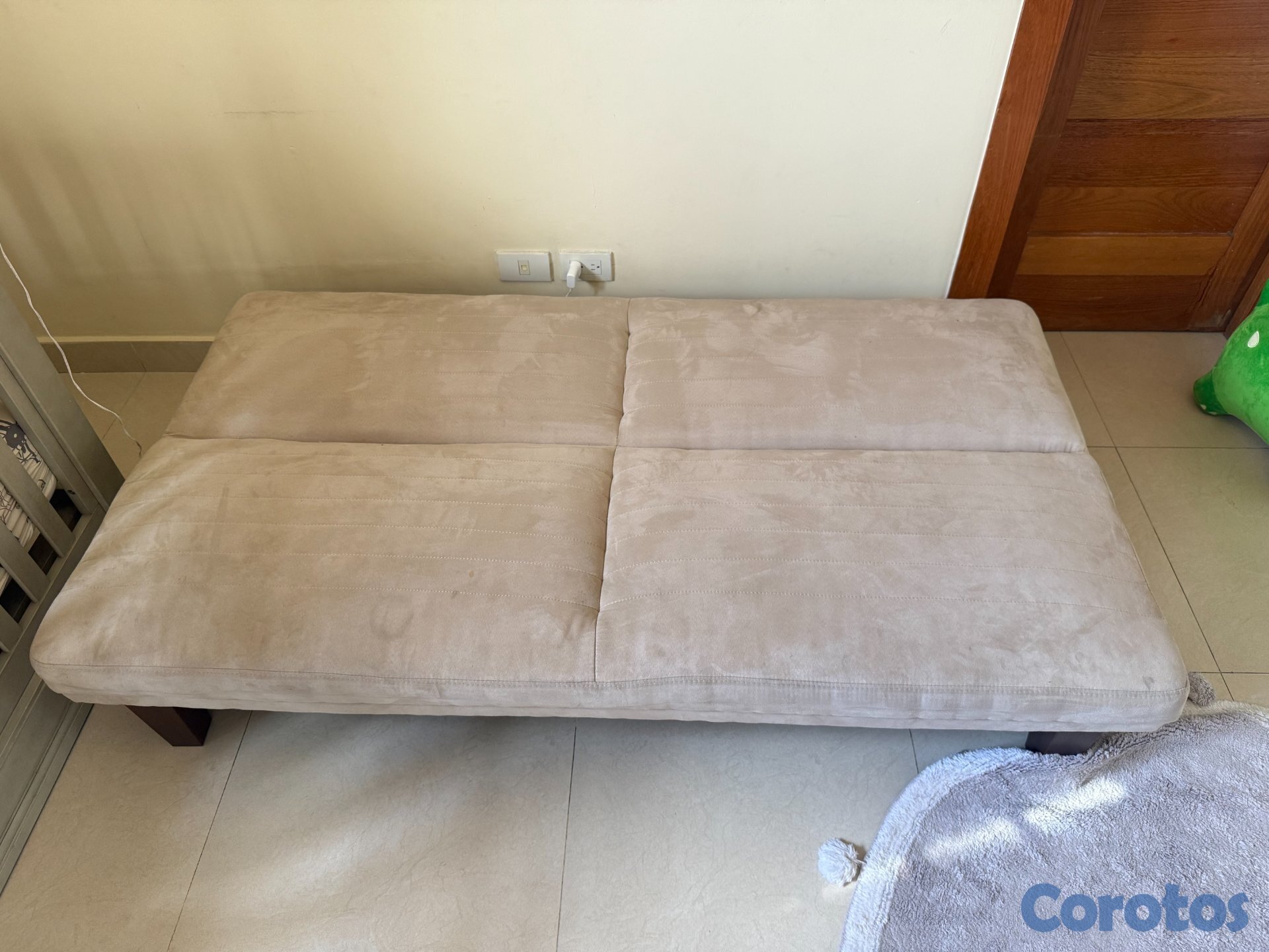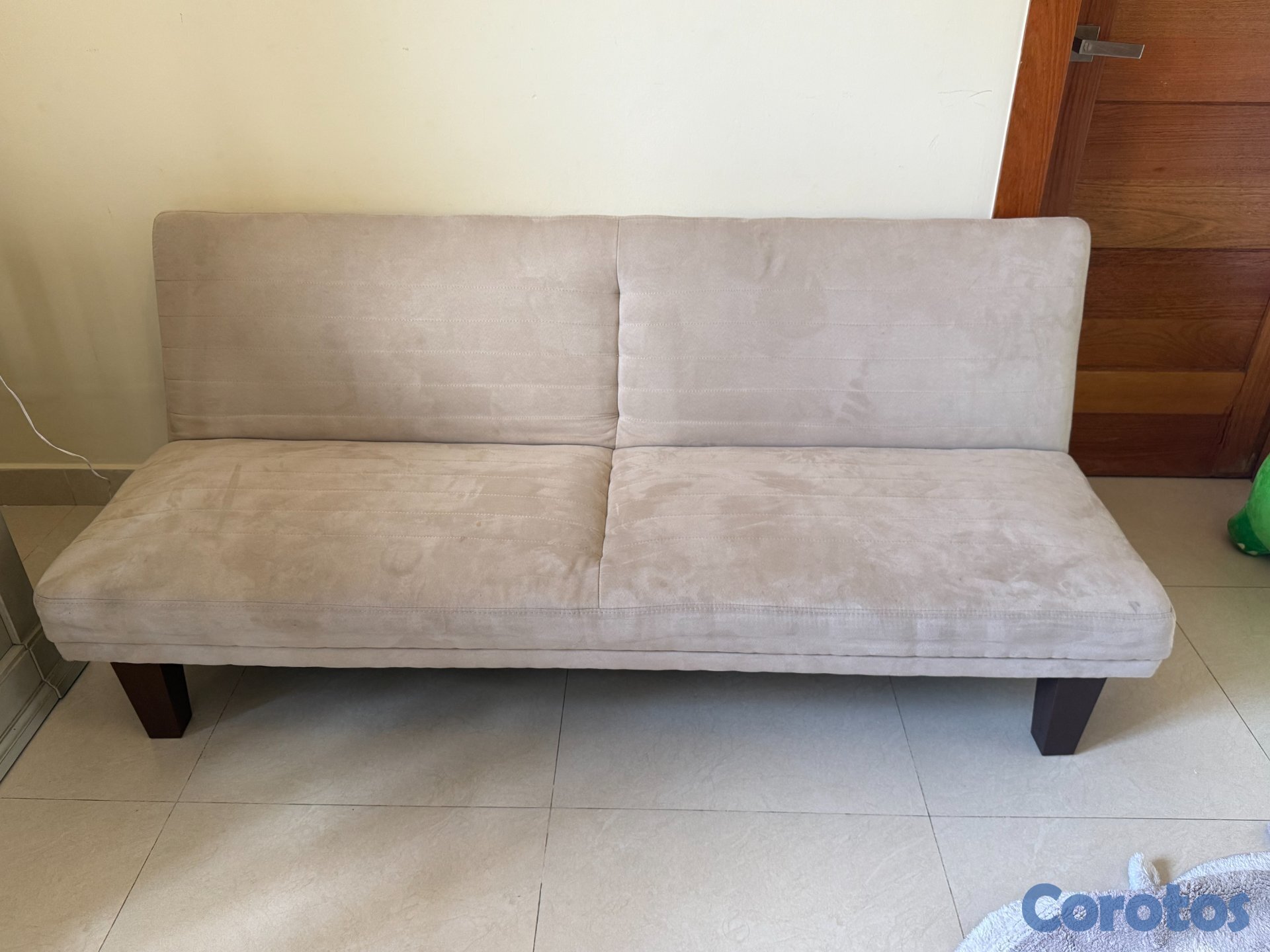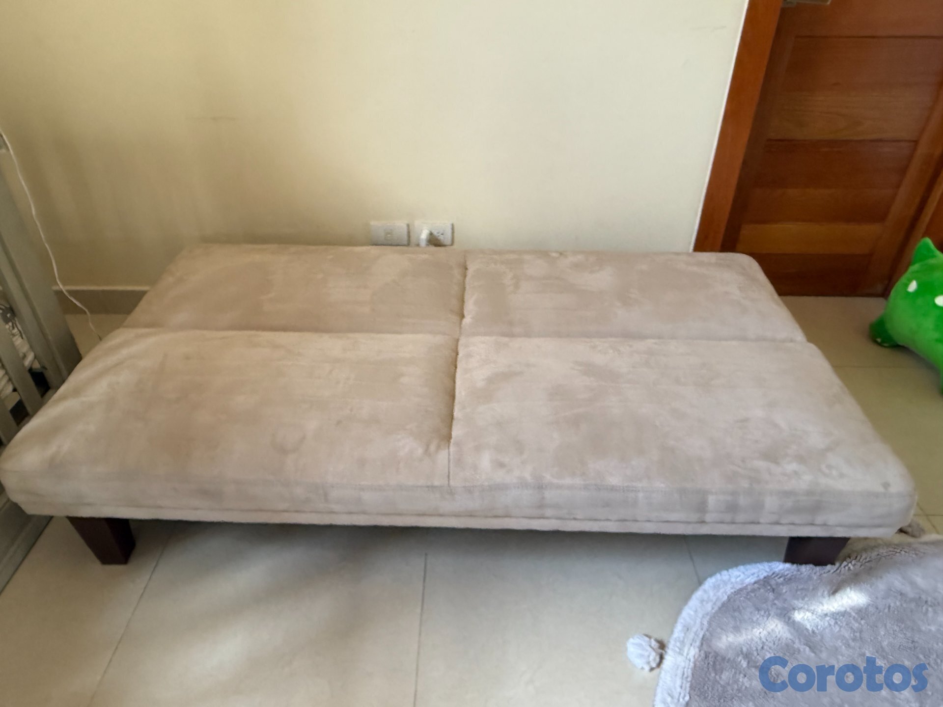 Mueble tipo futón color beige plegable para uso tipo sofa cama.