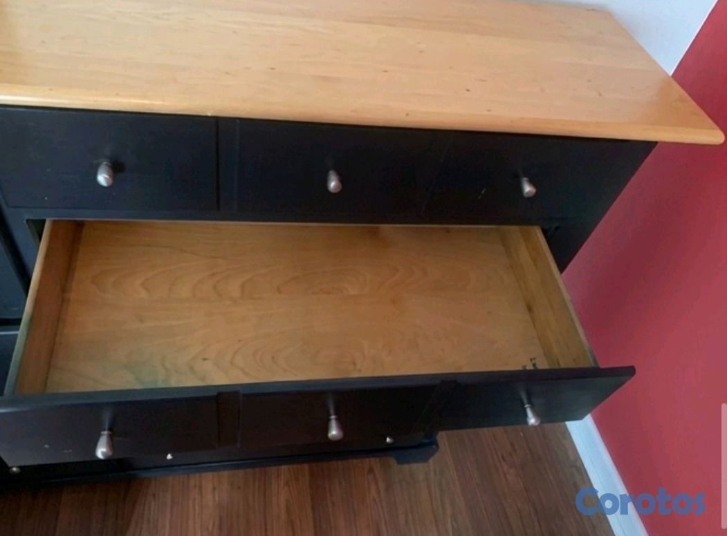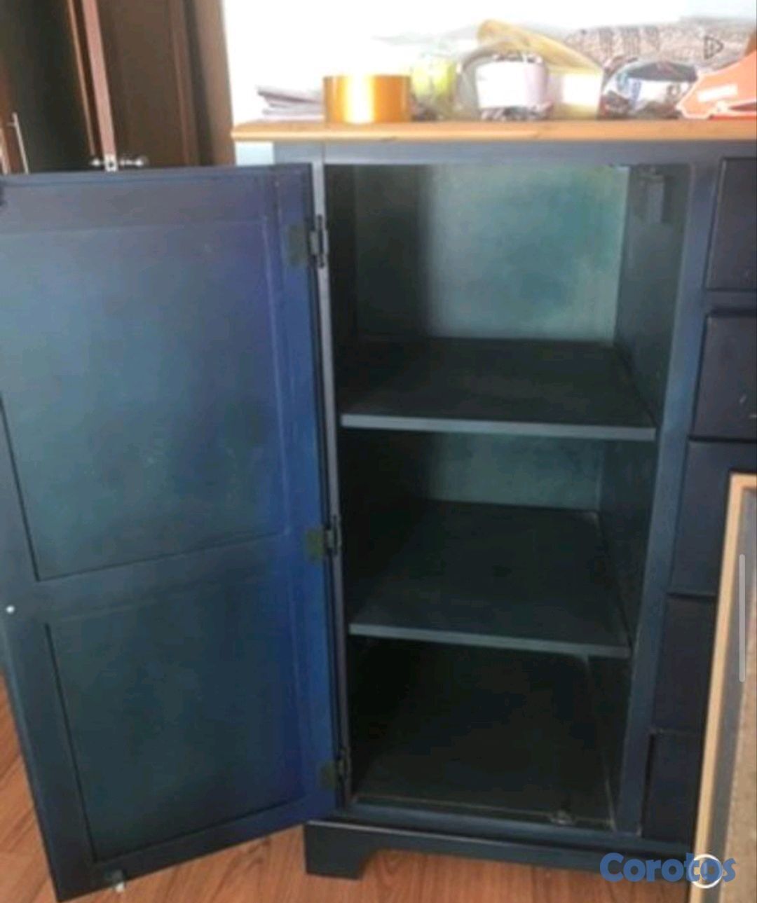 Mueble organizador tipo cómoda en color azul marino con tope de madera clara. Cuenta con una puerta lateral con tramos internos y múltiples gavetas del mismo tamaño. Es usado, pero se encuentra en muy buenas condiciones y es muy funcional para dormitorios o áreas de estudio.