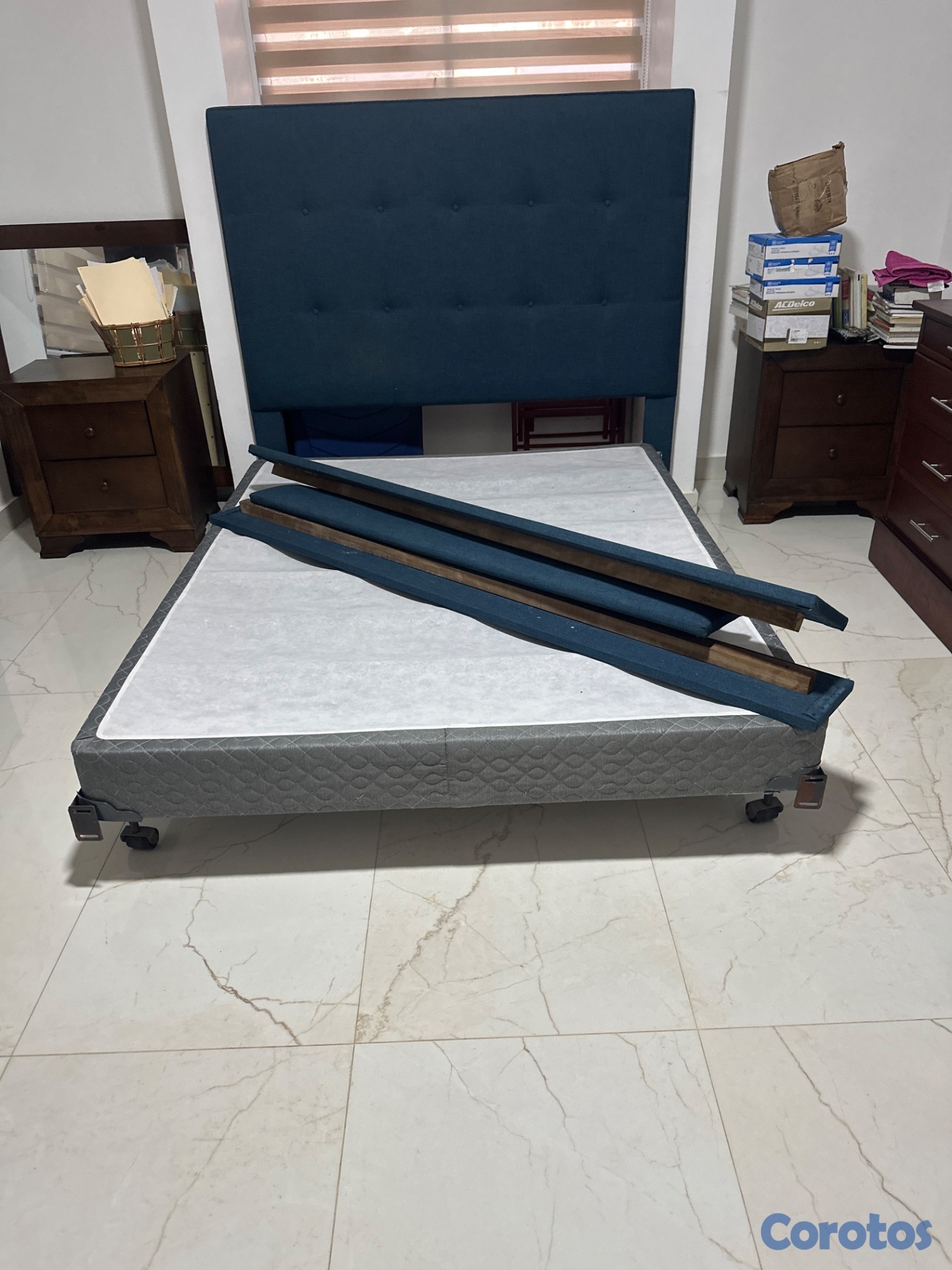 Cama queen igual a 60cm, en madera y recubierto de tela azul. Tiene su marco en metal y tú editas. Está como nueva por el poco uso.