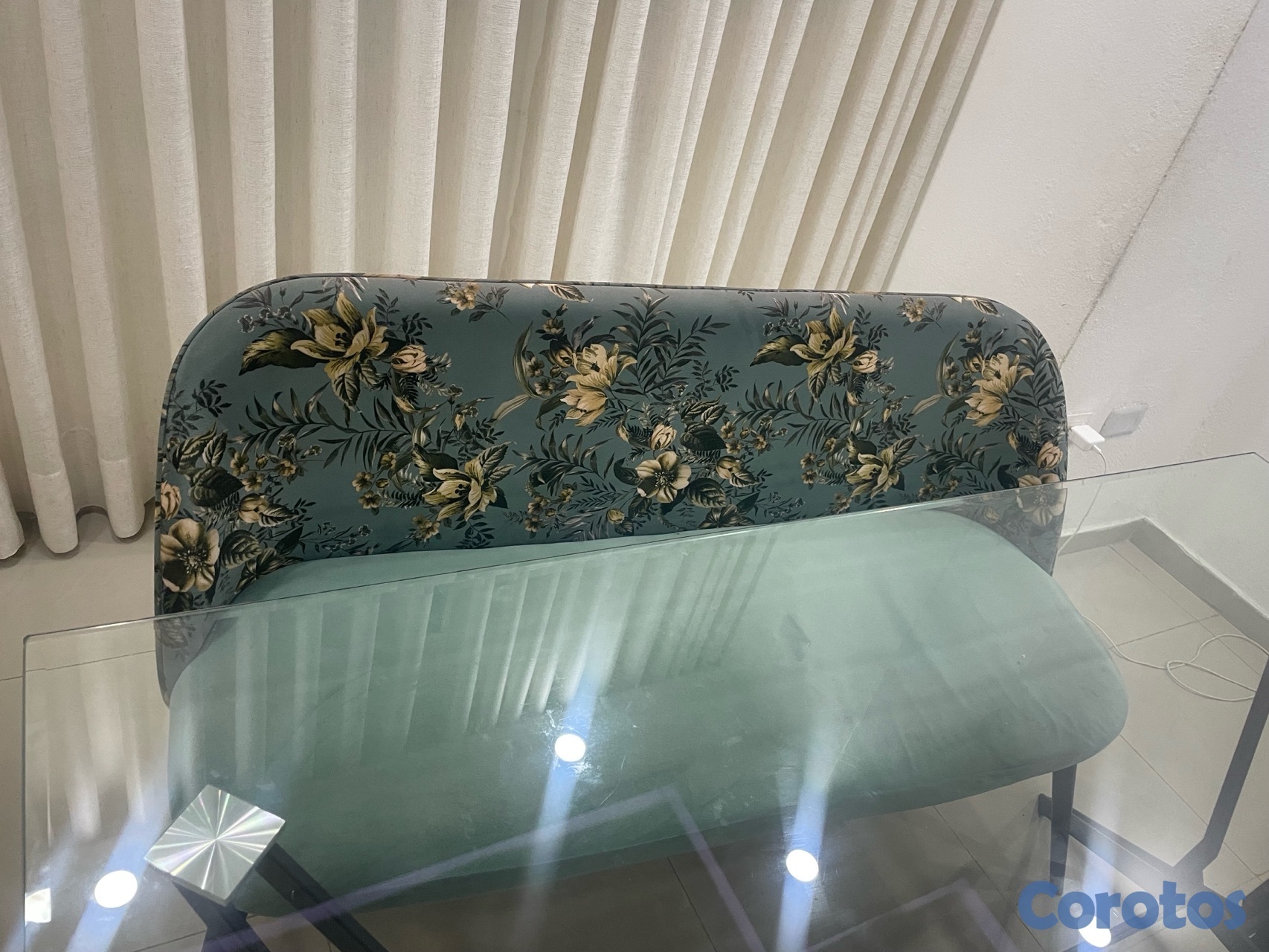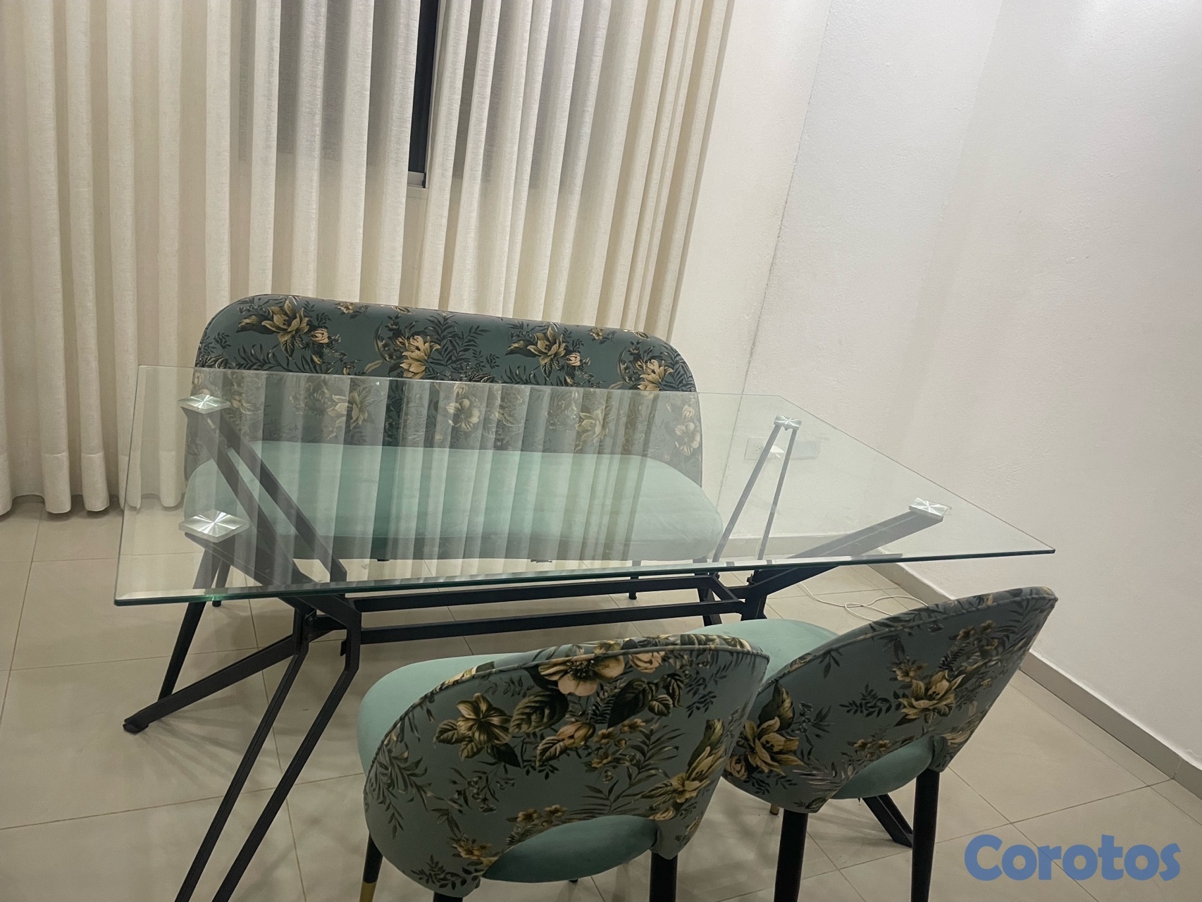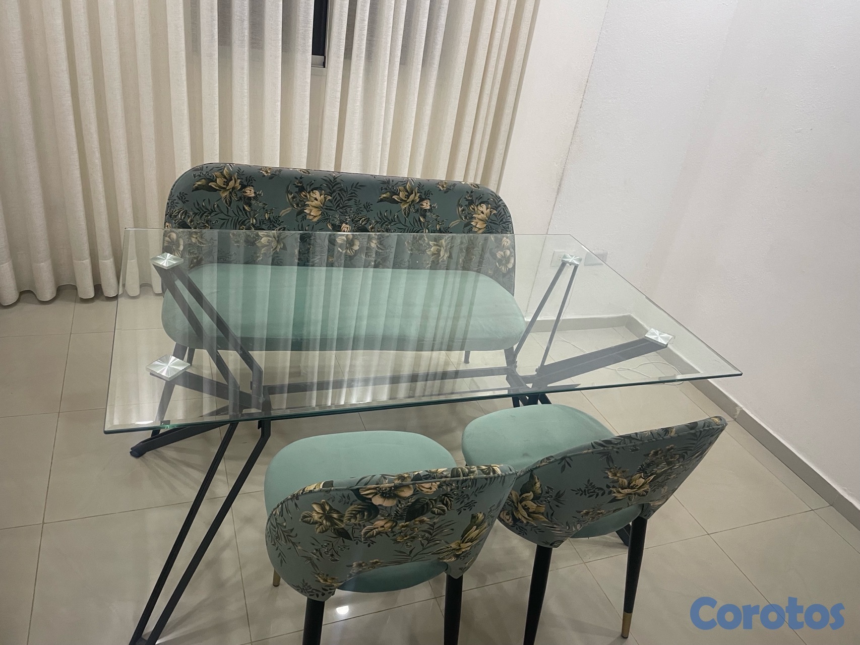 Comedor moderno de 4 sillas, mesa de vidrio templado y sillas tapizadas. Excelente estado. Muy bien cuidado, ideal para apartamentos.