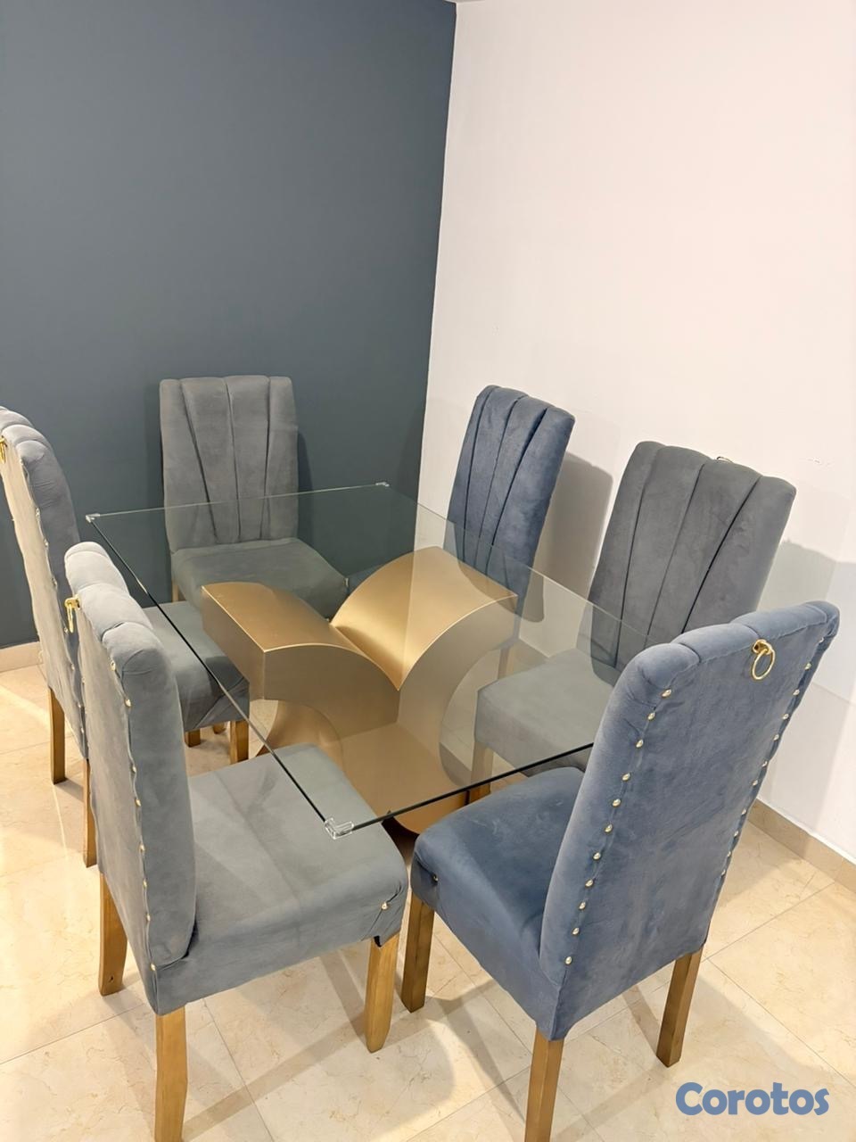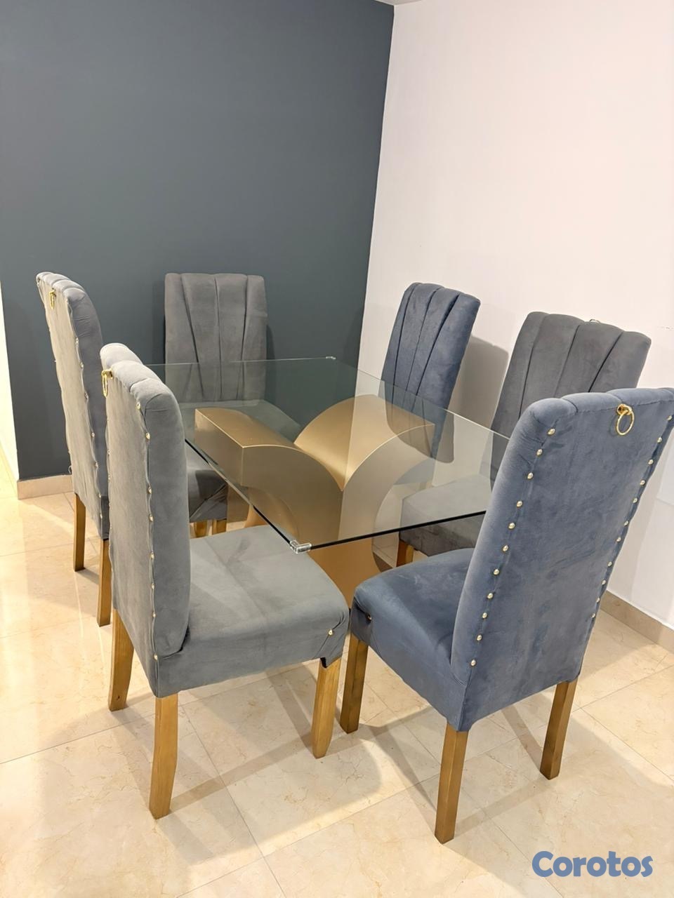 Es un comedor de 6 sillas gris está nuevo solo tiene 8 meses que lo compre lo vendo porque quiero uno de 4 sillas
