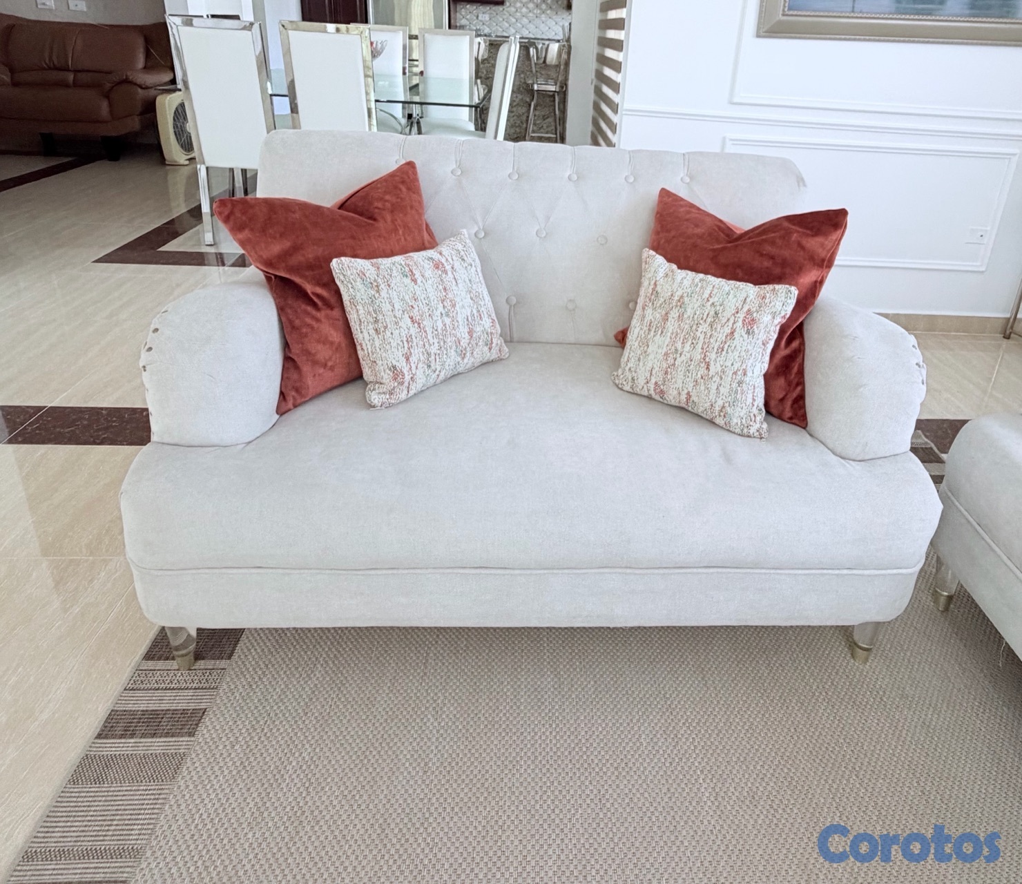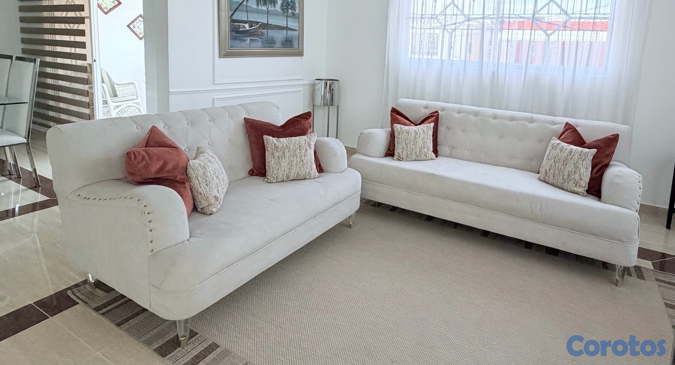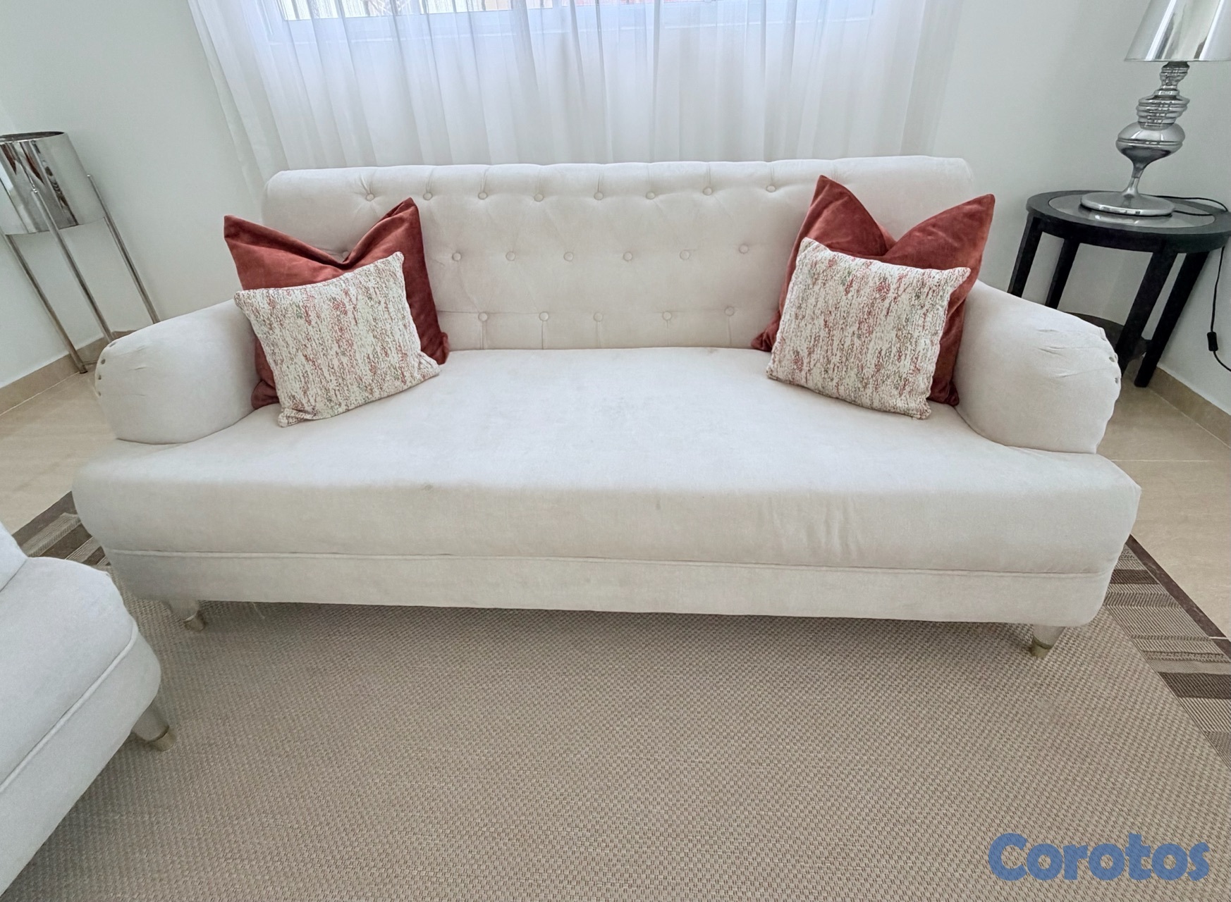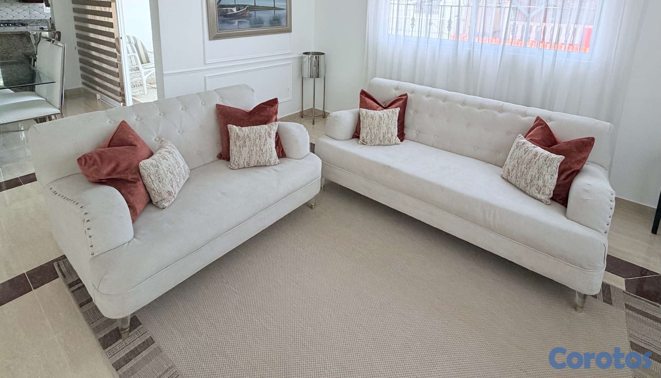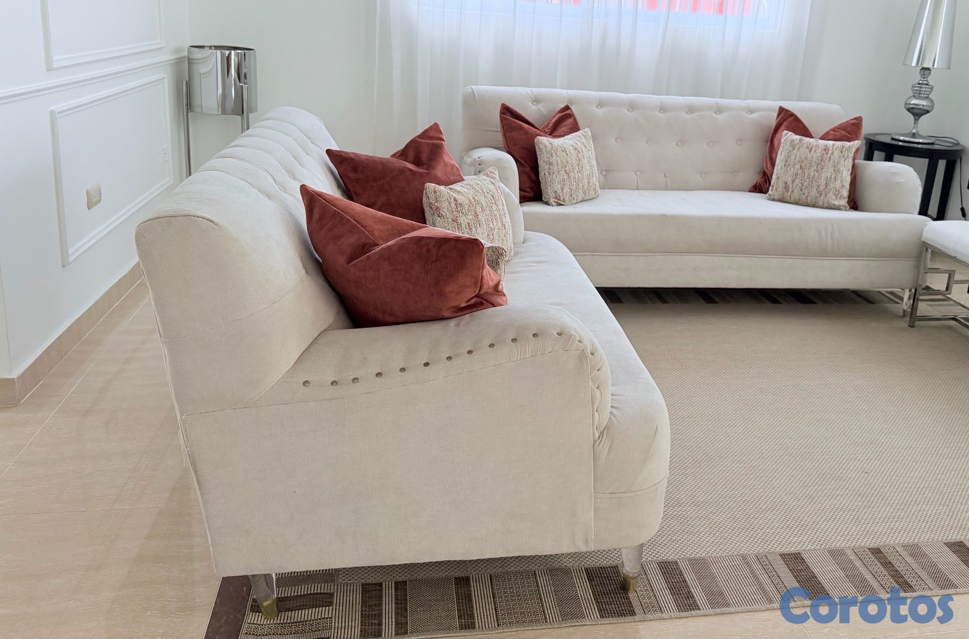juego de muebles de tres y dos plaza en muy buenas condiciones color beige con pata de en acrílico