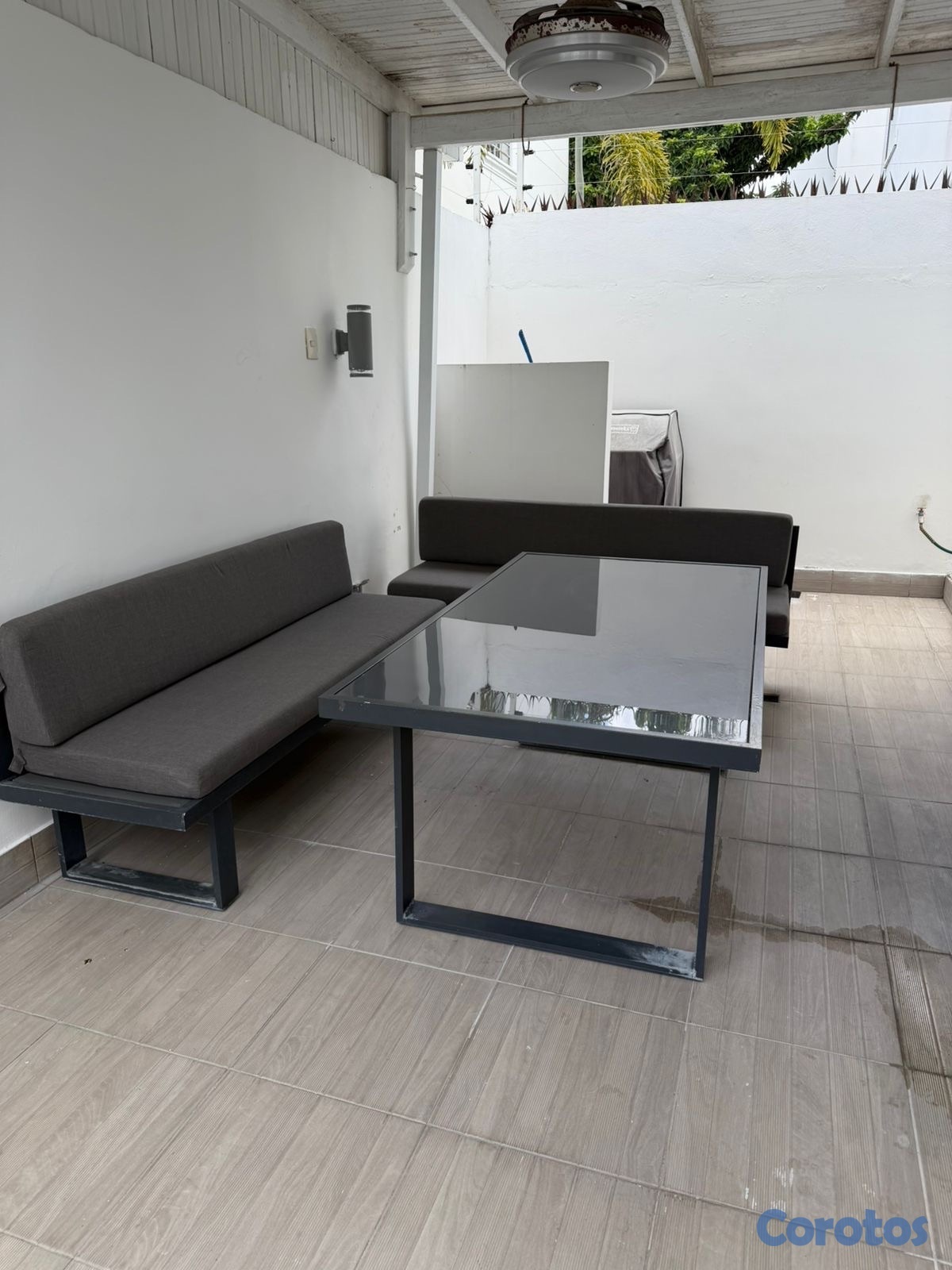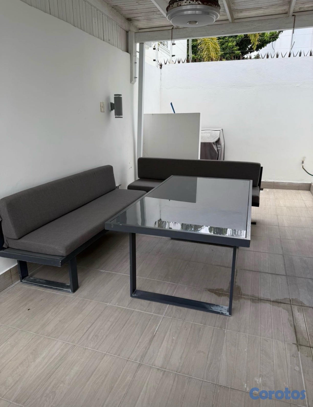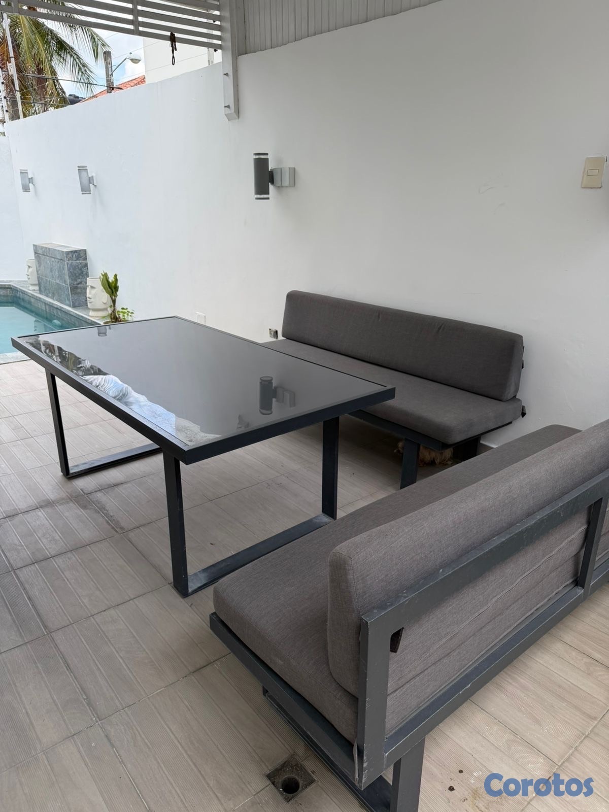 Vendo mesa el aluminio con cristal color gris con 2 bancos y sus cojines.