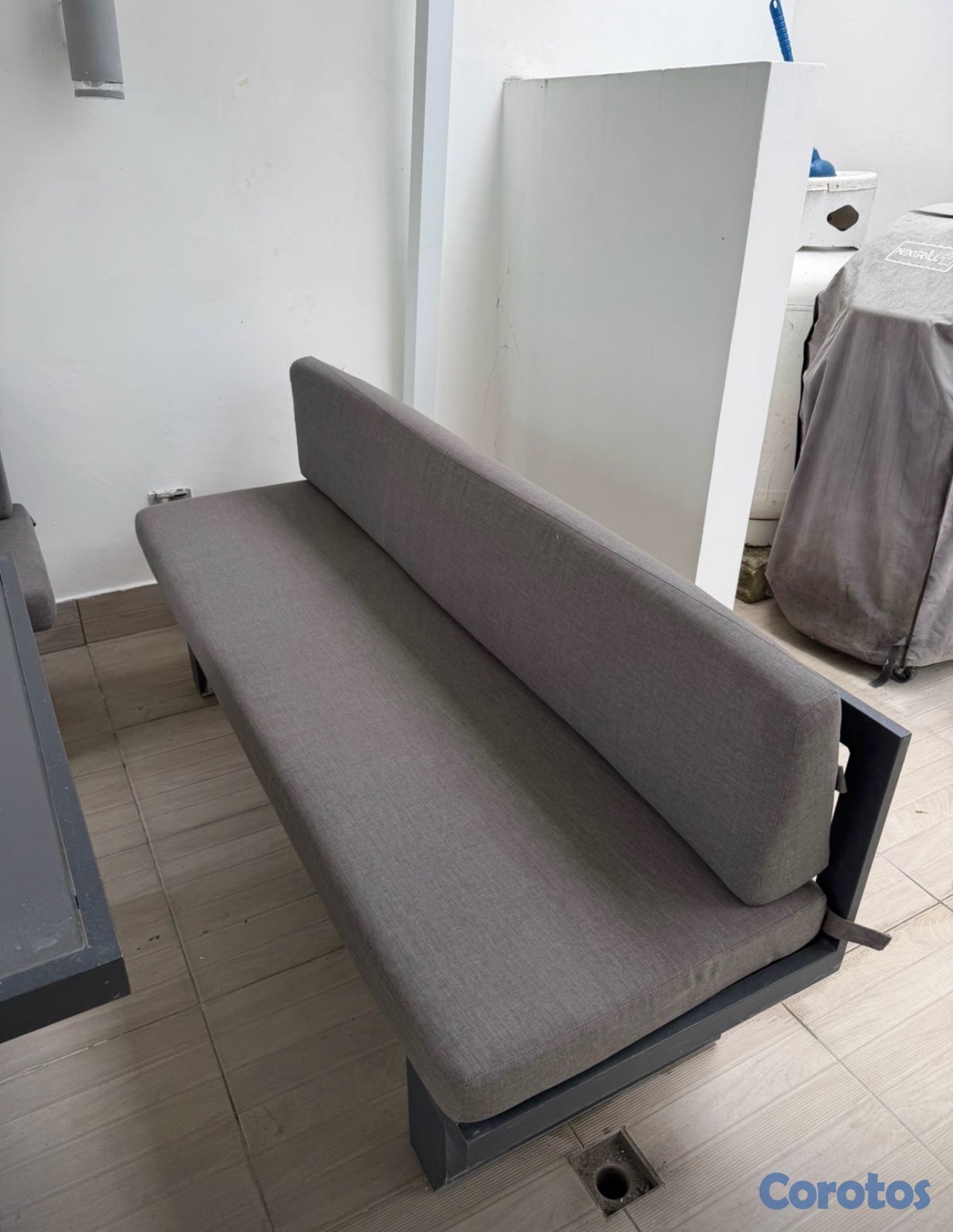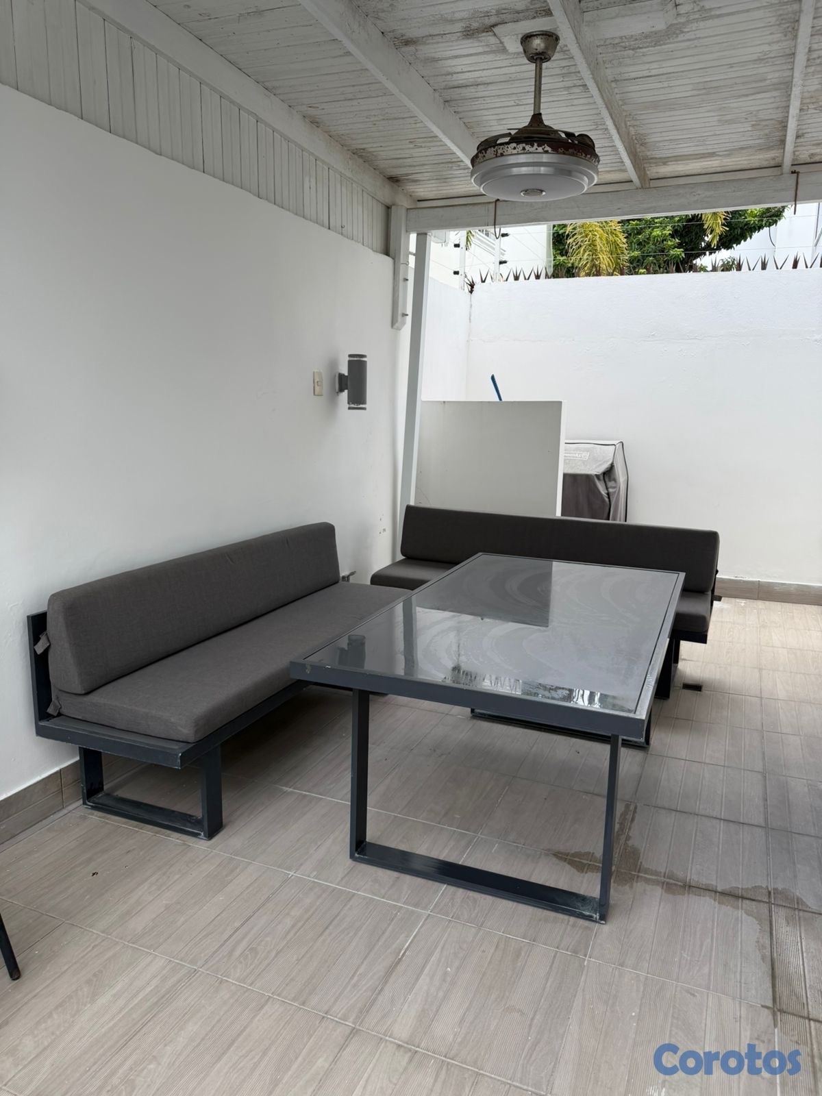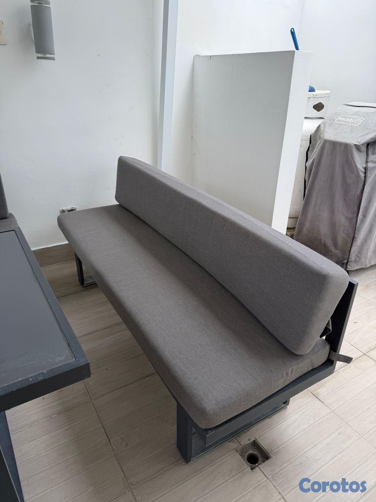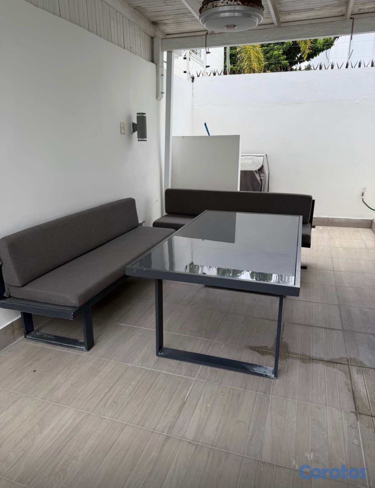 Vendo mesa el aluminio con cristal color gris con 2 bancos y sus cojines.