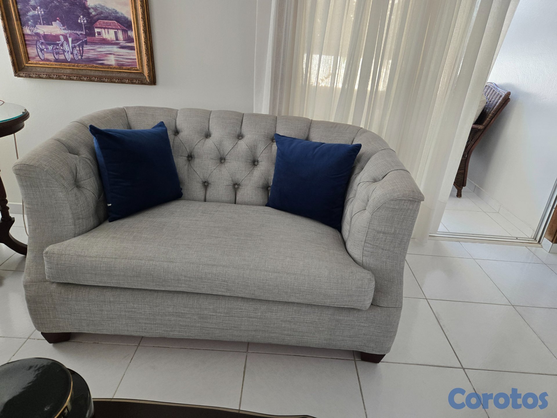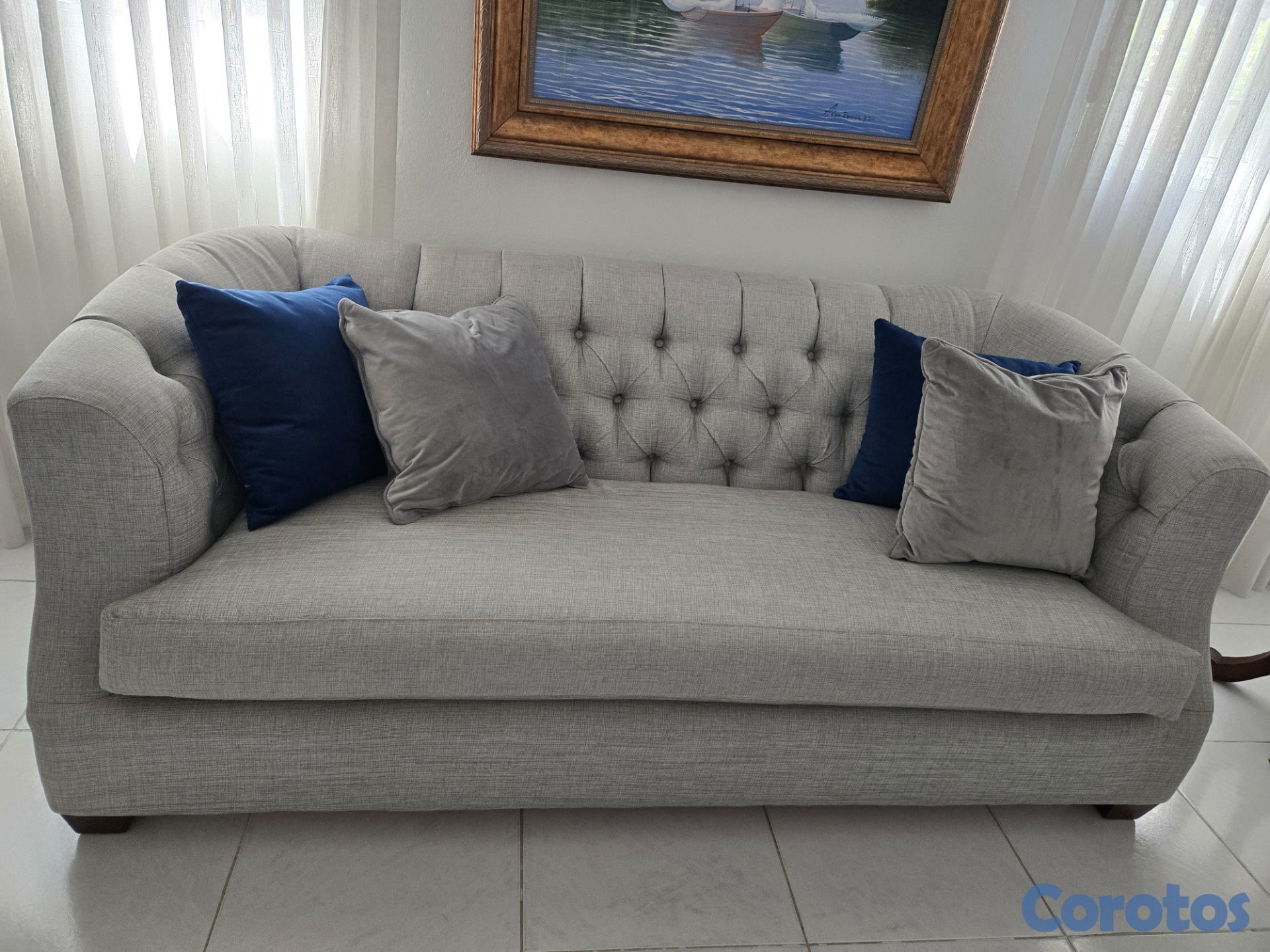 Juego muebles 3+2, madera caoba tapizado con botones, color gris