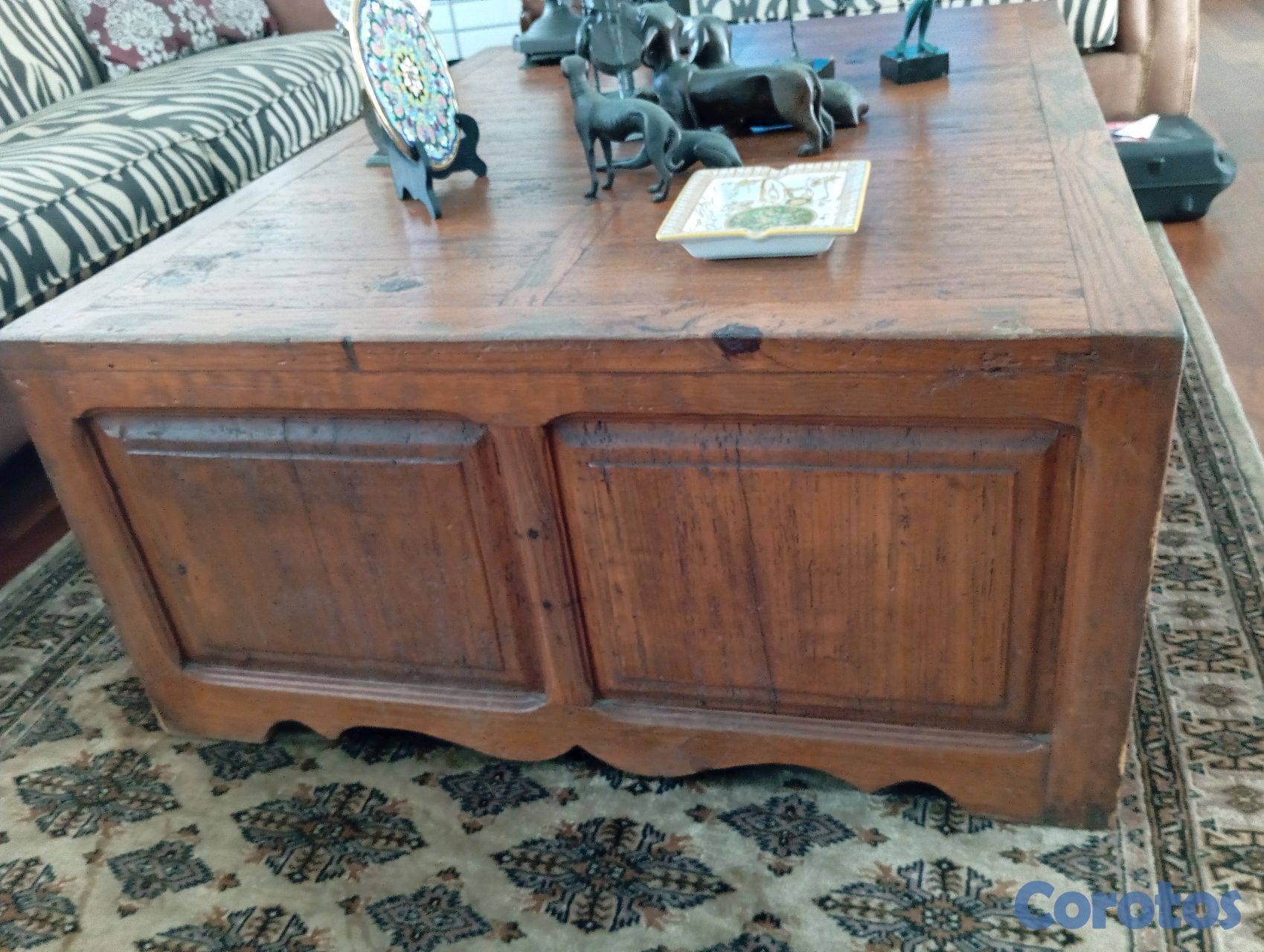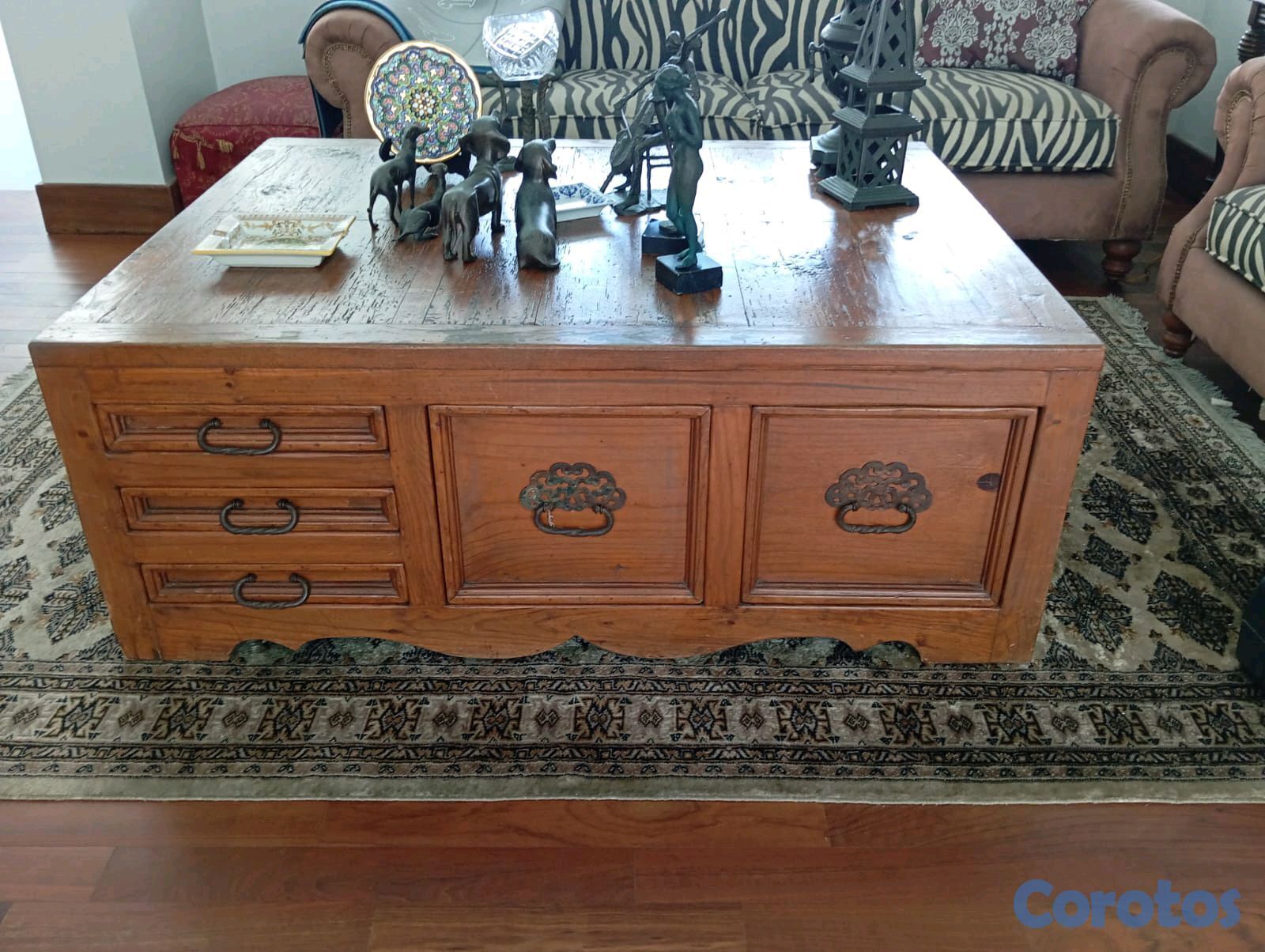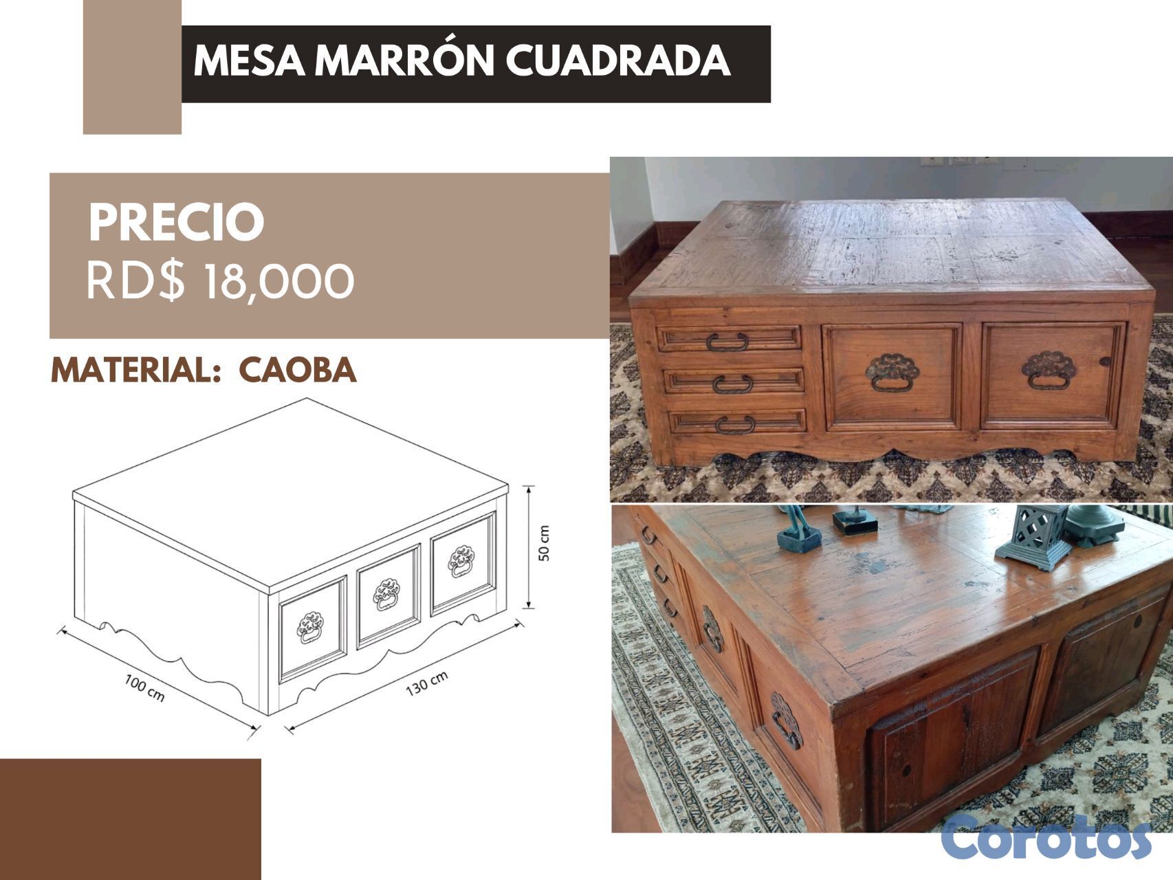 Sólida y elegante mesa cuadrada de madera en tono marrón oscuro. Su diseño robusto y funcional la hace perfecta como centro de mesa para salas amplias o áreas sociales, ofreciendo una superficie amplia y duradera.