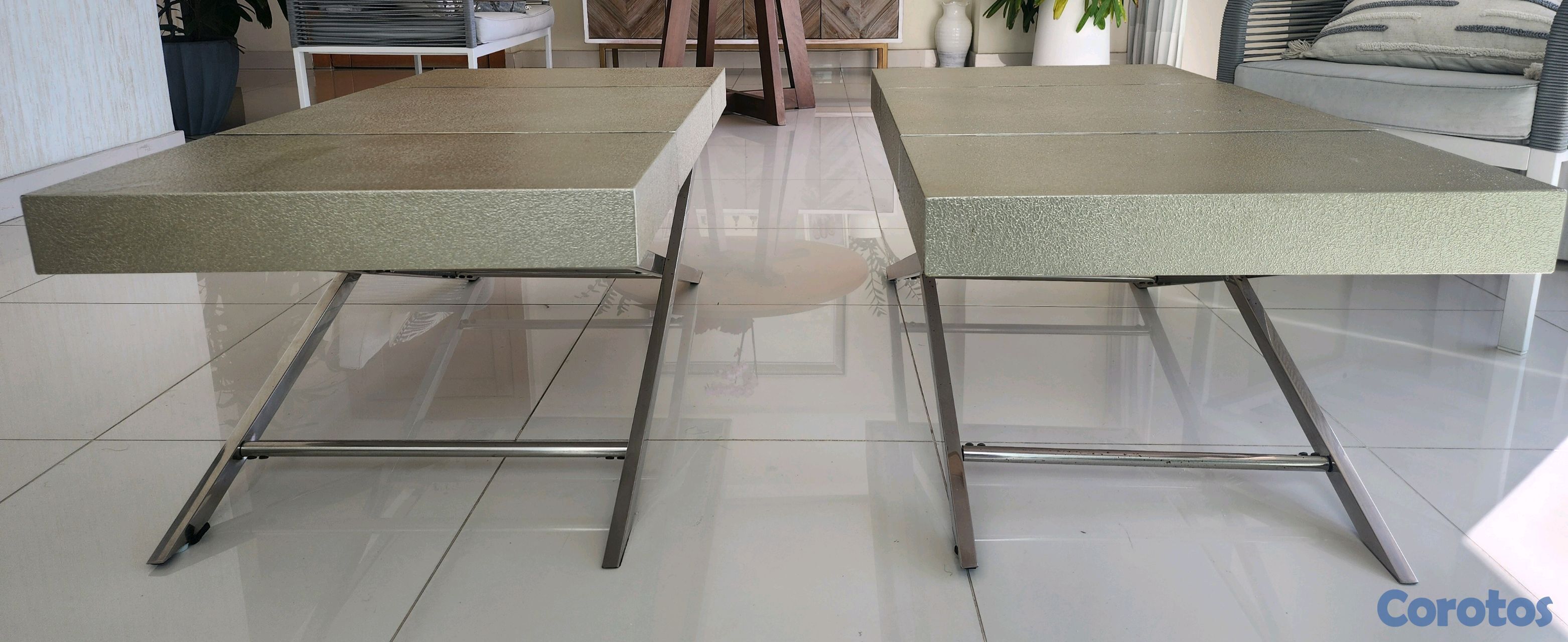 2 mesas que juntas se hacen una mesa cuadrada grande.